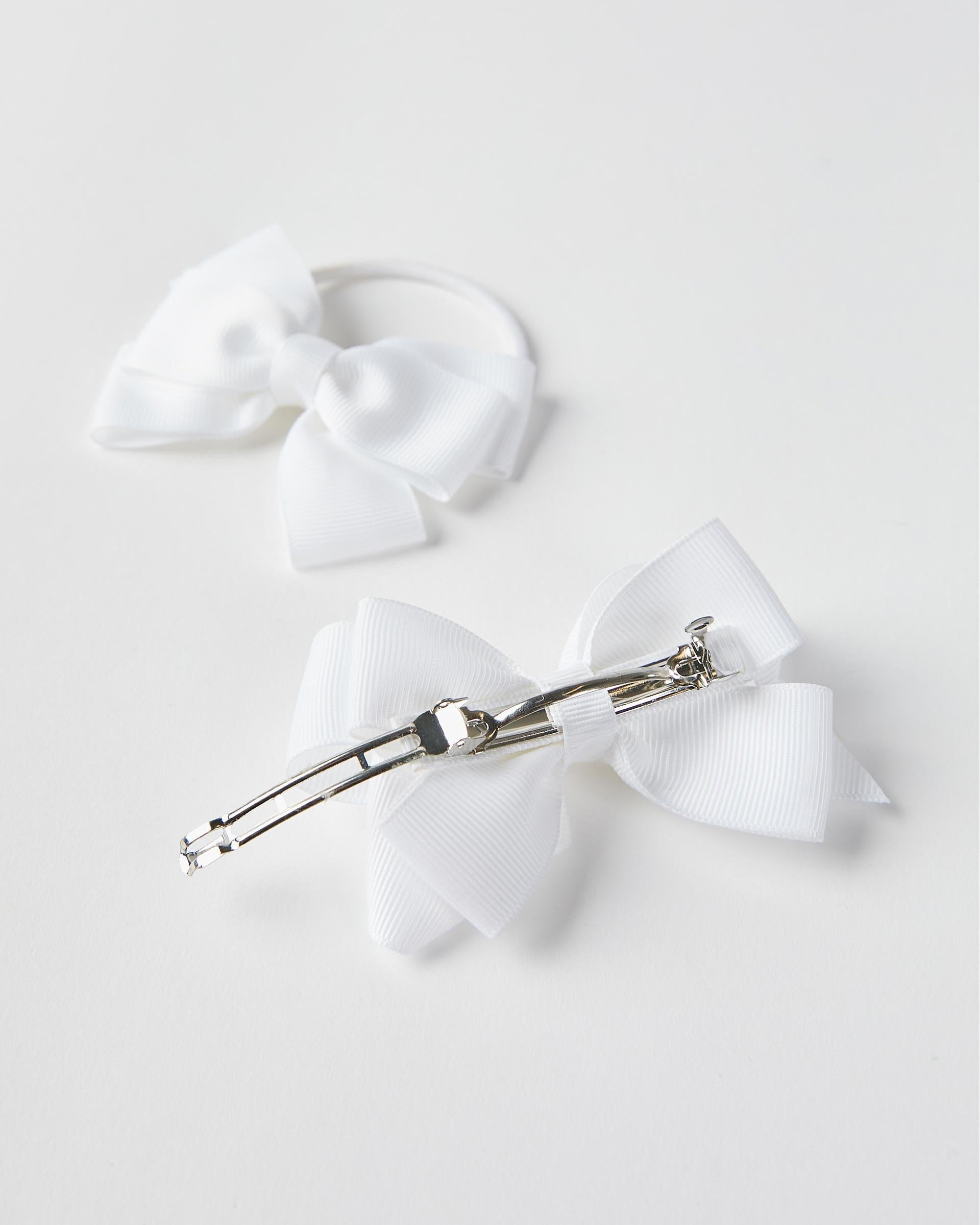 Set of two white hair accessories for babies and girls. Includes an hair slide and a bobble, both with a bow application.