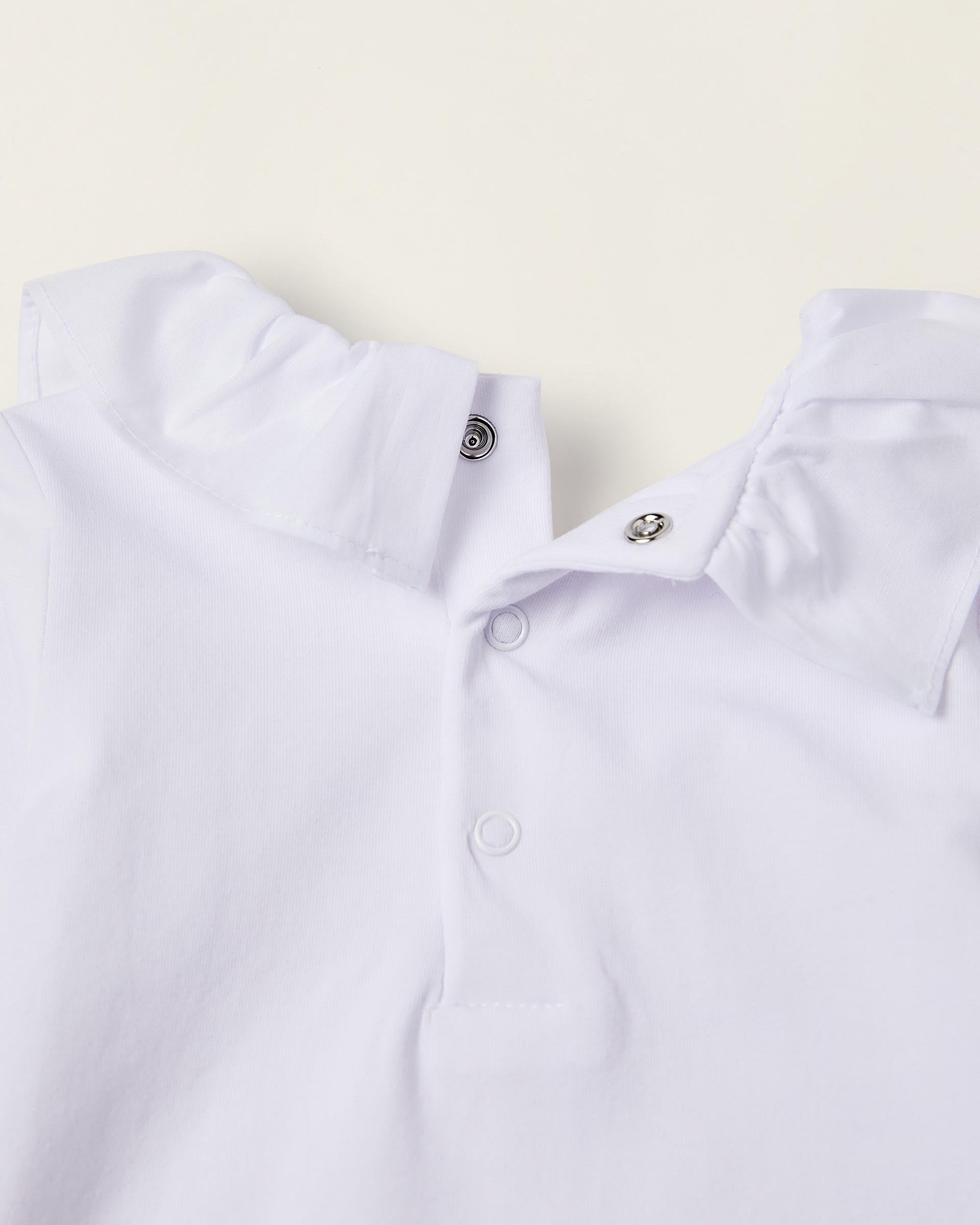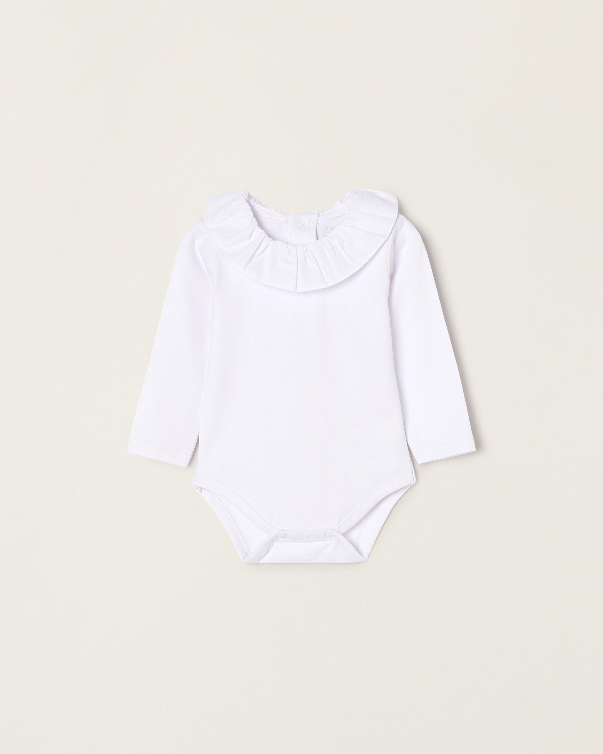 Long-sleeved bodysuit for newborn girls, with ruffled collar. Made of cotton with a touch of stretch for greater comfort and freedom of movement. Fastens at the back and crotch with snap buttons to make dressing and diaper changing easier. A comfortable, practical and loving bodysuit.