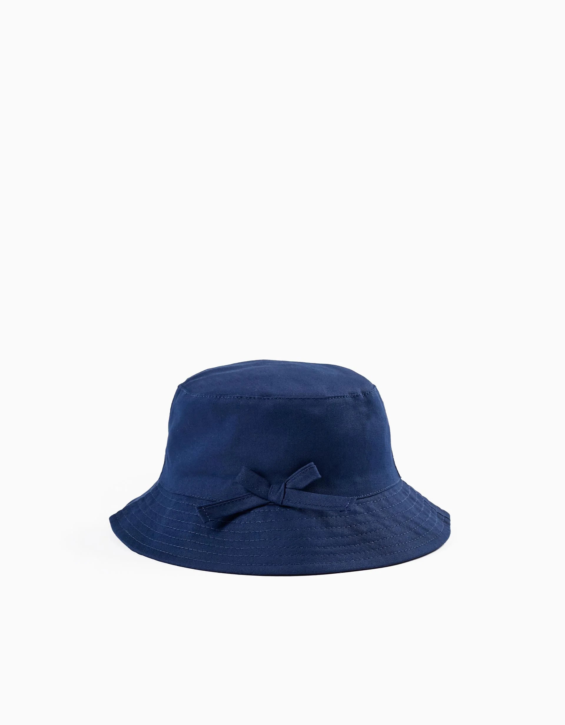 Dark blue hat for girls, in 100% cotton twill. Decorative bow and lining for greater comfort. Side straps with touch-fastener strap for sizes from 12 months to 24 months. An essential accessory for protecting your child's sensitive skin on sunny days.
