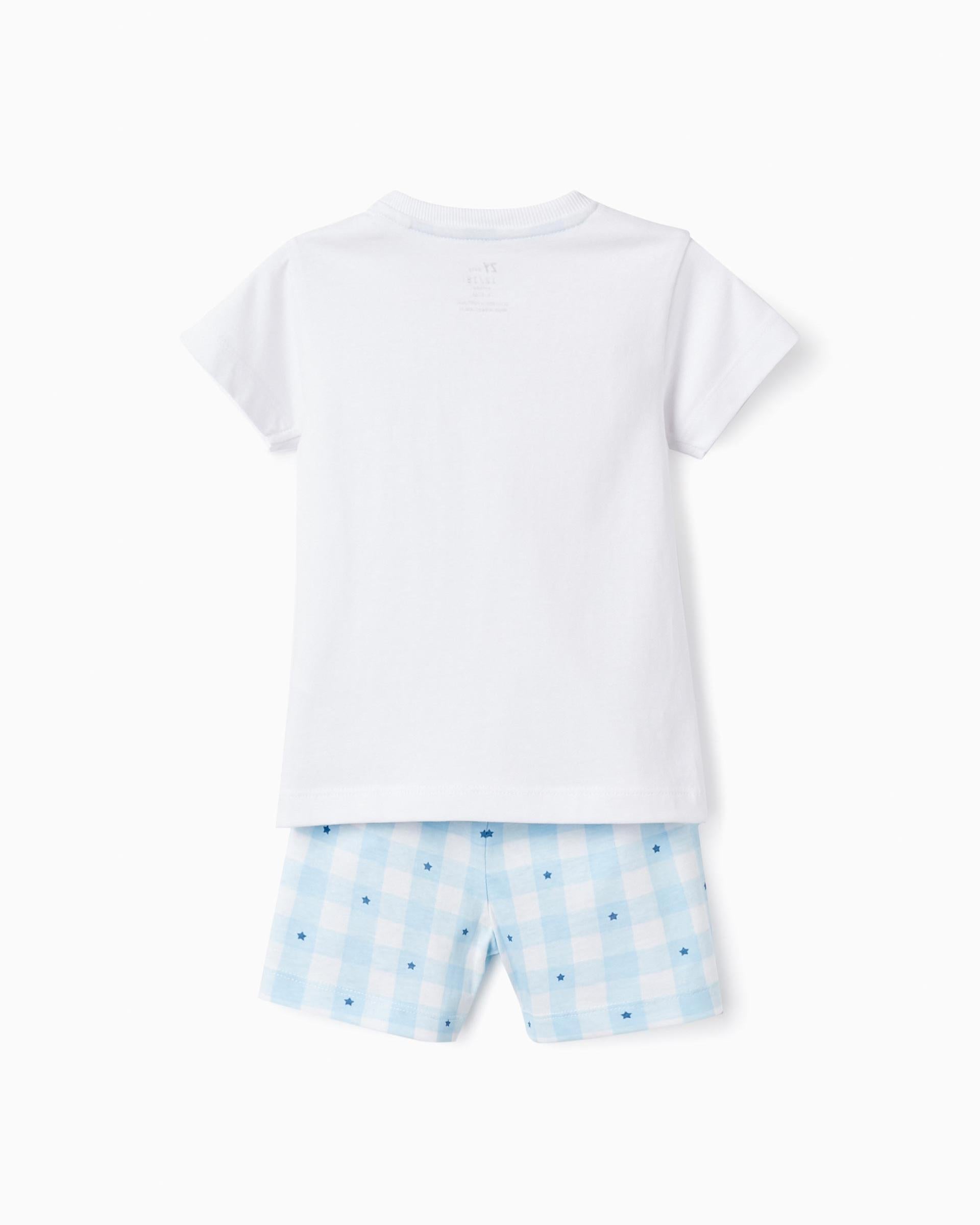 Pyjamas for baby boys in 100% cotton. It includes a white short-sleeved t-shirt with a small front pocket with a white and light blue checkered pattern with dark blue stars. With snap buttons on the shoulders for easy dressing. It also includes white and light blue checkered shorts with an elastic waistband and star pattern. Printed inner labels to avoid irritating the skin. A comfortable, lovely, and lightweight pyjama, perfect for hot days.