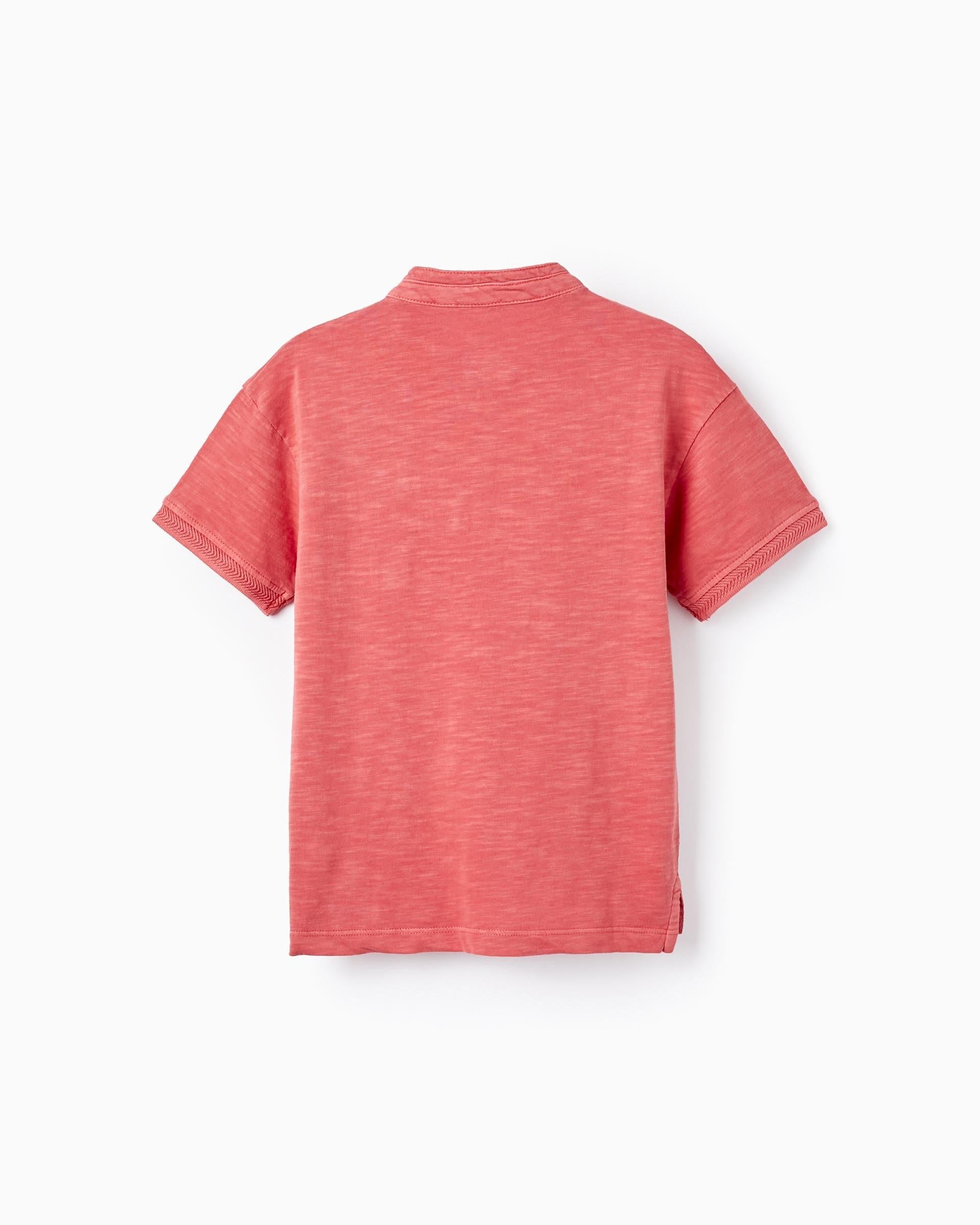 Red short-sleeved polo-style T-shirt for boys, made of 100% cotton. Pocket on the chest with a special finish, same as the sleeves. Slightly asymmetrical base, slightly longer at the back. Printed inner label to not irritate the skin. Garment dyed. A perfect option for everyday wear.