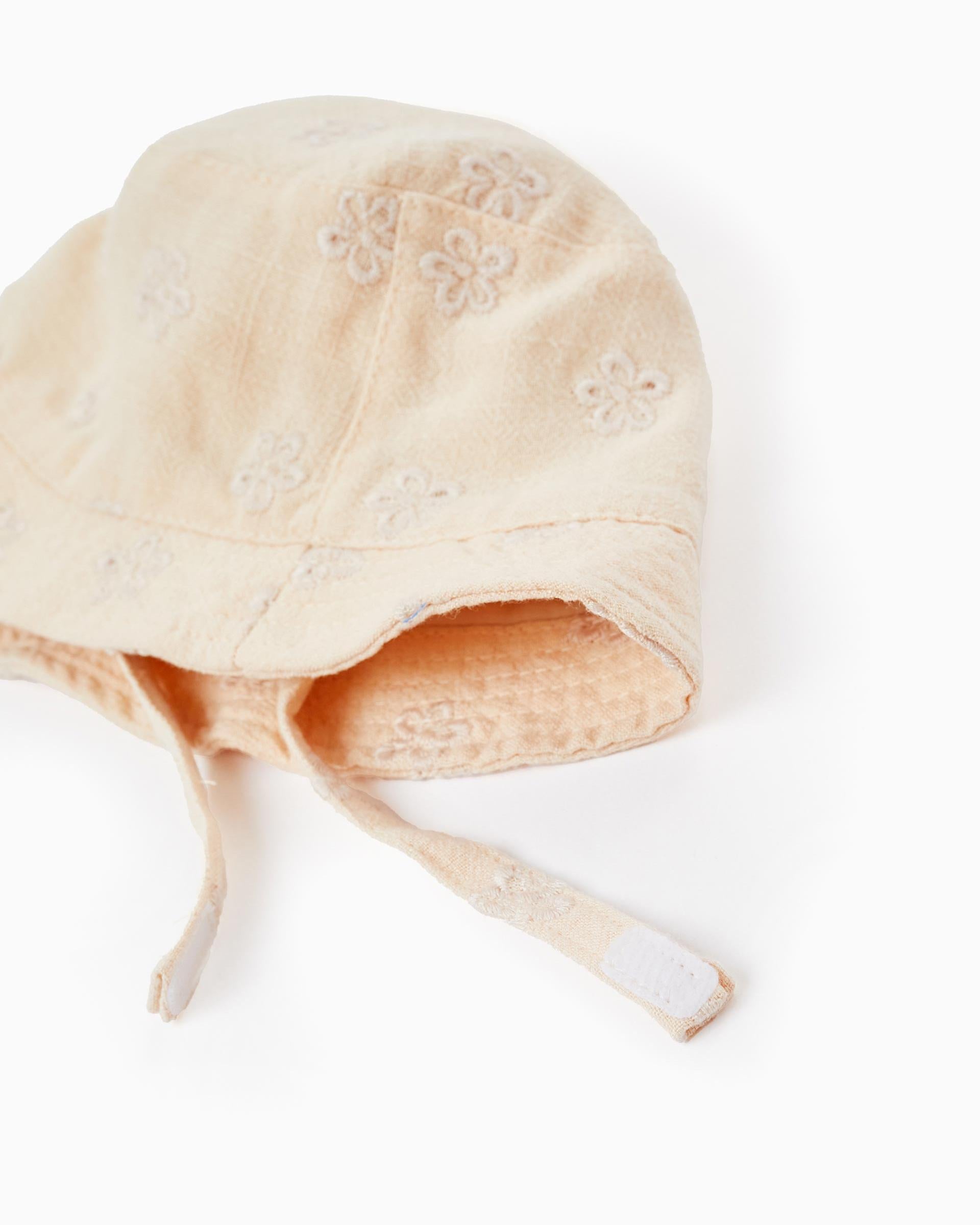 Beige bob with flower embroidery for girls, in a linen blend. With lining and side ribbons with hook and loop fastener for a better fit on the head. An essential accessory to protect the sensitive skin of children on sunny days.