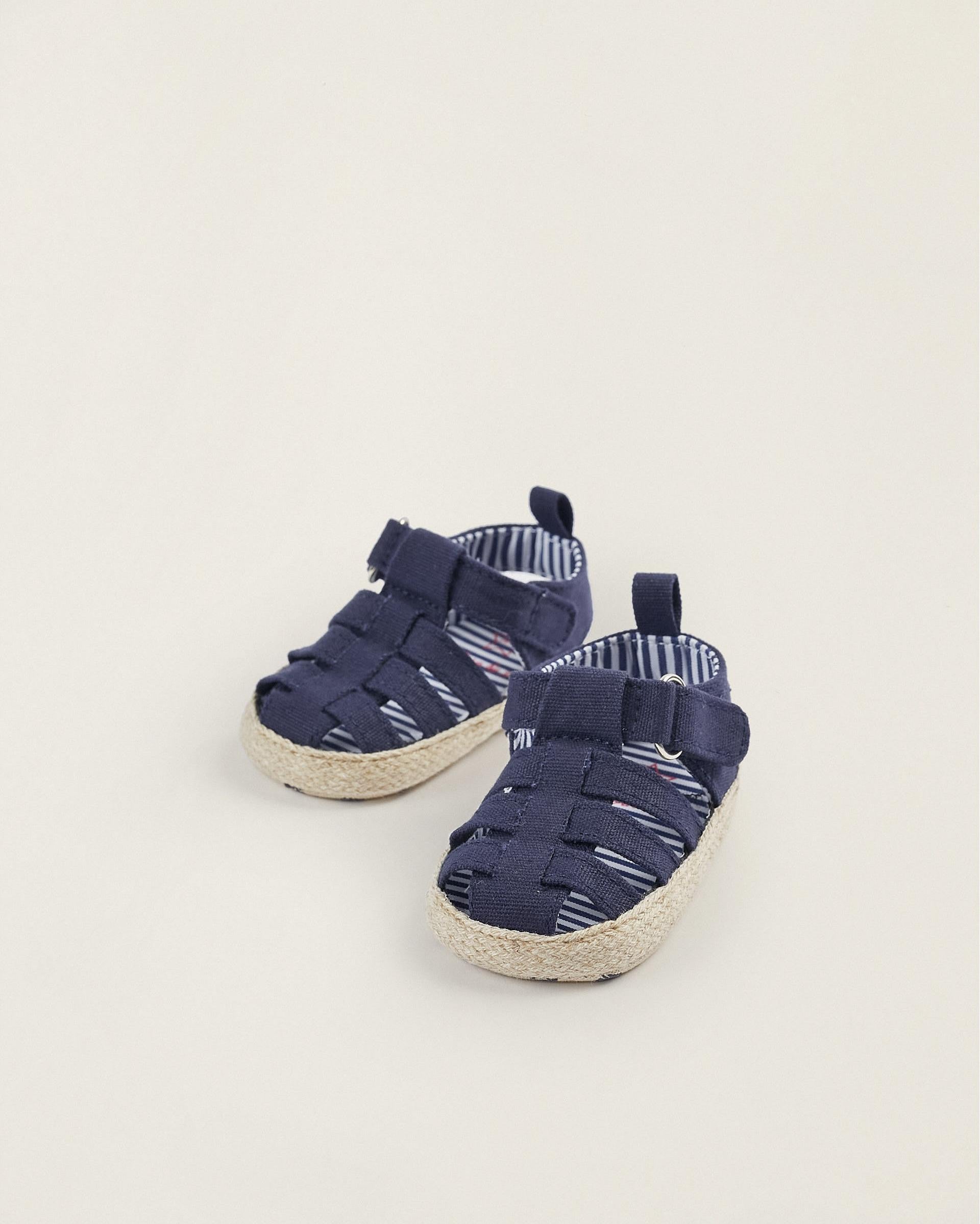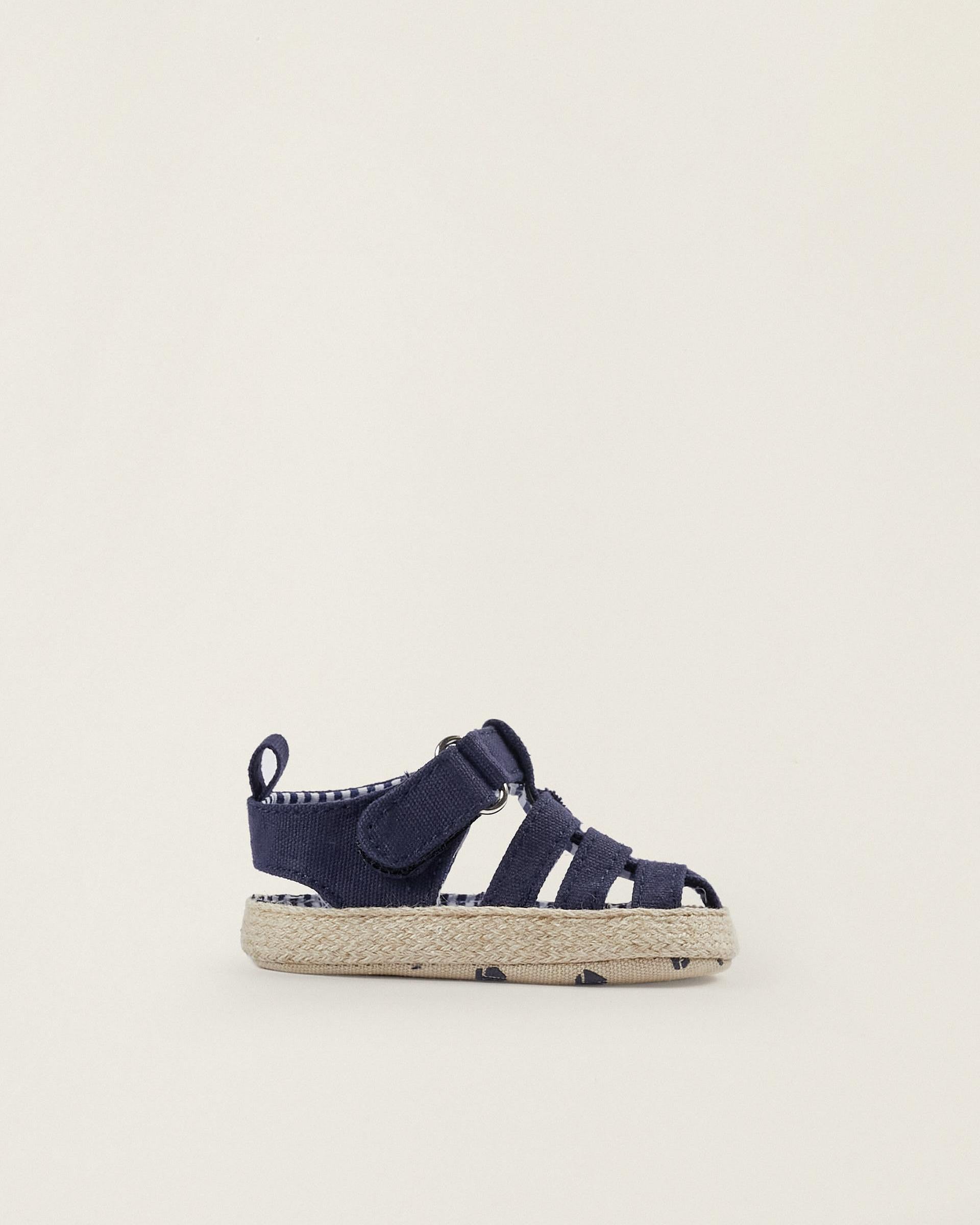 Dark blue fabric strap sandals for newborn boys. Fastens with hook and loop fasteners for easy fitting and adjustment. Flexible and non-slip sole. Synthetic textile interior. A pair of comfortable and versatile sandals for all occasions.