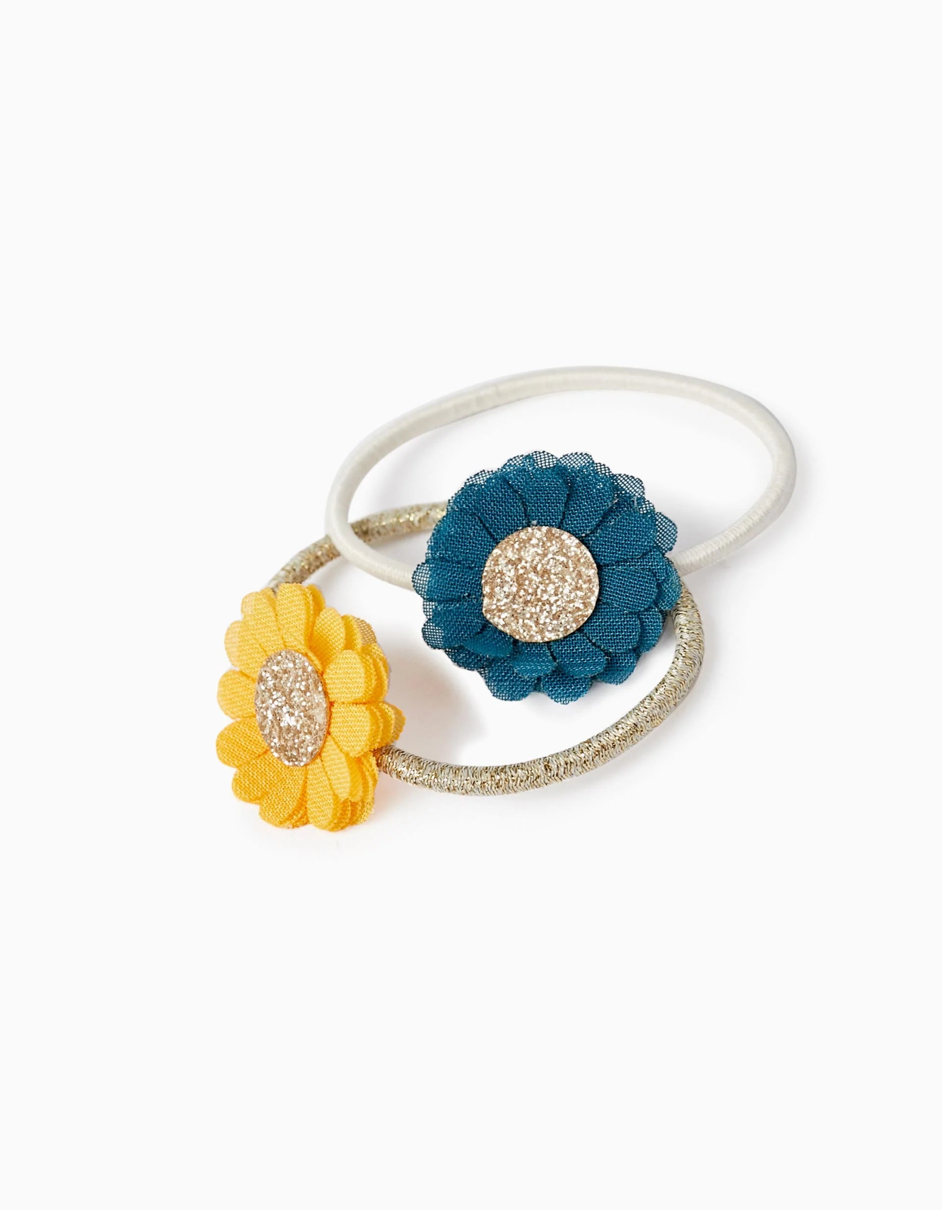 Pack of 2 Elastic Hairbands with Flowers and Glitter for Baby and Girl, Multicolour