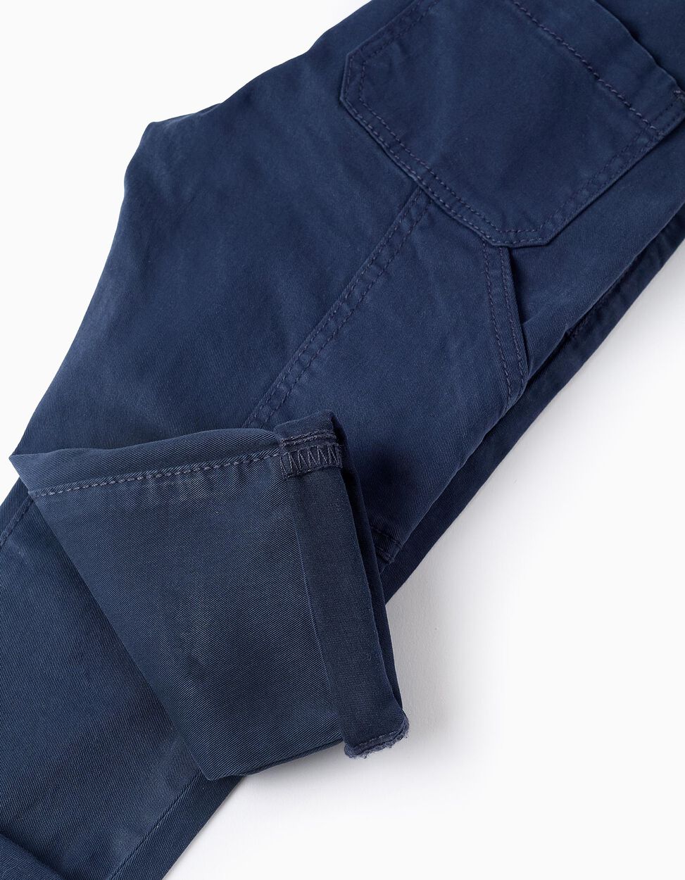 Dark blue twill trousers for baby boys. Made of cotton with a touch of stretch for greater comfort and freedom of movement. Elastic waist with drawstring for adjustment. A classic yet sporty garment, suitable for all styles.