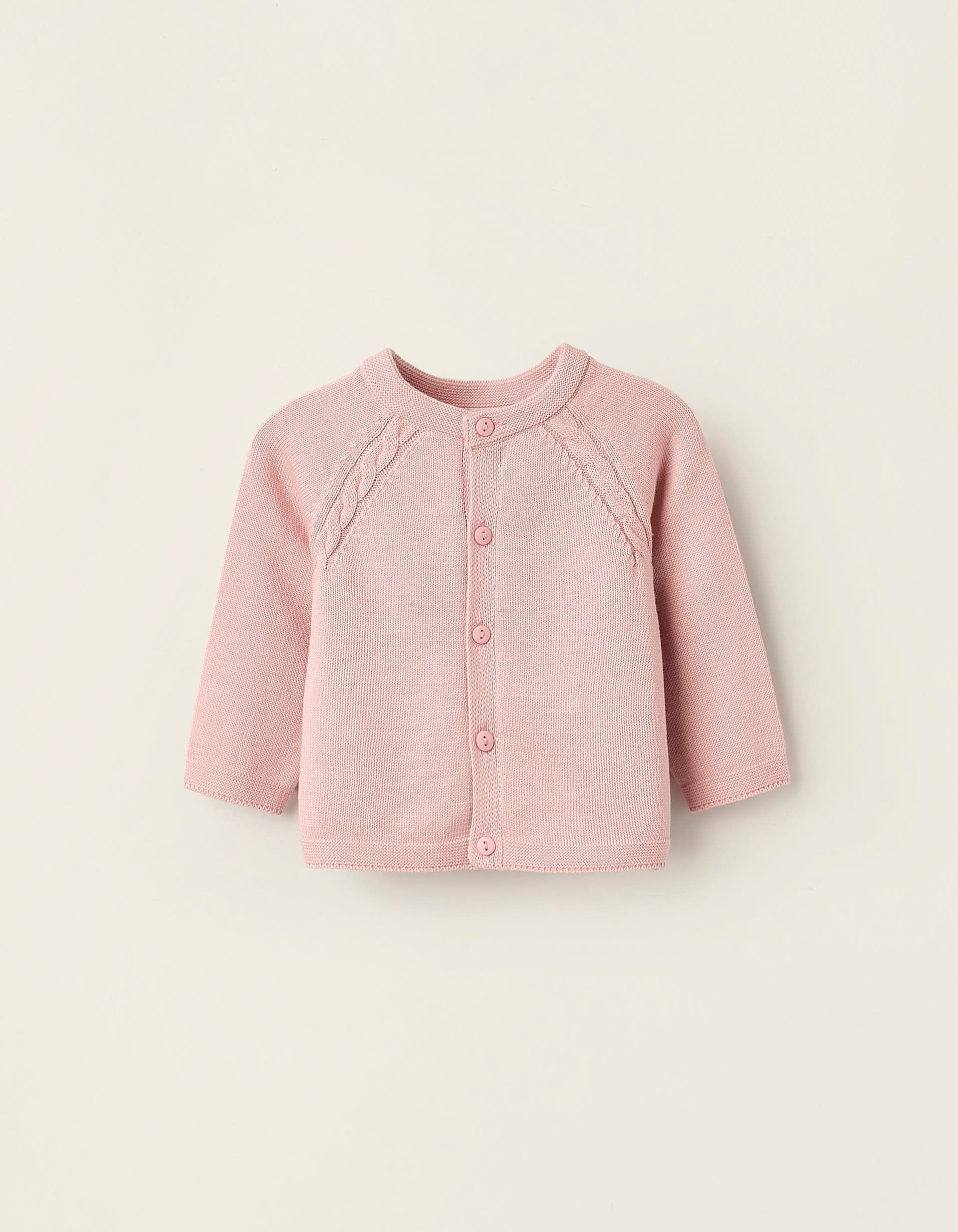 Pink knitted cardigan for newborn girls, 100% cotton. Cable knit details on the front and back. Fastens with buttons. A wardrobe favorite.