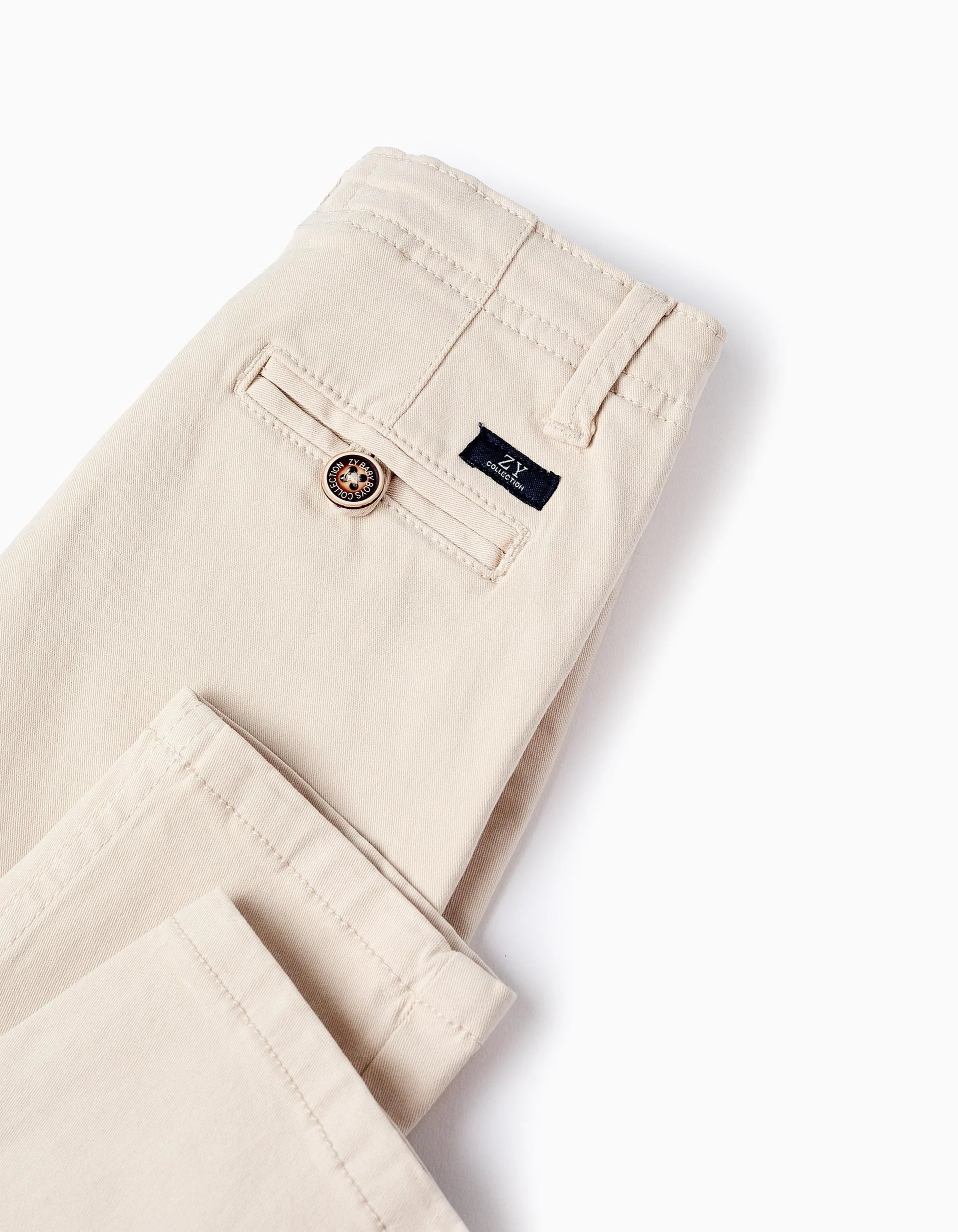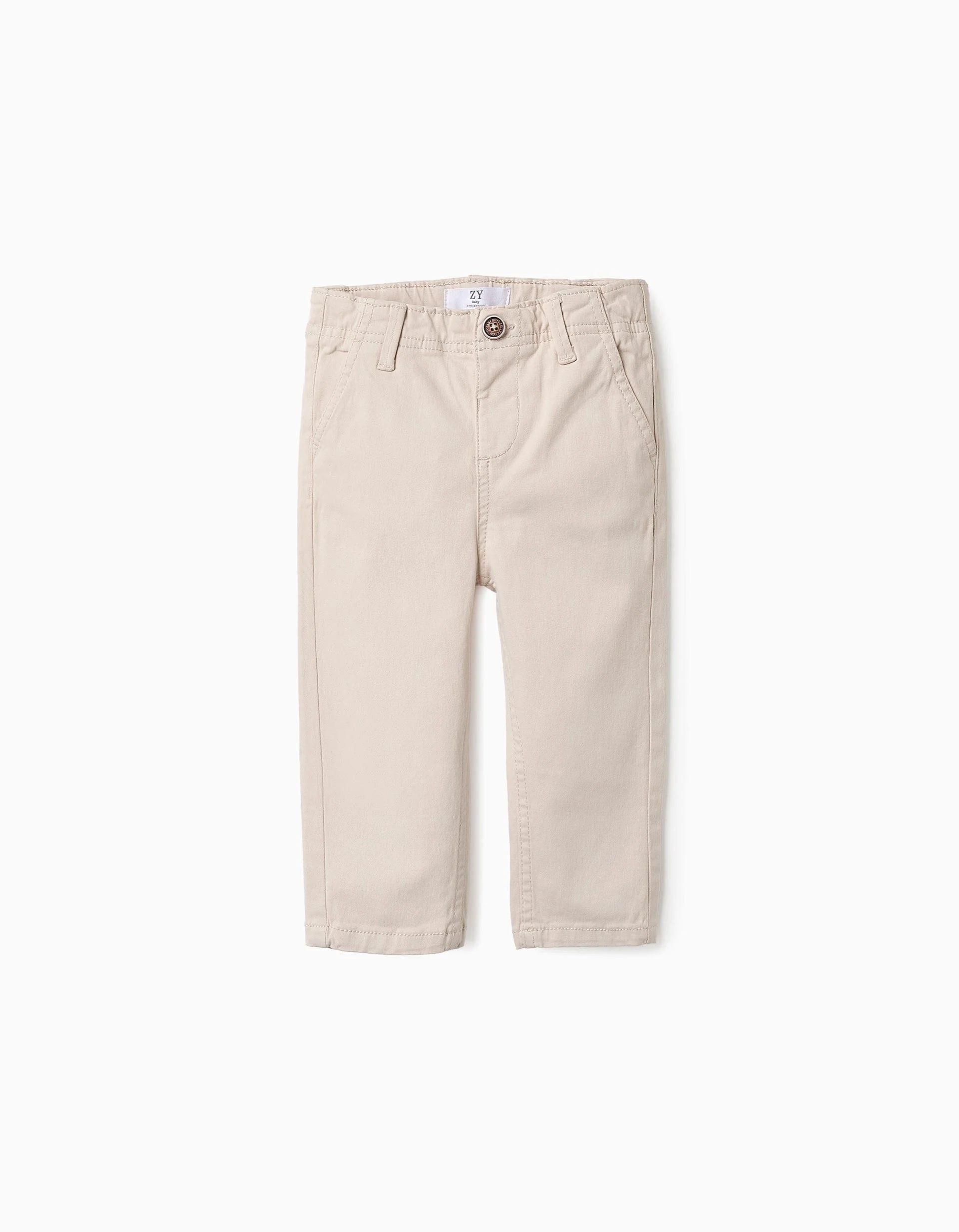 Beige twill chino trousers for baby boys, in cotton with a touch of stretch for greater comfort and freedom of movement. Two side pockets and two back pockets with buttons. Adjustable waist on the inside with elastics and buttons. Fastens with a snap button for easy dressing. Garment dyed. A classic wardrobe staple.
