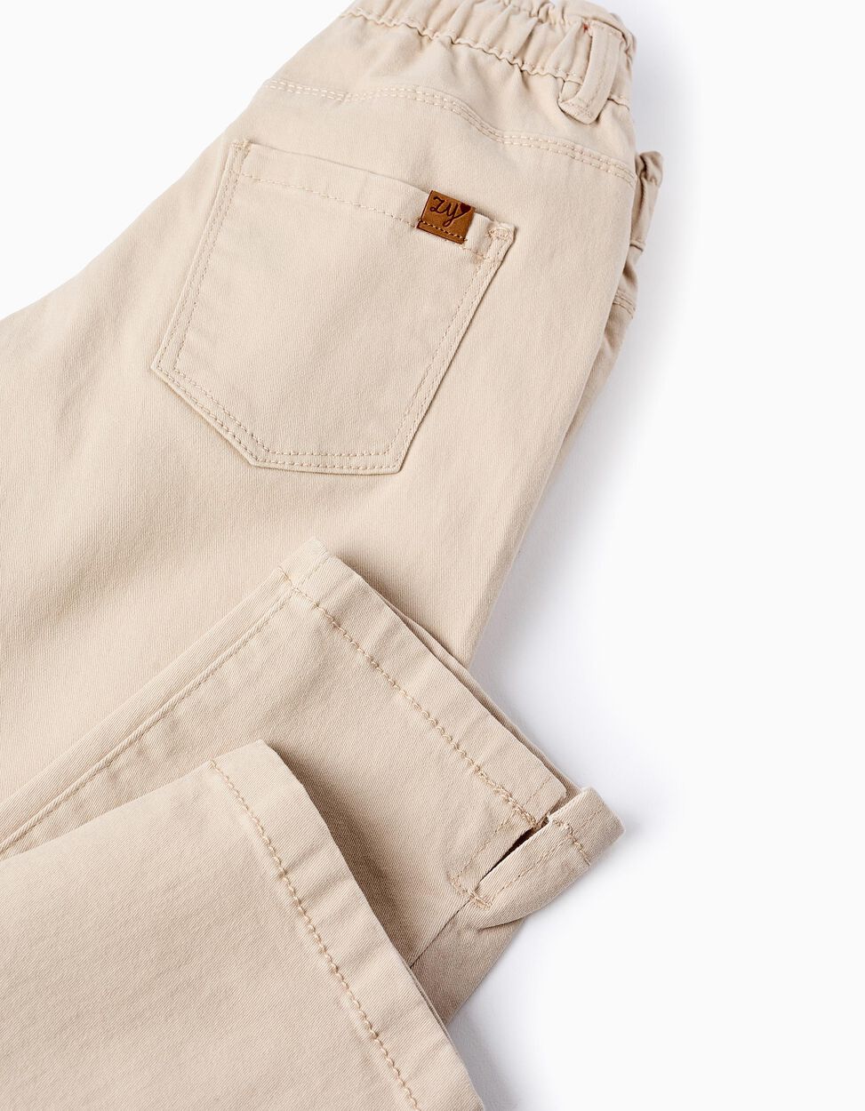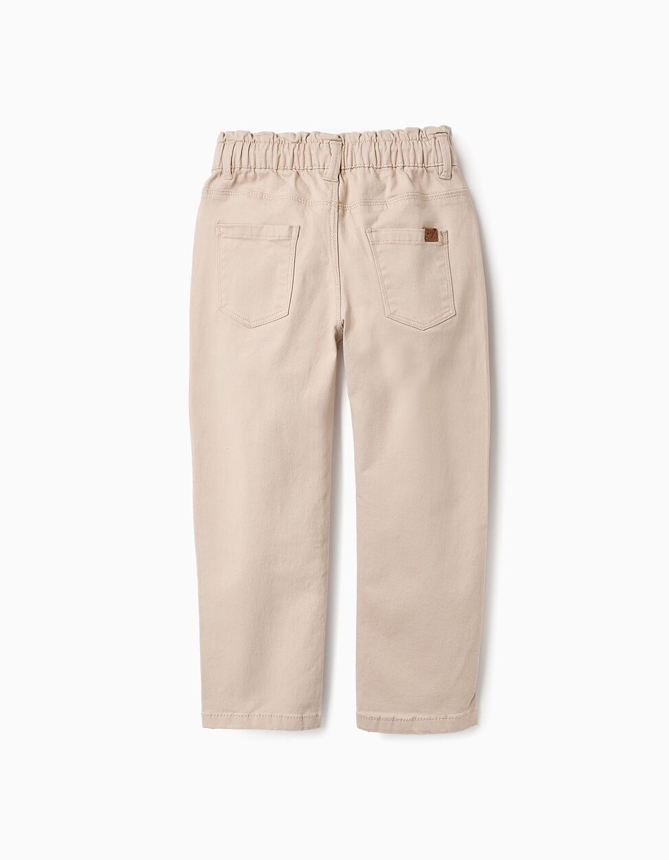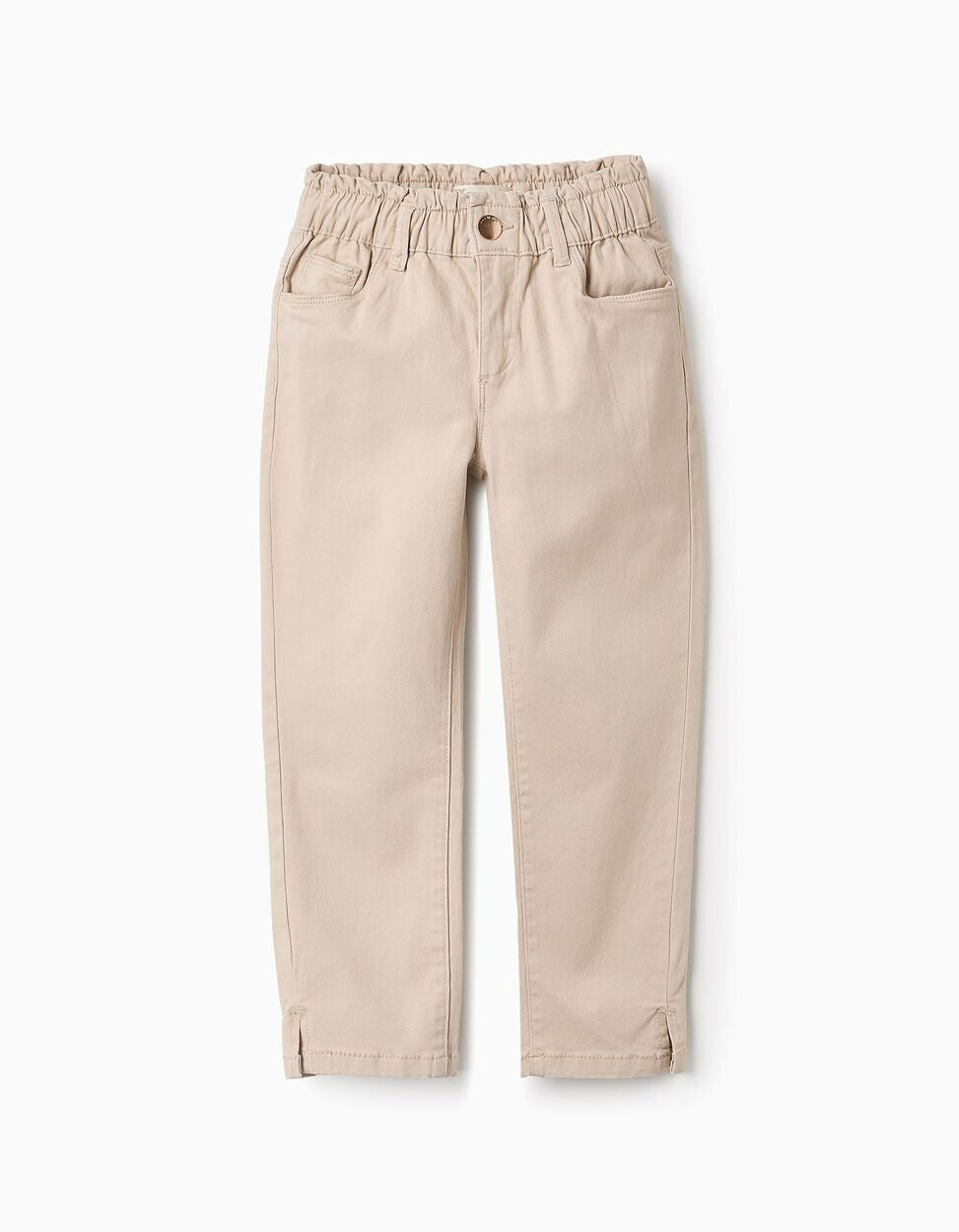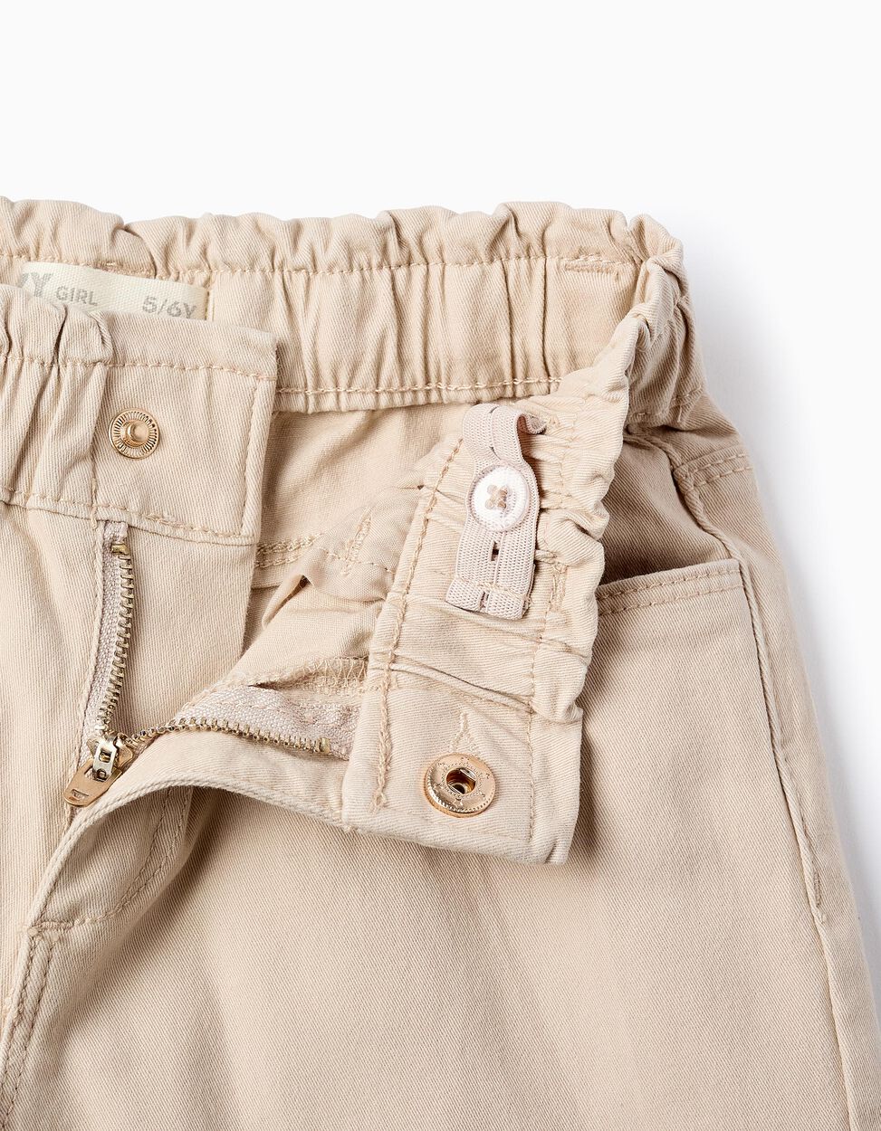 Beige trousers for girls, in cotton twill with a touch of stretch for greater comfort and freedom of movement. Paperbag waist, elastic and adjustable on the inside. Five pockets. Comfortable trousers that are also trendy. Big Me: fastens with a snap button under a decorative button up to size 8/9, to make dressing easier and promote your child's independence.