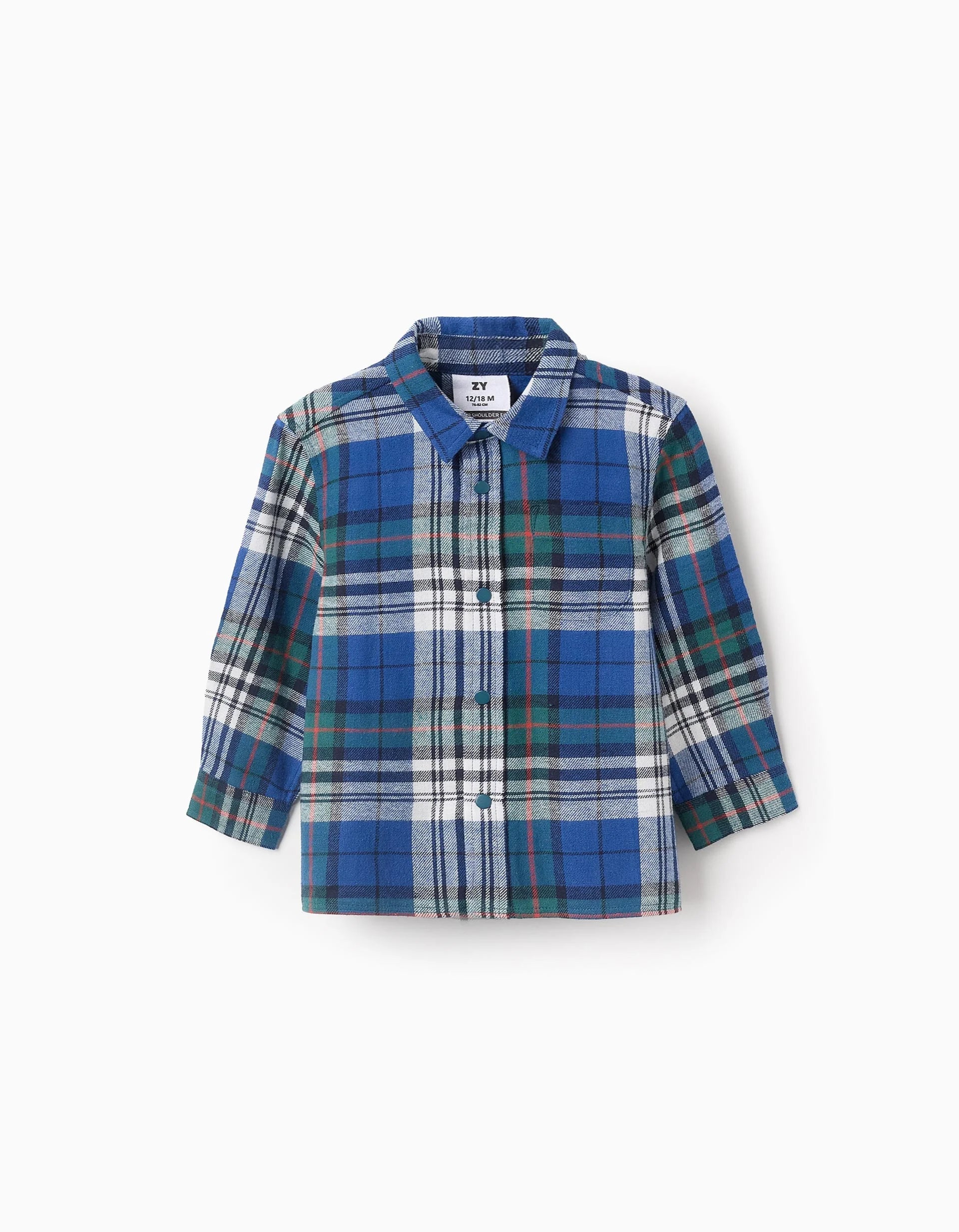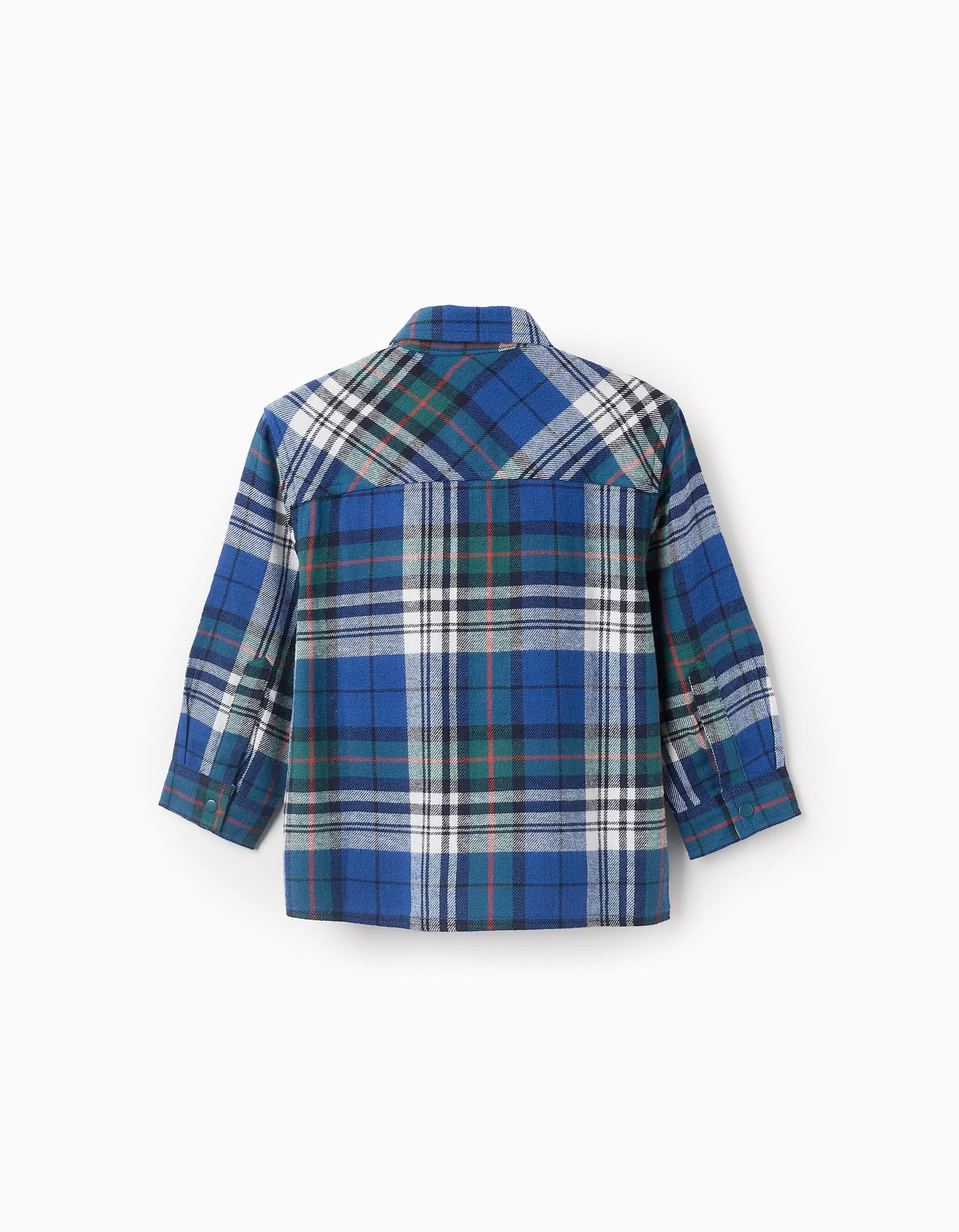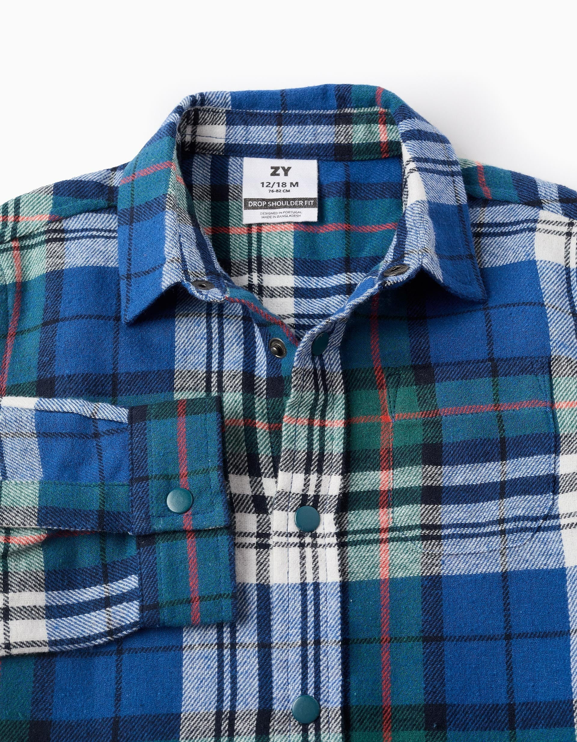100% cotton flannel shirt for baby boys, with blue checkered pattern with green, white and red details. Fastens with snap buttons for easy dressing. Dropped shoulders for a more relaxed style. Chest pocket. Can be worn as a shirt or as an overshirt, allowing for various looks.