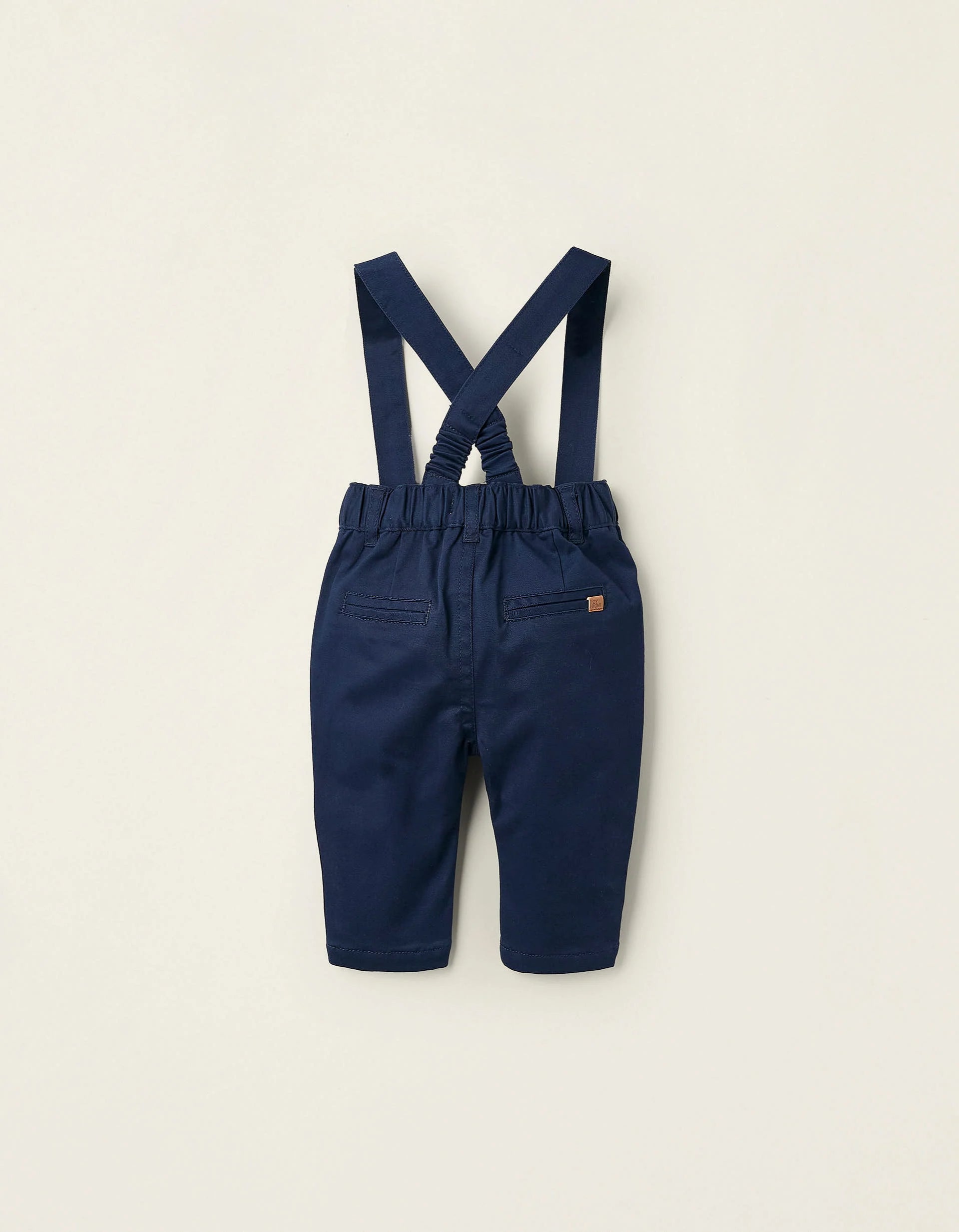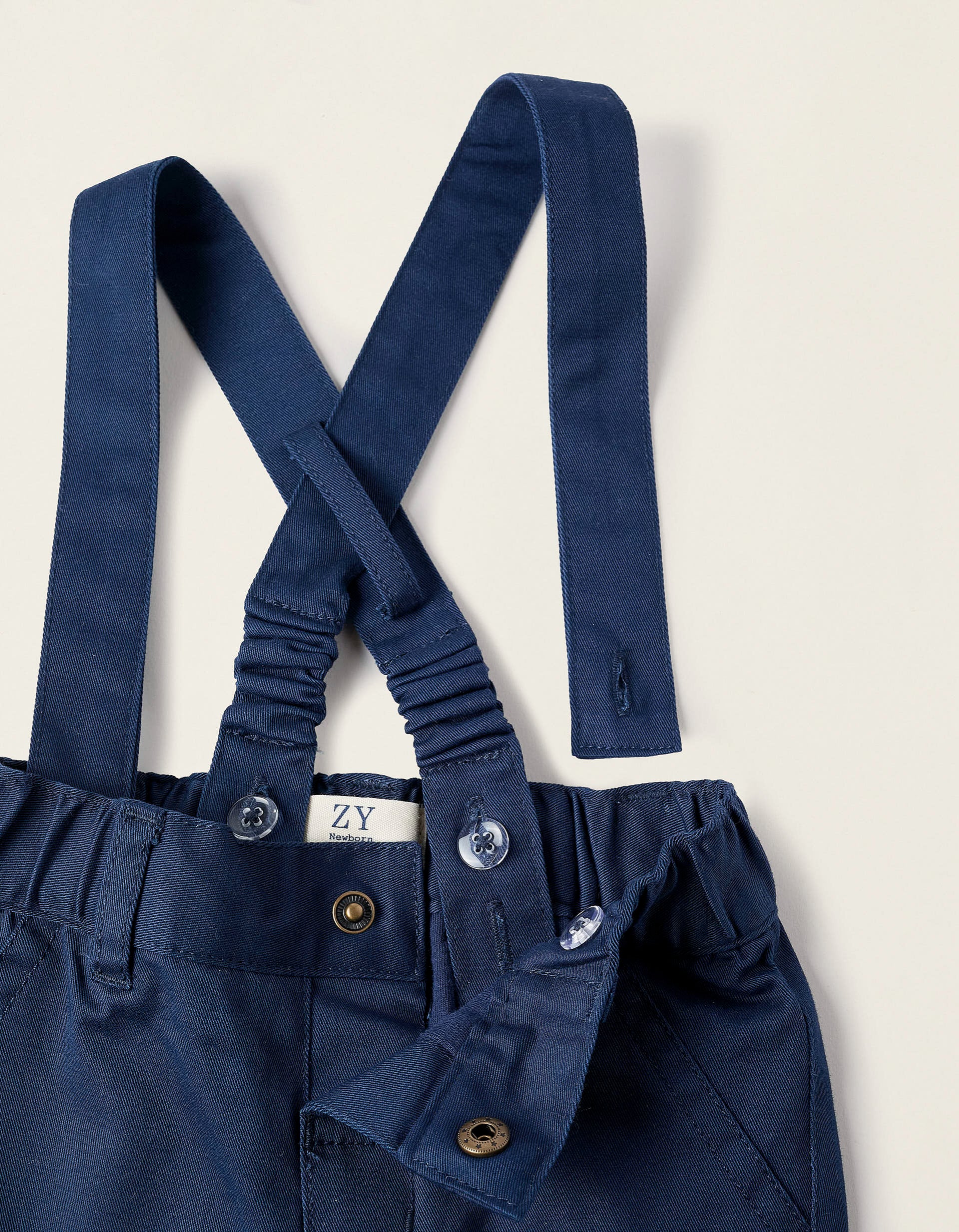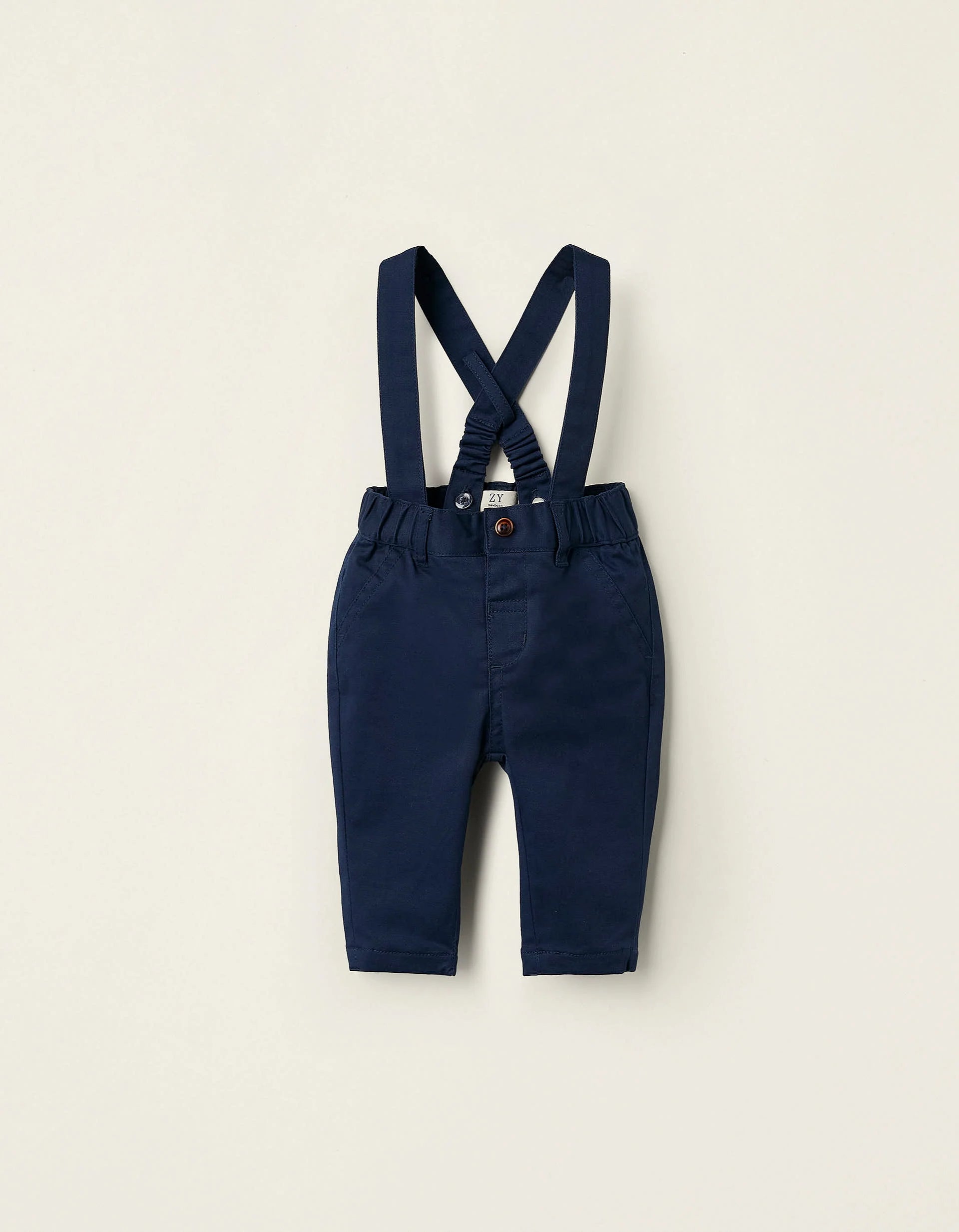 Dark blue trousers for newborns with removable straps. Elastic waist for a perfect fit, with a front snap button for easy dressing. 100% cotton jersey lining for greater comfort. A versatile piece with a classic touch, capable of creating different looks.