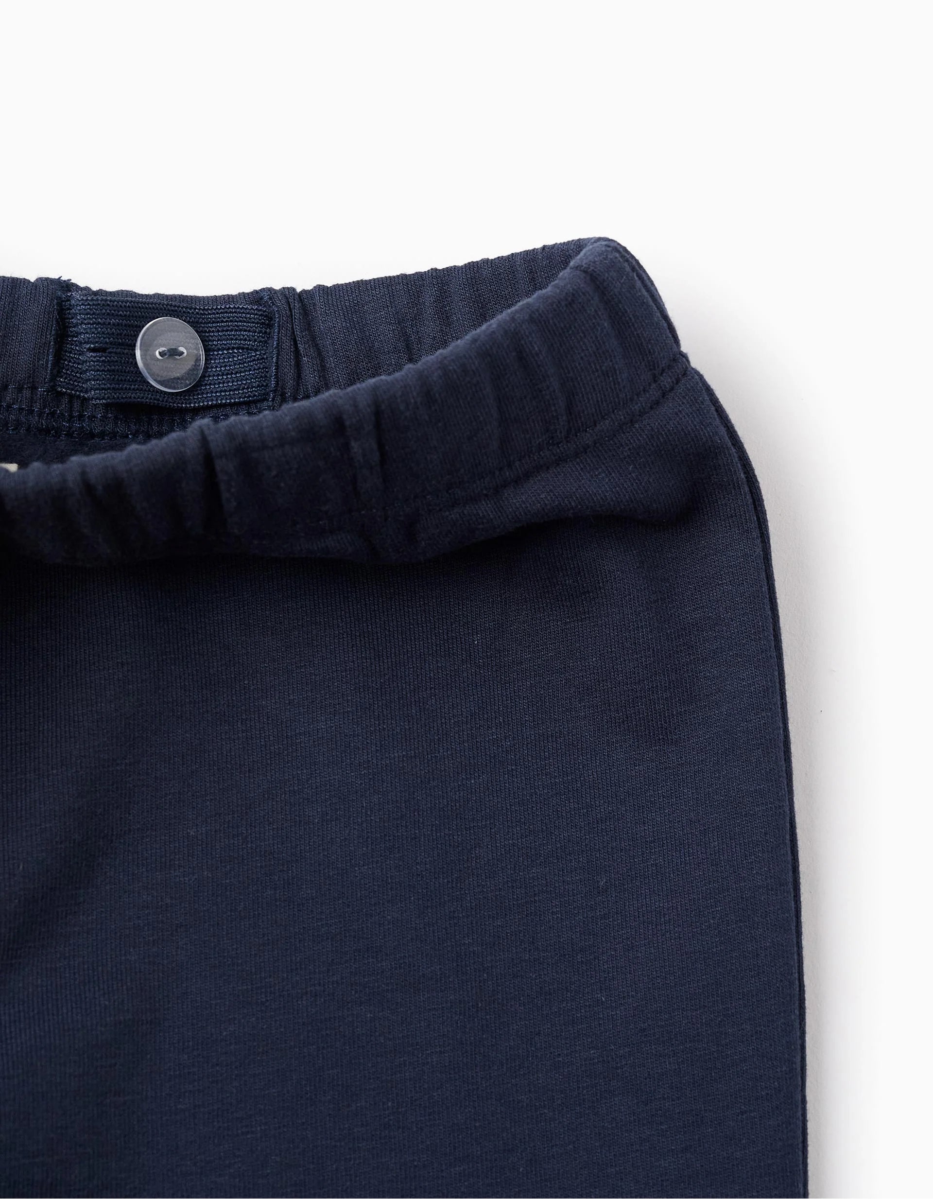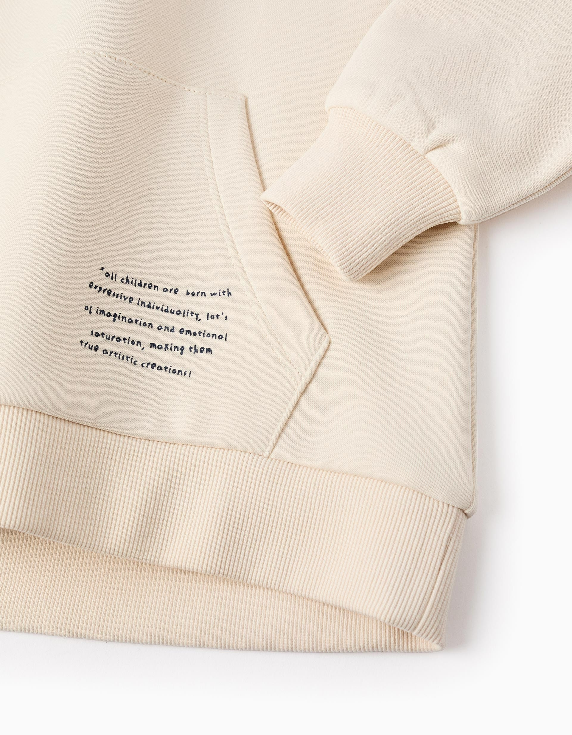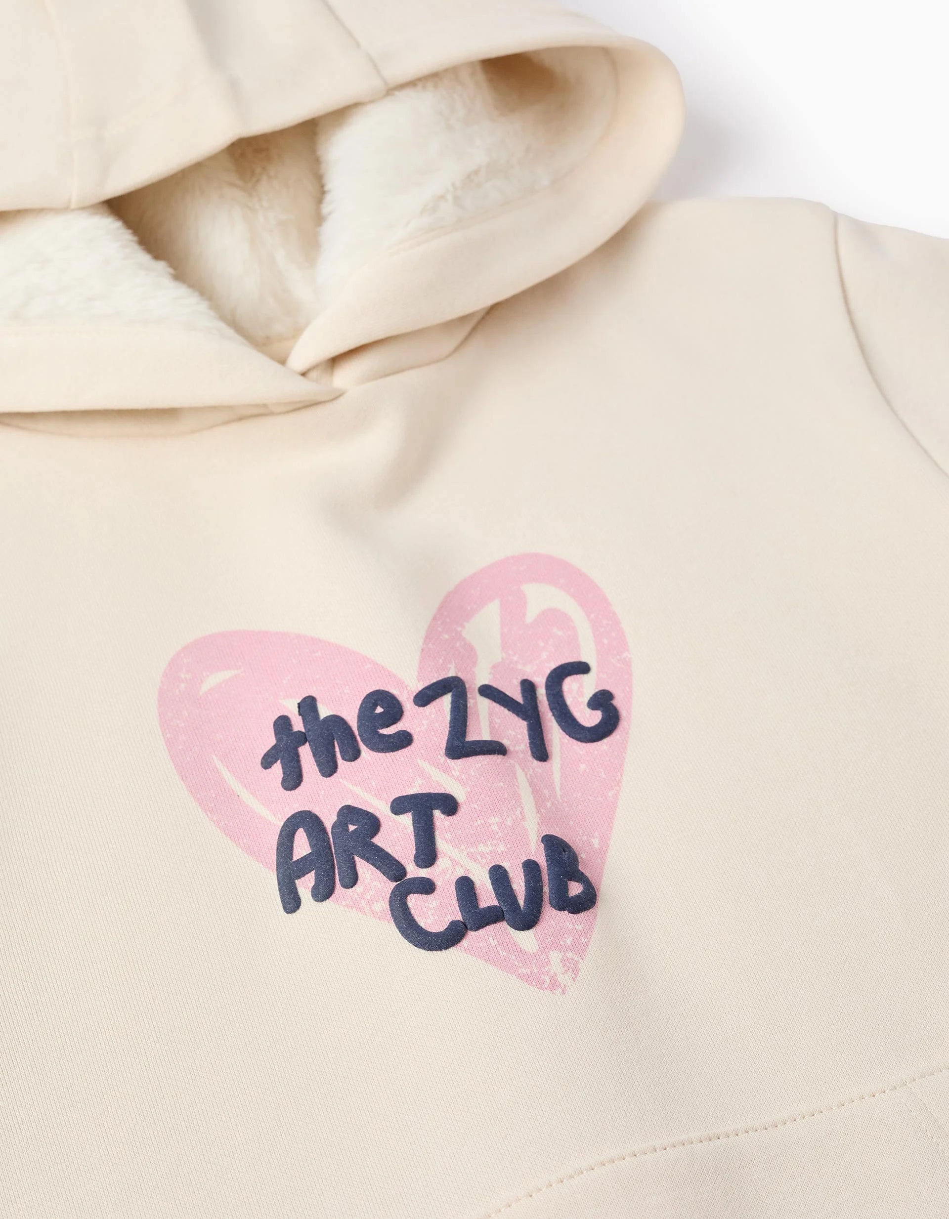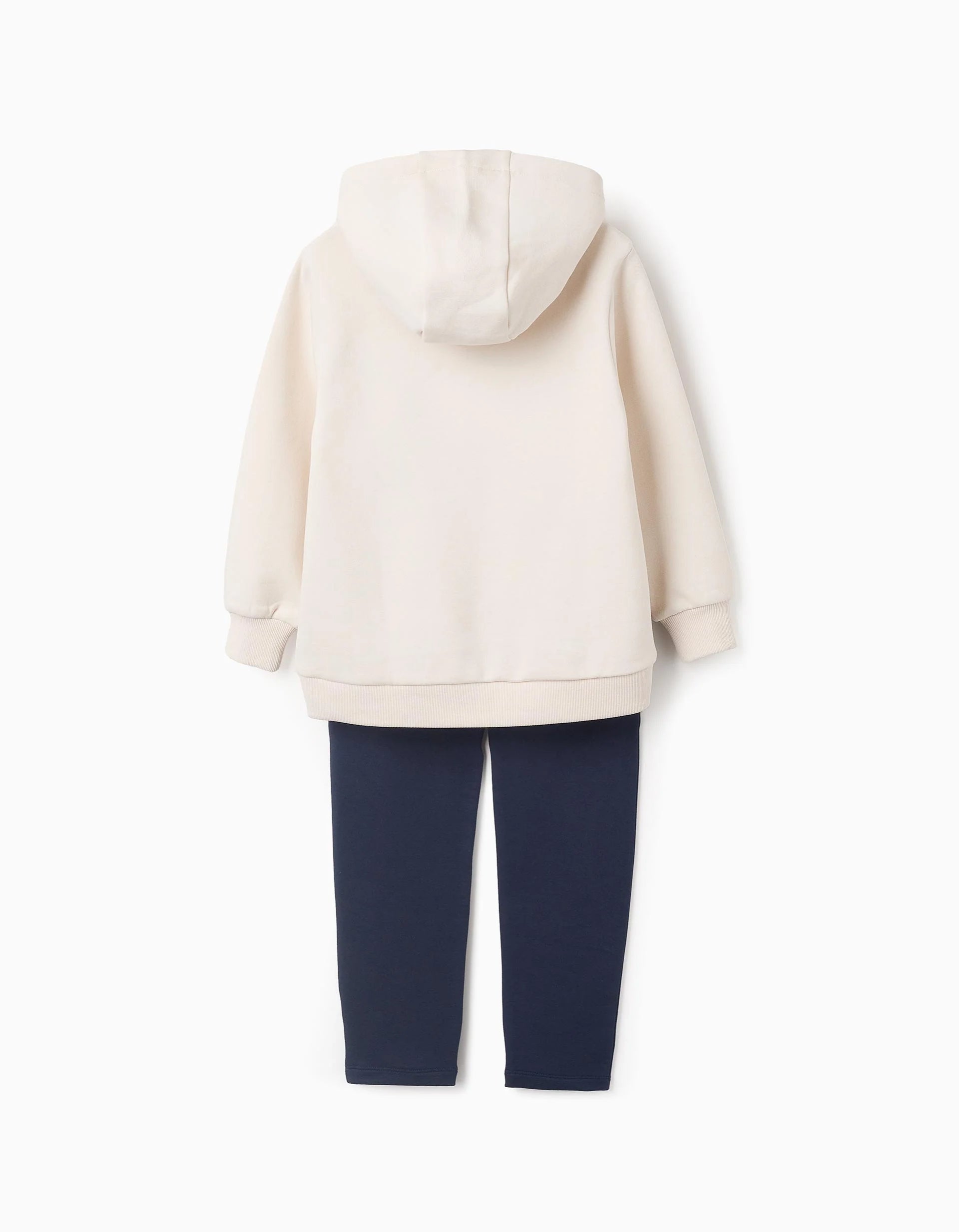 Two-piece set for girls. It consists of a beige sweatshirt with a front print, a hood lined with soft synthetic fur for greater thermal comfort, and a kangaroo pocket; it also includes dark blue leggings with an adjustable waist. An adorable set with an original print.