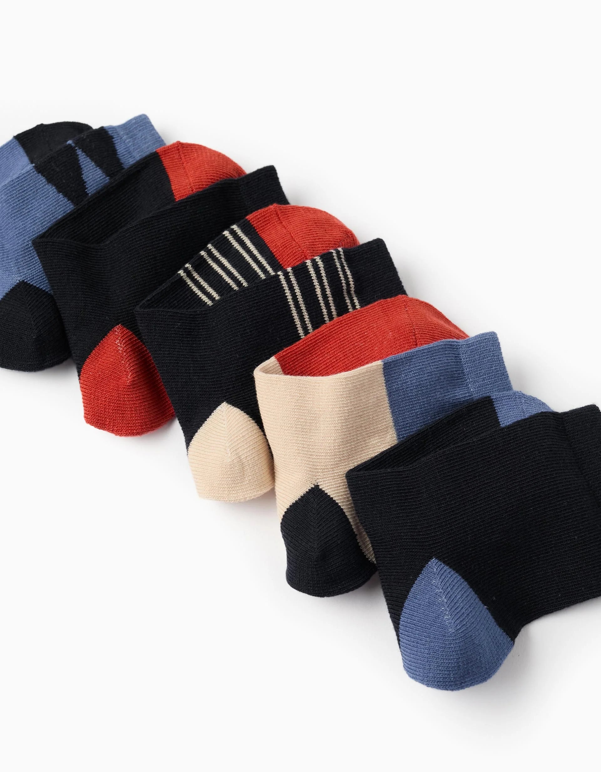 Pack of five pairs of socks for boys, in a blend of cotton with a touch of elastane for greater comfort. Includes plain, striped, and diamond patterned socks, in various shades such as dark blue, light blue, orange, and beige. With contrasting heel and toe. A perfect pack to ensure daily comfort! We Care: article with Oeko-Tex Standard 100 certification, which guarantees the absence of harmful or irritating substances for the skin.