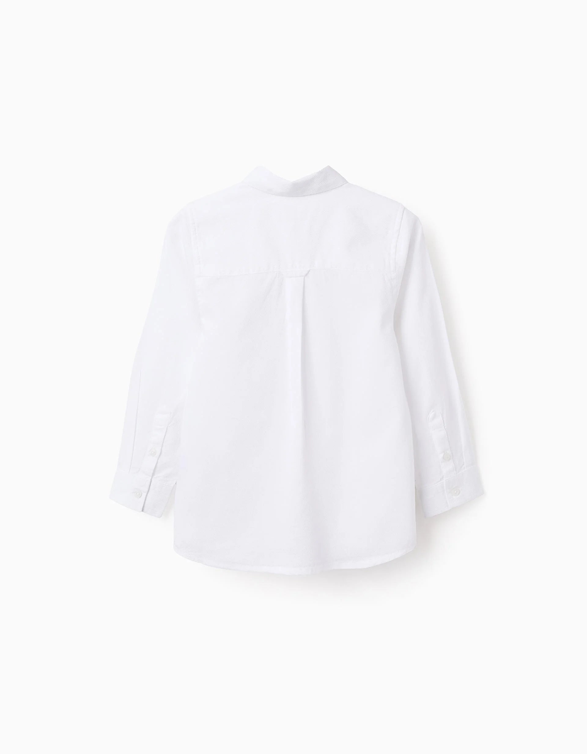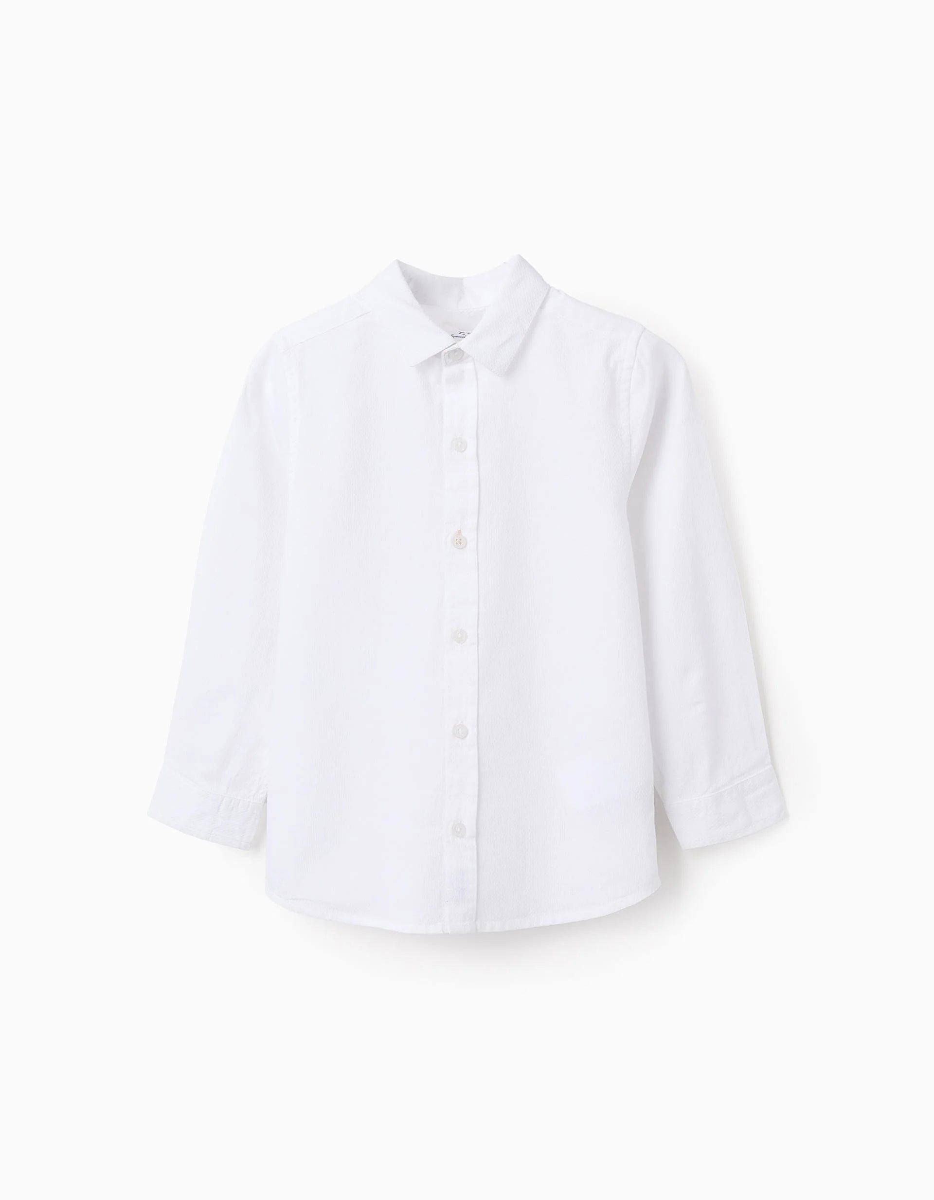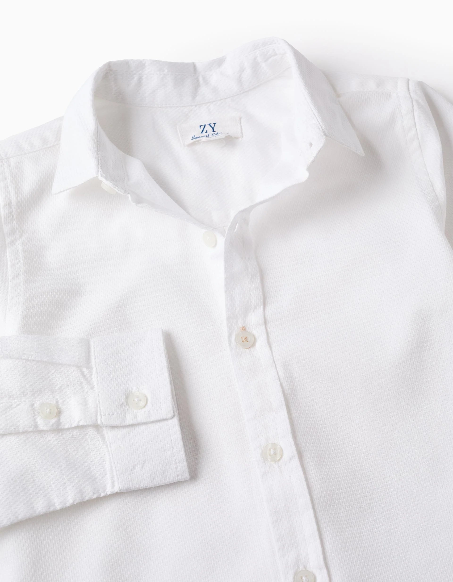 White long-sleeved shirt for boys, made of textured fabric. 100% cotton. Classic model. Ideal for parties, events, and other special occasions. Big Me: a button with contrasting thread and buttonhole for the child to easily identify where to start buttoning, promoting their autonomy.