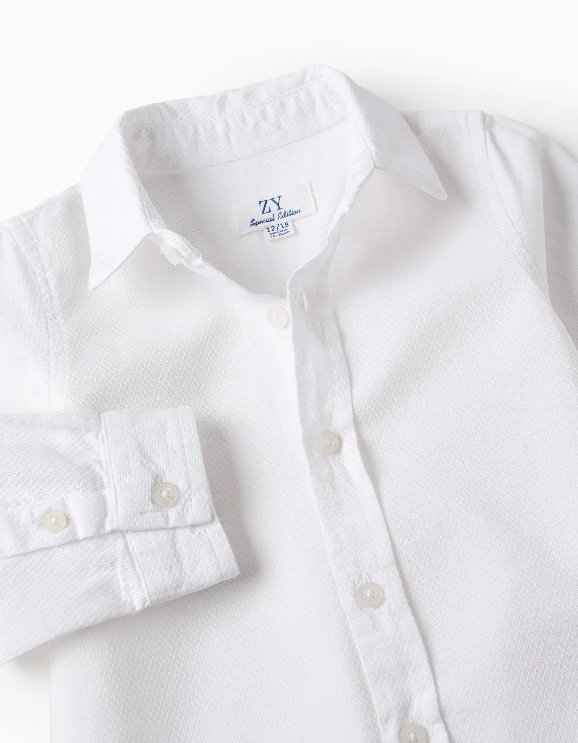 White long-sleeved shirt for baby boys, made of textured fabric. 100% cotton. Classic model. Ideal for parties, events, and other special occasions.