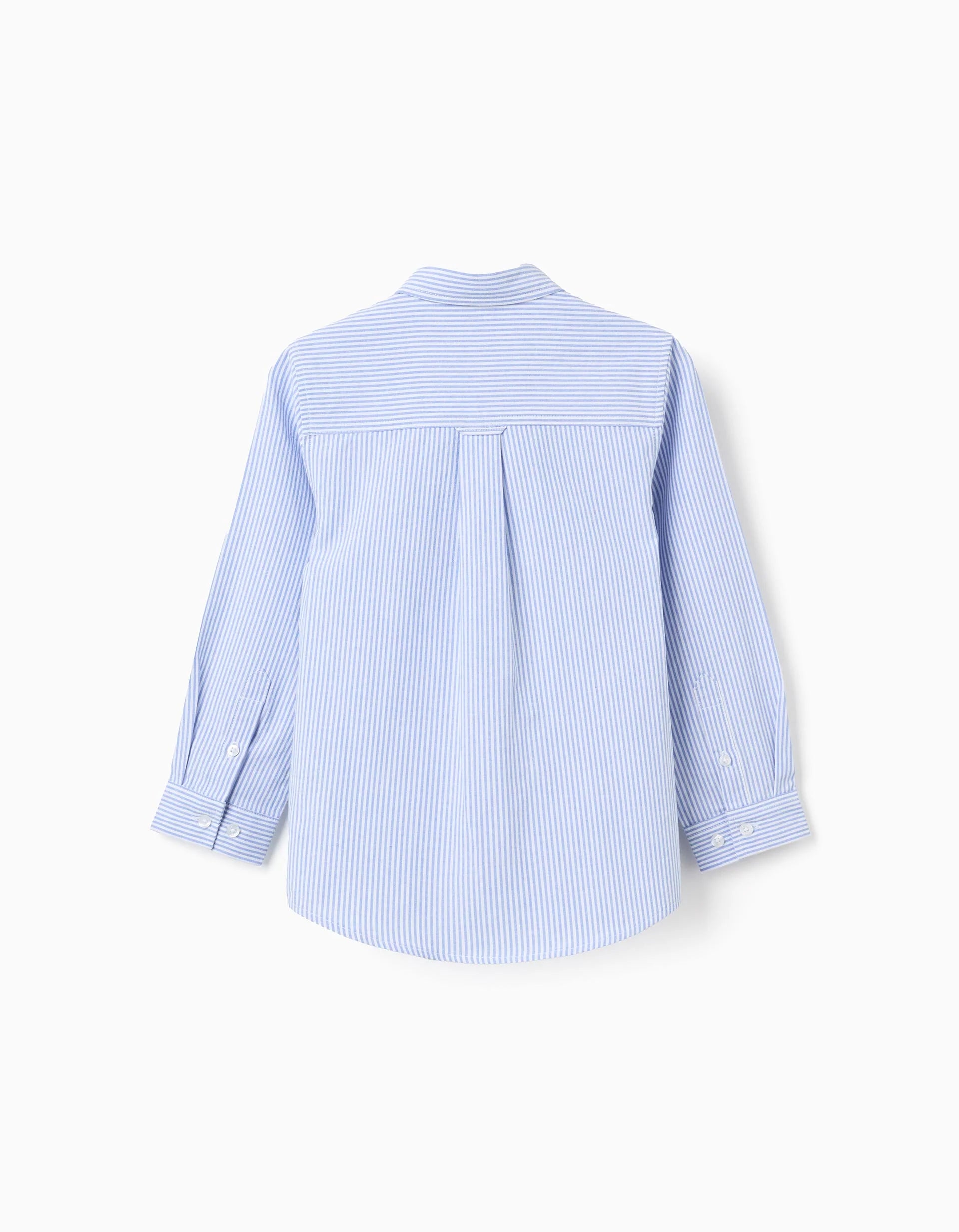 Striped white and blue shirt for boys, in cotton Oxford. Embroidered branding detail on the chest. Rounded base. A classic and timeless shirt. Big Me: a button with contrasting thread and buttonhole for the child to easily identify where to start buttoning, promoting their autonomy.