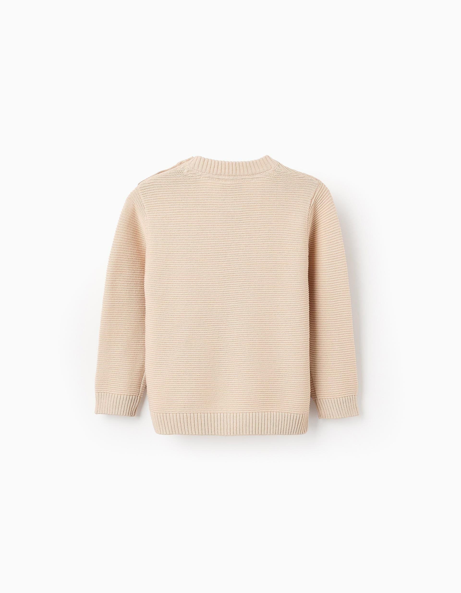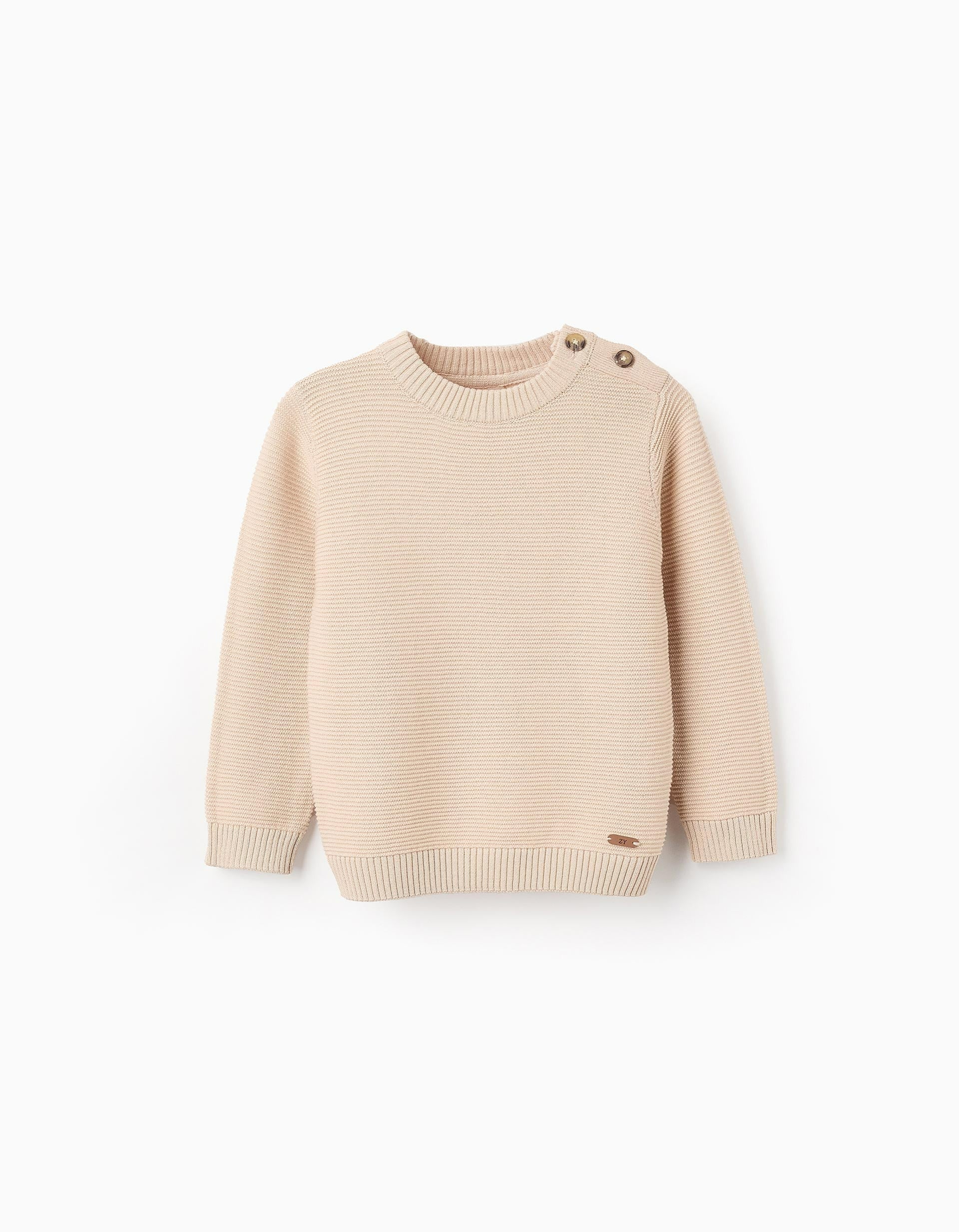 Beige jumper for baby boys, in textured 100% cotton knit. Buttons on the shoulder for easy dressing. Ribbed edges for a perfect fit. Light, soft and comfortable.