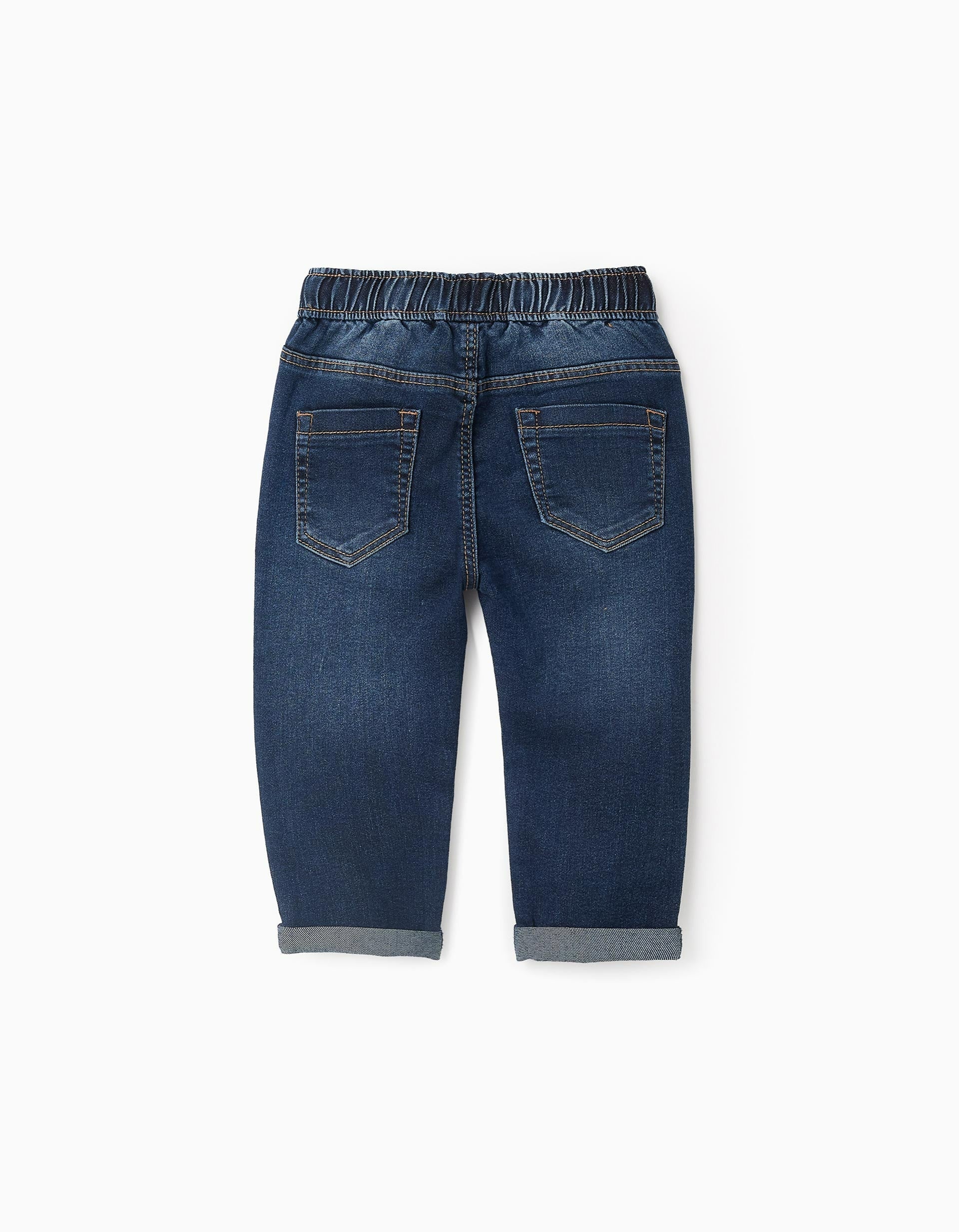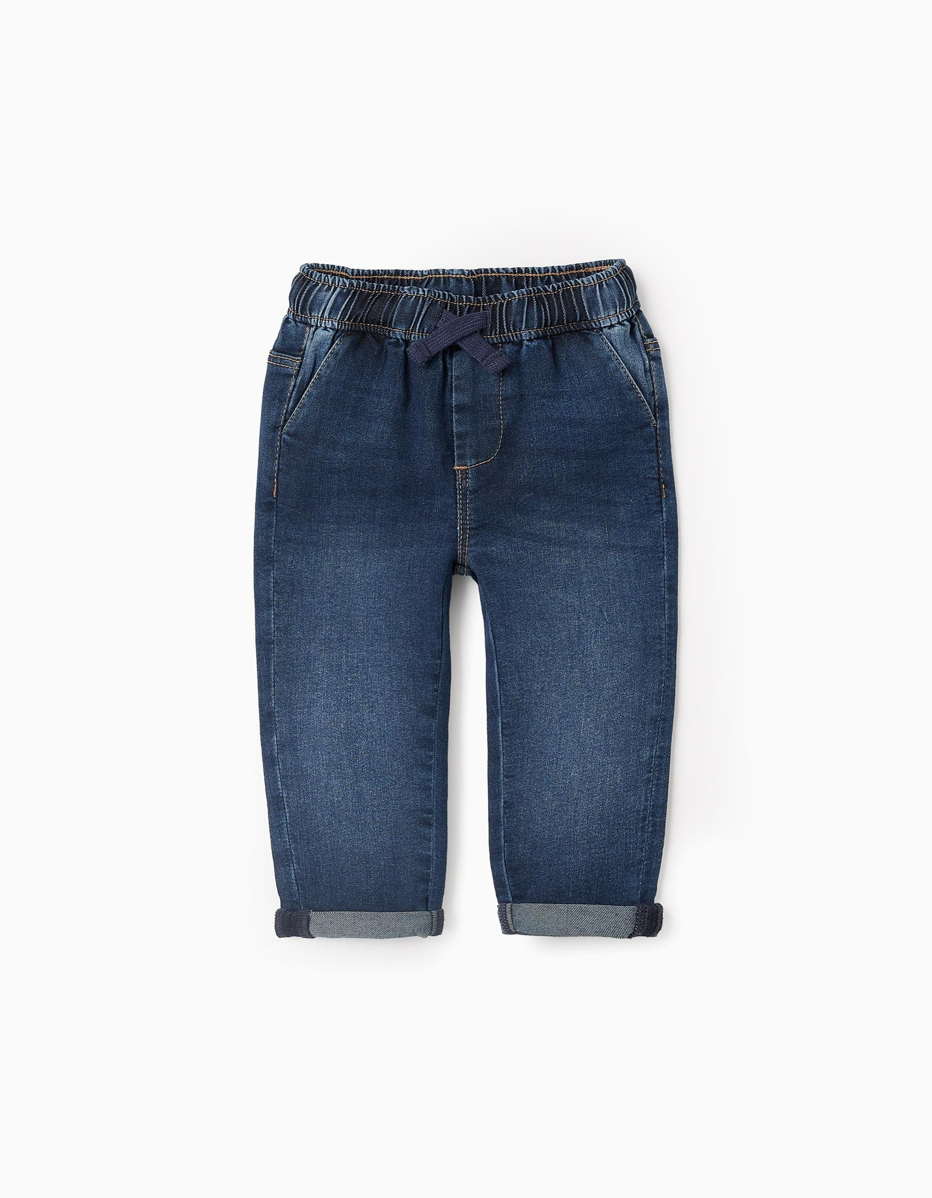 Dark blue jeans for baby boys, made of soft and flexible denim. Comfortable and adjustable elastic waistband with a drawstring. Four pockets. A practical pair of jeans for everyday wear!