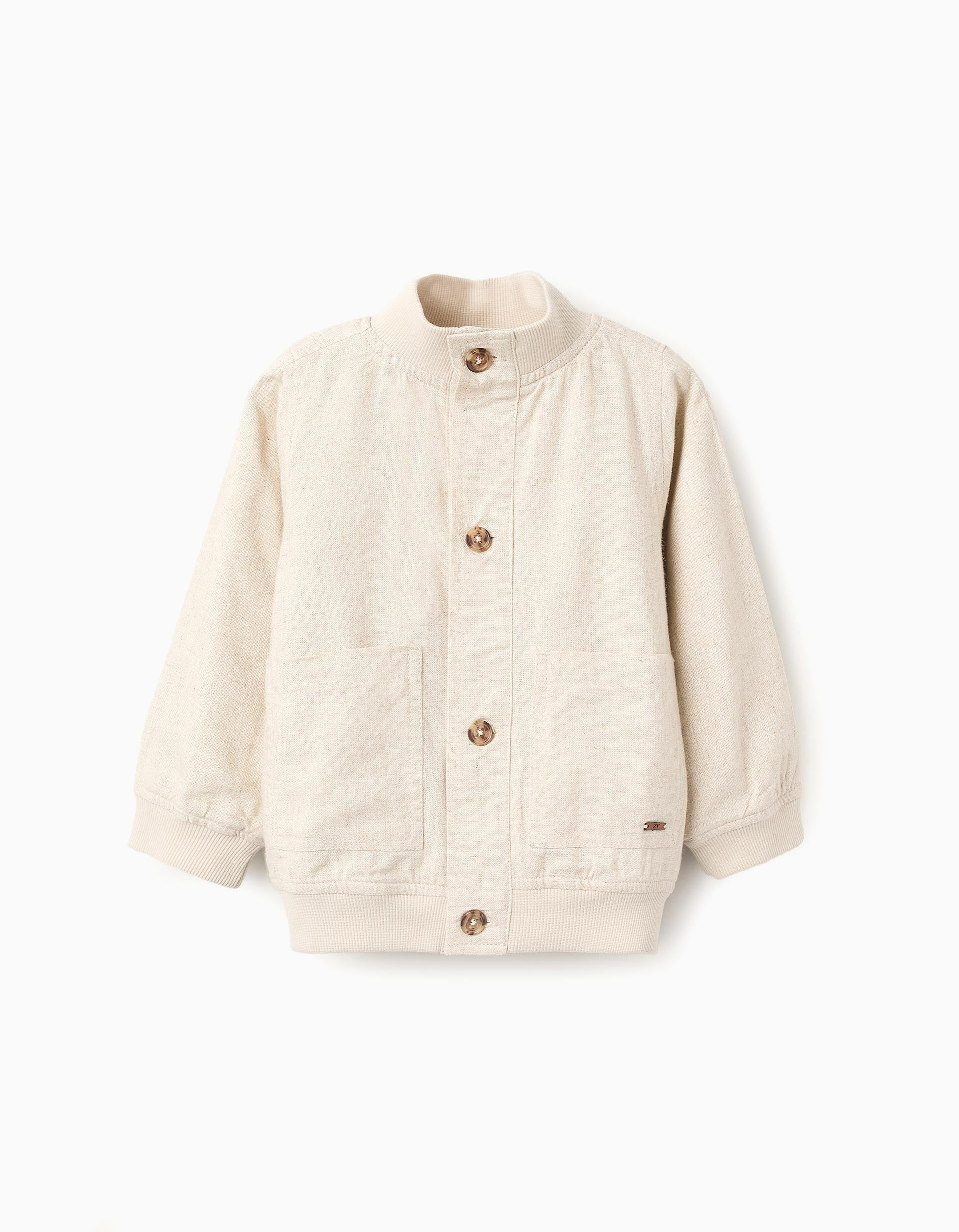 Beige jacket for baby boys, in a blend of viscose and linen. Ribbed collar, hem, and cuffs for a perfect fit. Front pockets. Fastens with buttons. Interior label to write the child's name. Versatile and stylish.