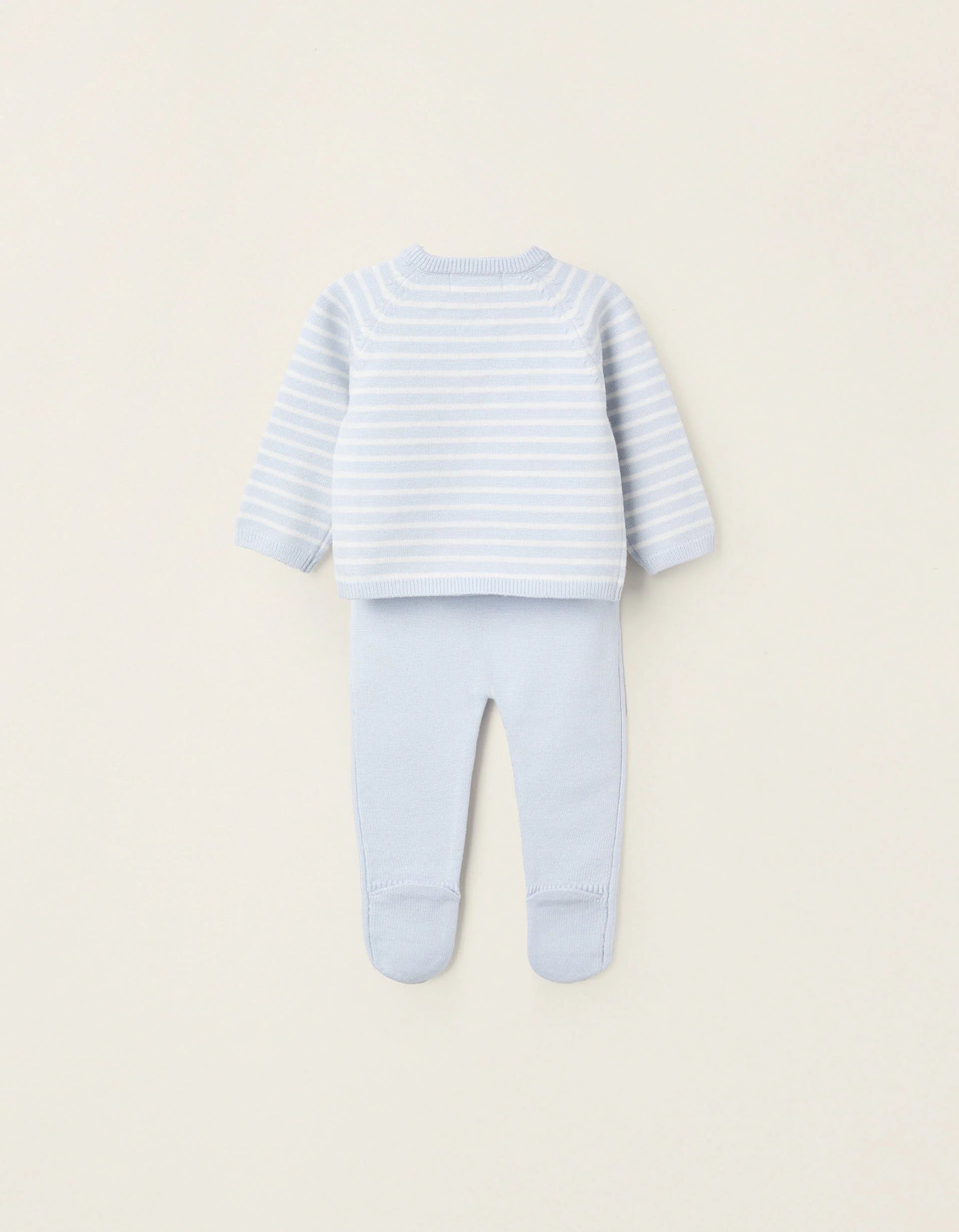 Blue knitted two-piece set for newborn boys. Includes a striped jumper with side buttons; and footed trousers with a high waist. A soft and cosy set.