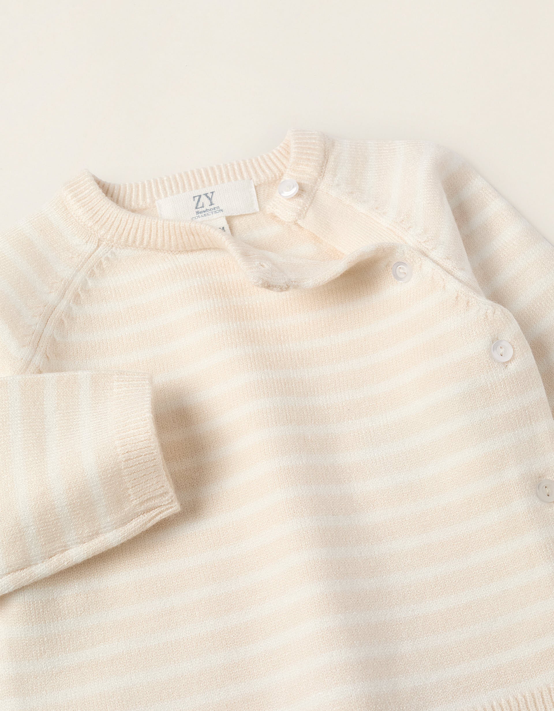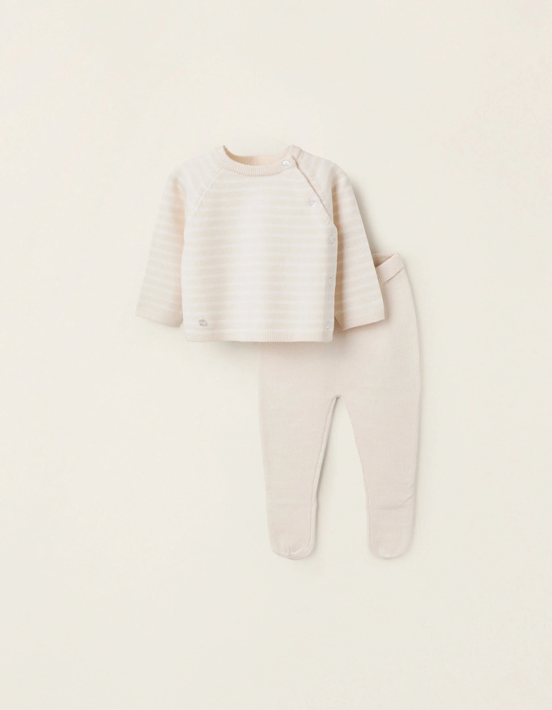 Beige knitted two-piece set for newborns. Includes a striped jumper with side buttons; and footed trousers with a high waist. A soft and cosy set.