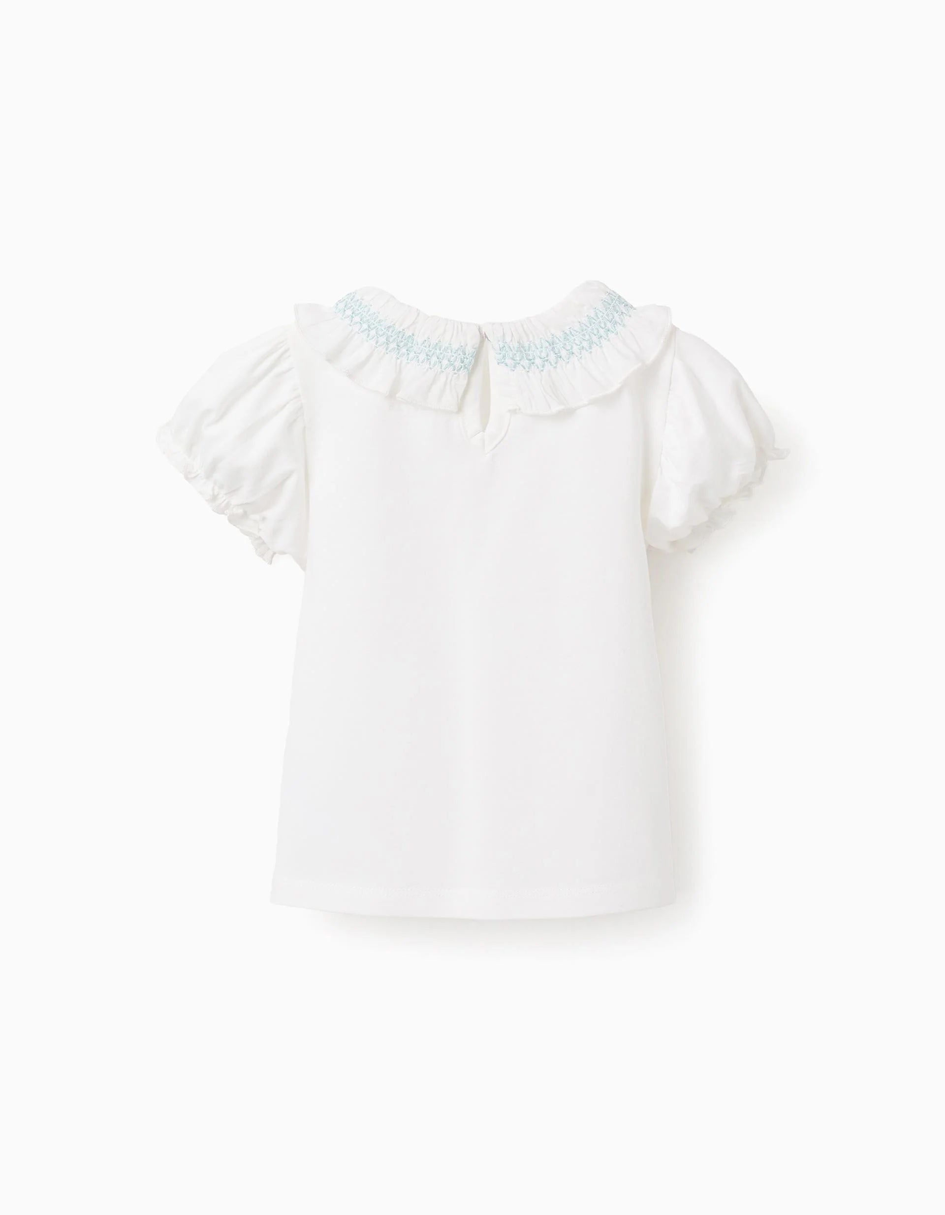 White t-shirt for baby girls, in cotton with a touch of stretch for greater comfort and freedom of movement. Frilled collar with smock elastic and blue line embroidery. Slightly puffed sleeves. Button at the back and printed inner label to not irritate the skin. A soft and elegant option!