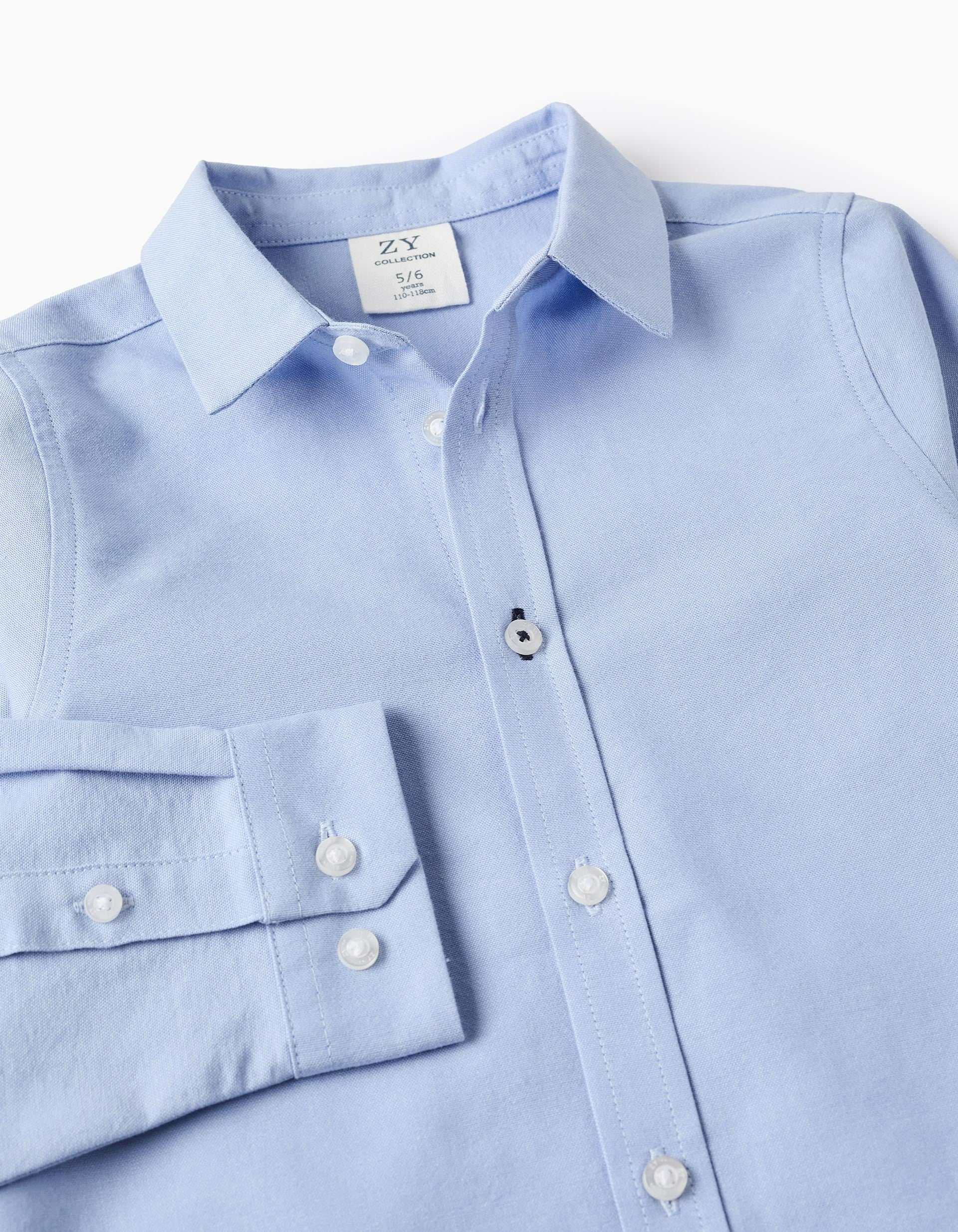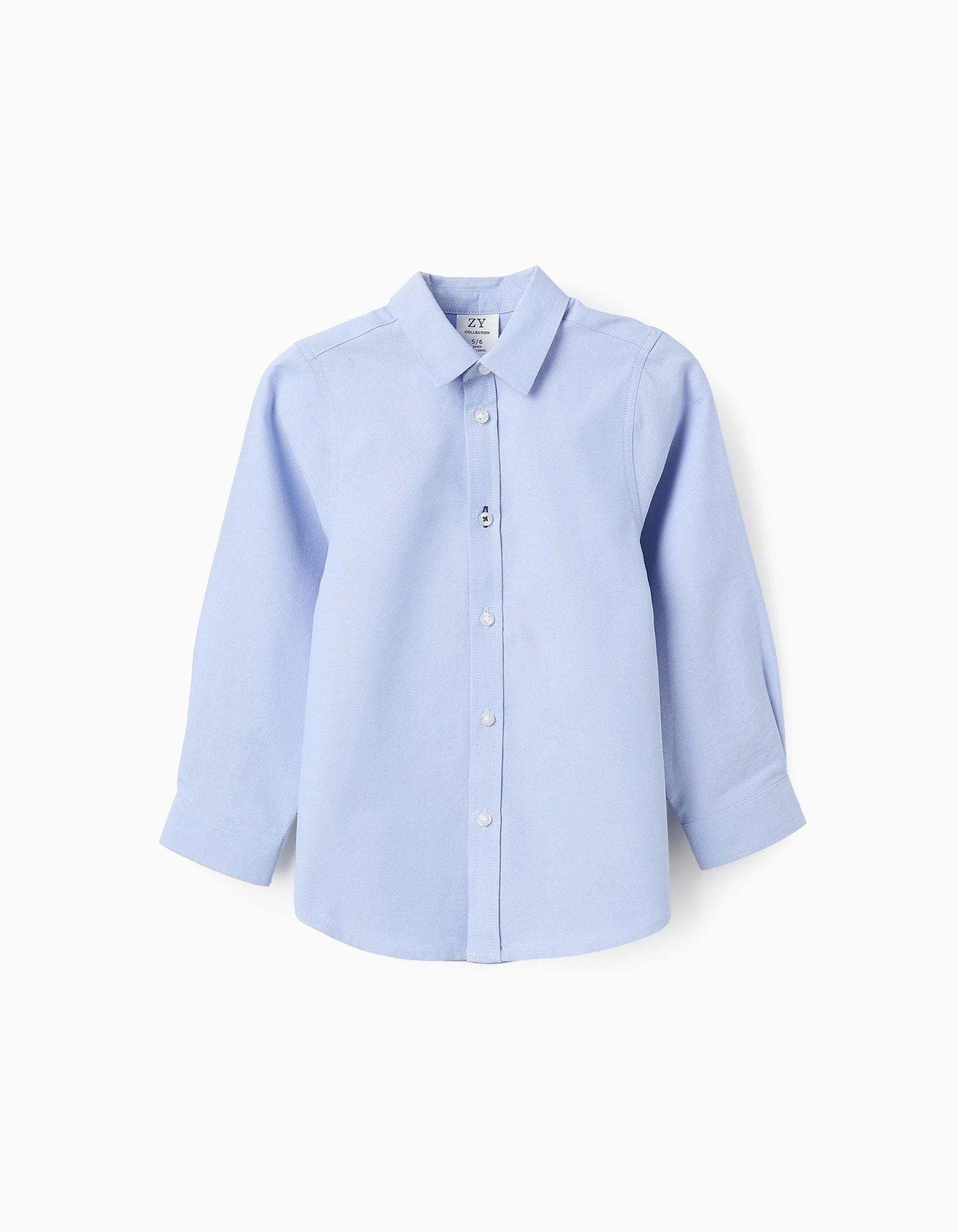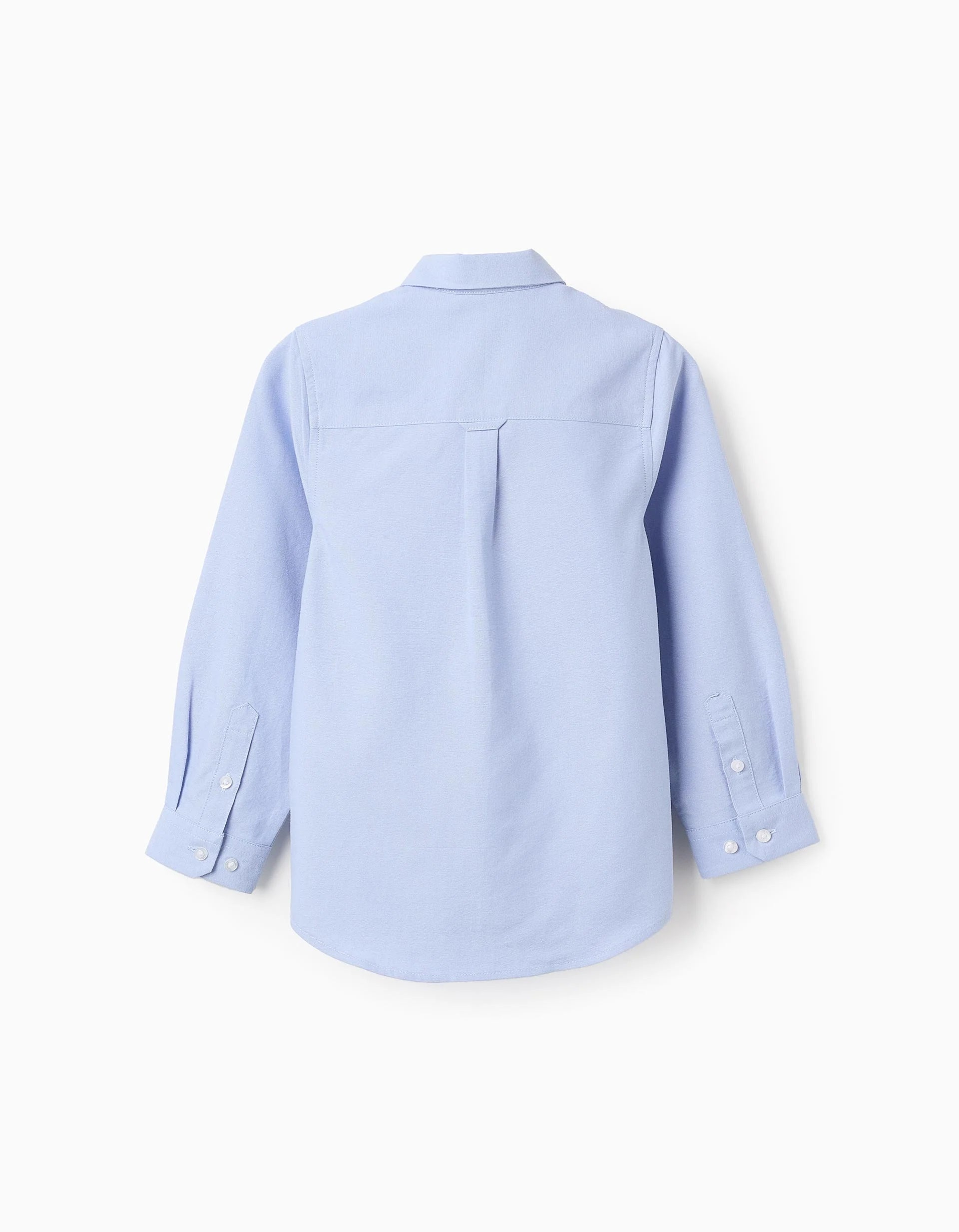 Blue long-sleeved shirt for boys, in 100% cotton Oxford. A classic shirt, perfect for any occasion. Big Me: a button with contrasting thread and buttonhole so the child can easily identify where to start buttoning, promoting their autonomy.