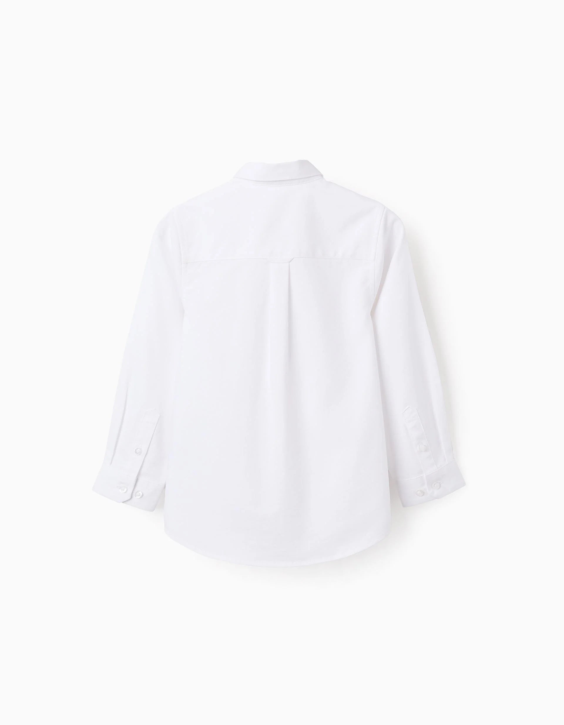 White long-sleeved shirt for boys, in 100% cotton Oxford. A classic shirt, perfect for any occasion. Big Me: a button with contrasting thread and buttonhole so the child can easily identify where to start buttoning, promoting their autonomy.