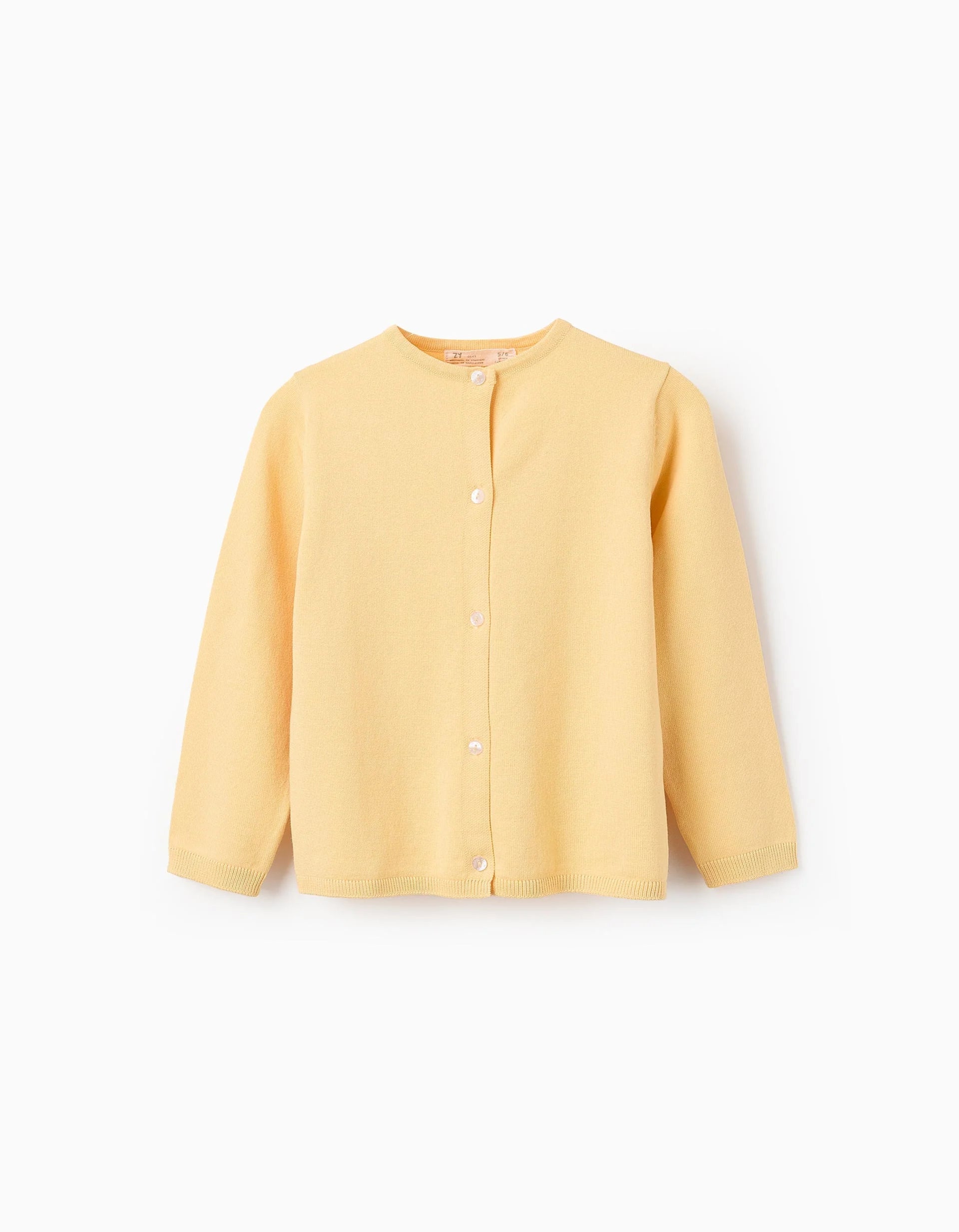 Yellow knitted cardigan for girls, with a classic and timeless design. Mother-of-pearl buttons in contrast. Ribbed edges for a perfect fit.