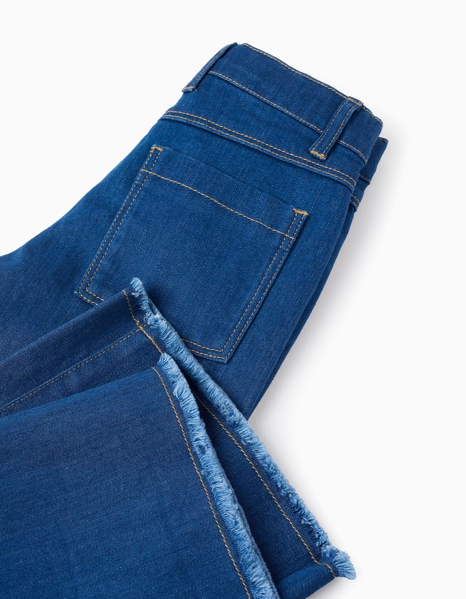 Wide Leg Frayed Denim Trousers for Girls, Blue
