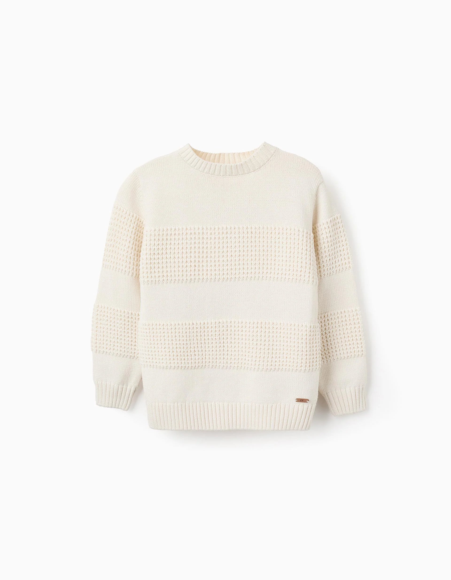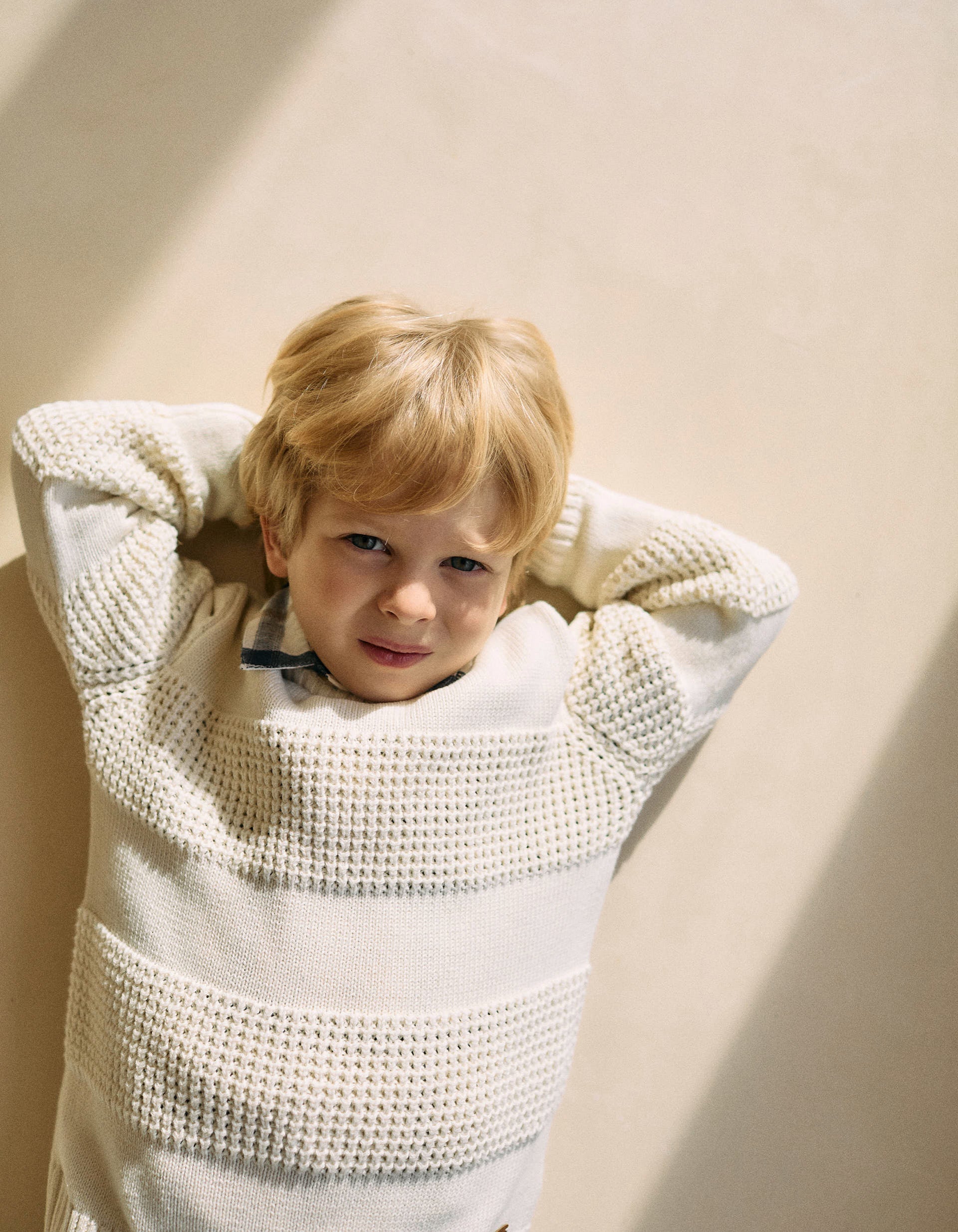 White knitted jumper for boys, 100% cotton. Striped effect with different textures. Ribbed edges for a perfect fit. Soft, comfortable and stylish.