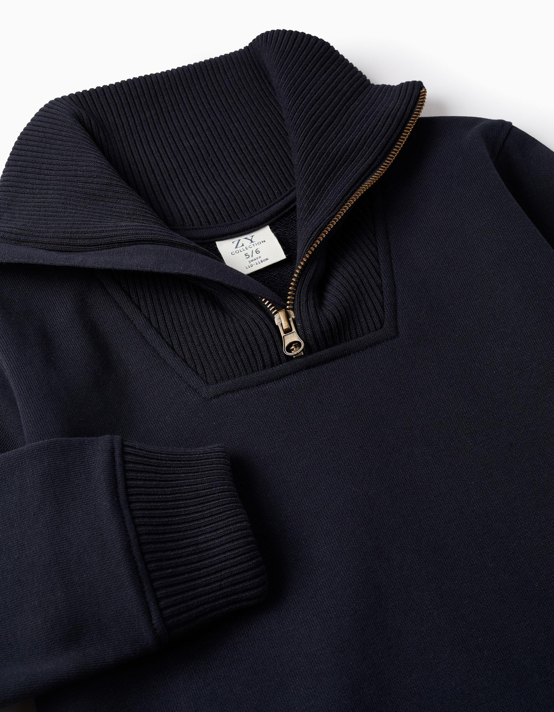 Dark blue sweatshirt for boys, 100% cotton. High collar with zip. Ribbed cuffs for a perfect fit. A sober and elegant sweatshirt.