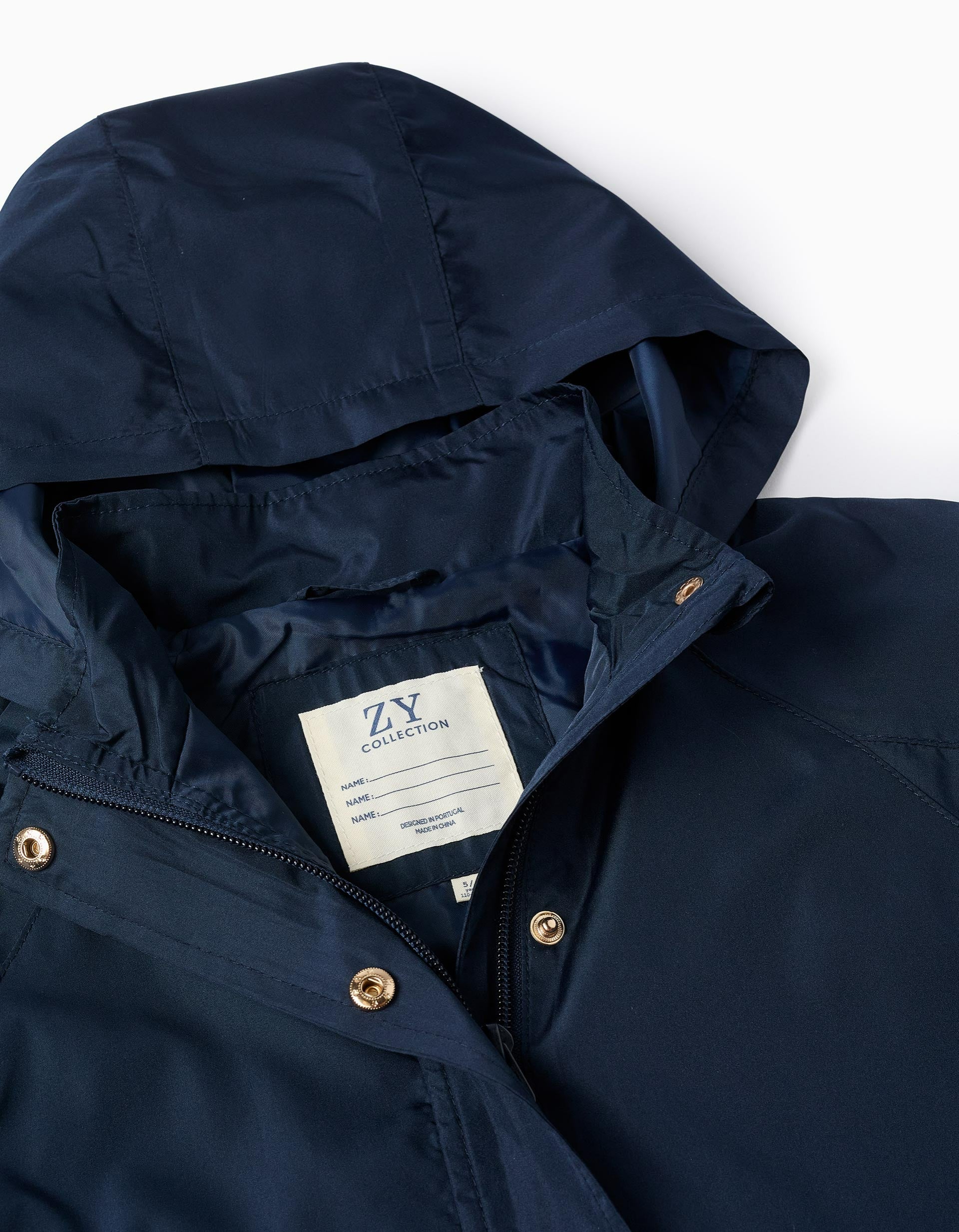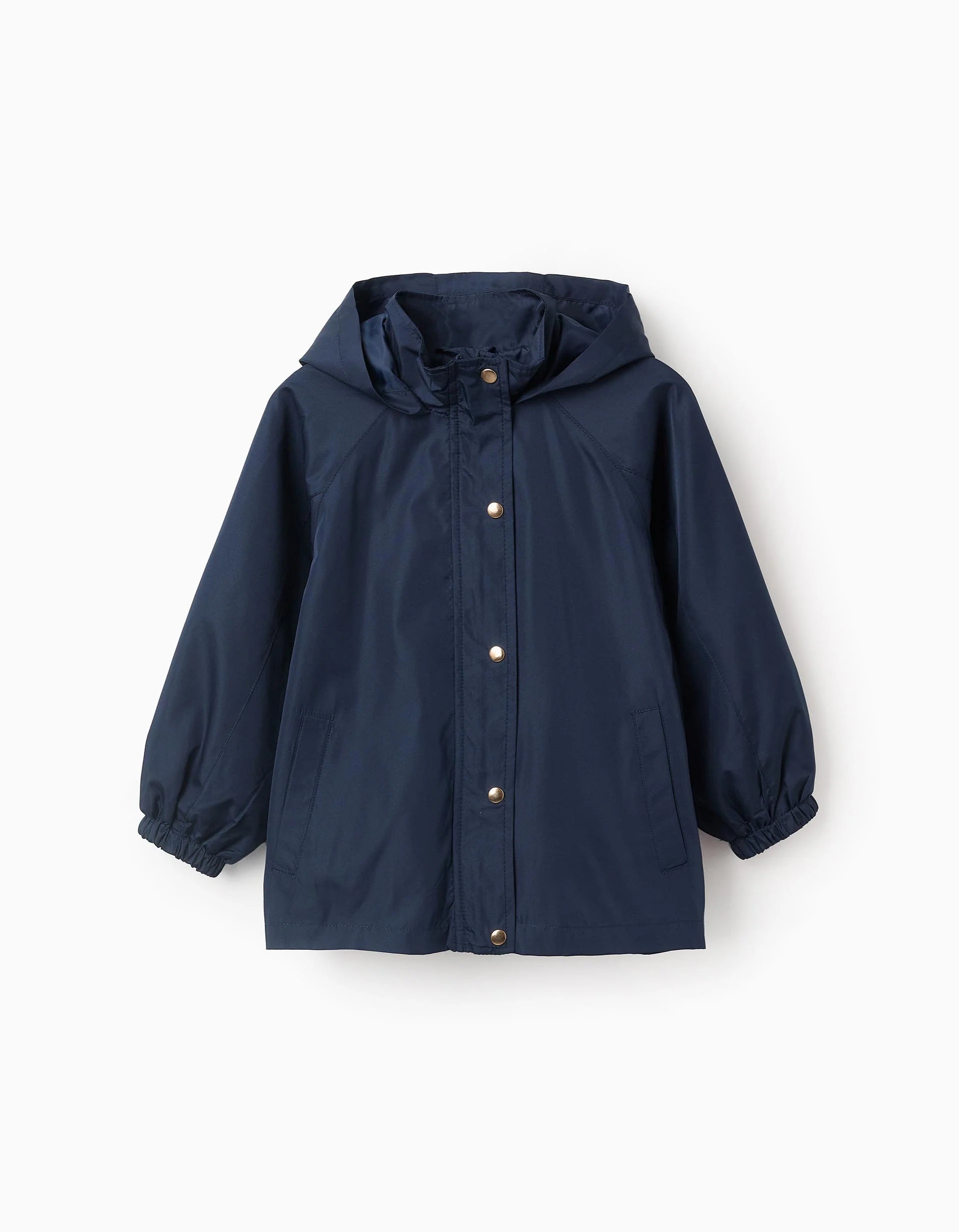 Dark blue windbreaker jacket for girls, with hood. Elastic cuffs for a perfect fit. Zipper and golden snap buttons. Side pockets. Inner label to write the child's name. Lightweight and stylish, it is ideal for the mid-season!