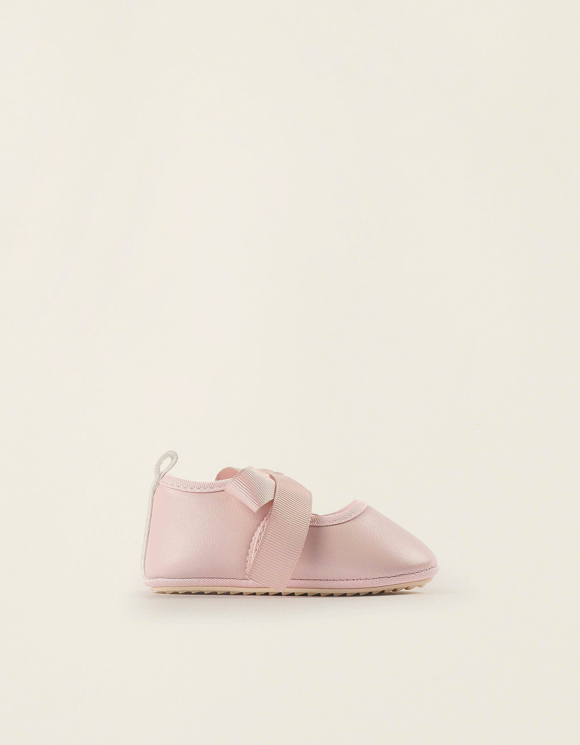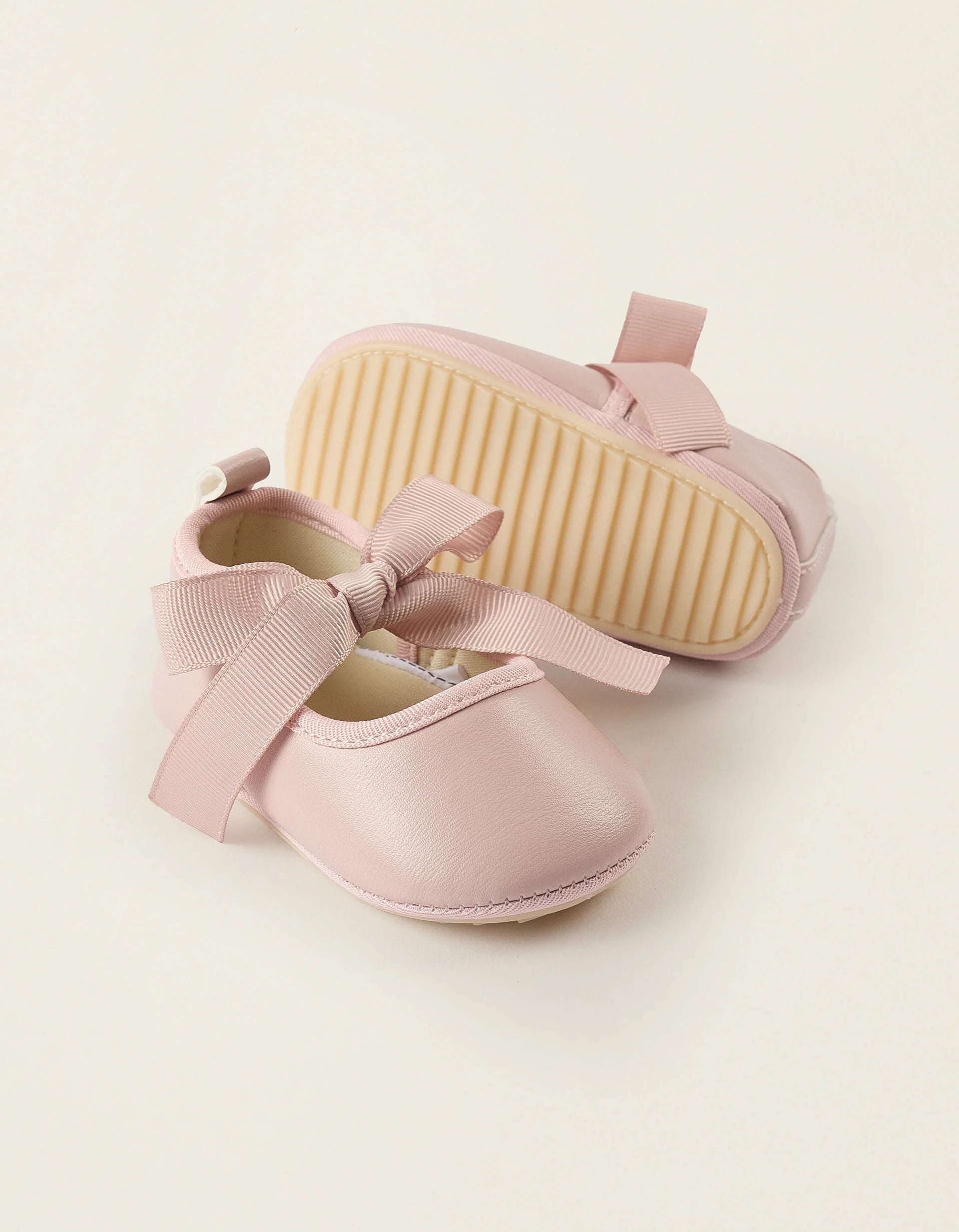 Pink synthetic leather ballerina flats for newborn girls, with satin ribbons to create a bow. Soft textile lining for maximum comfort. Thin, flexible, and non-slip rubber sole. Comfortable footwear with a classic touch.
