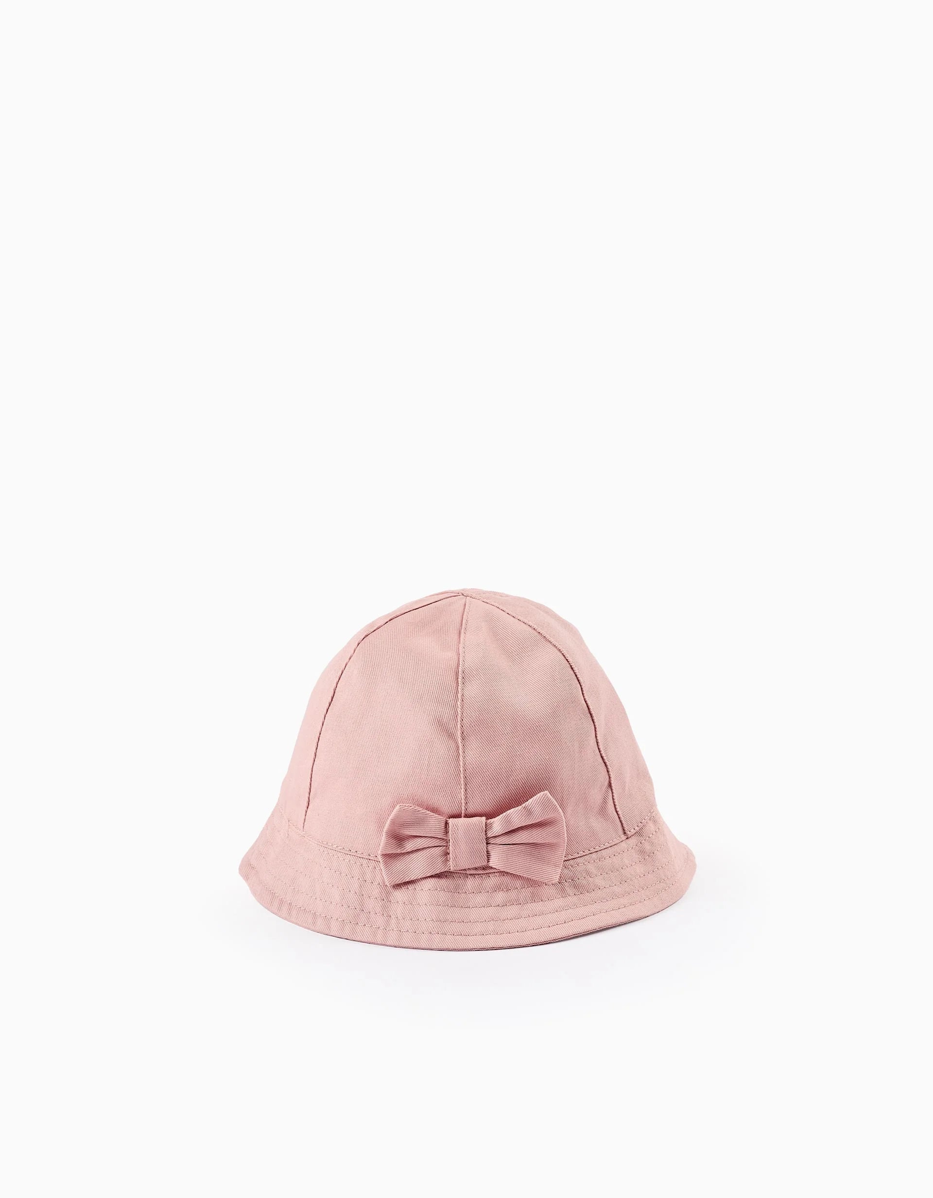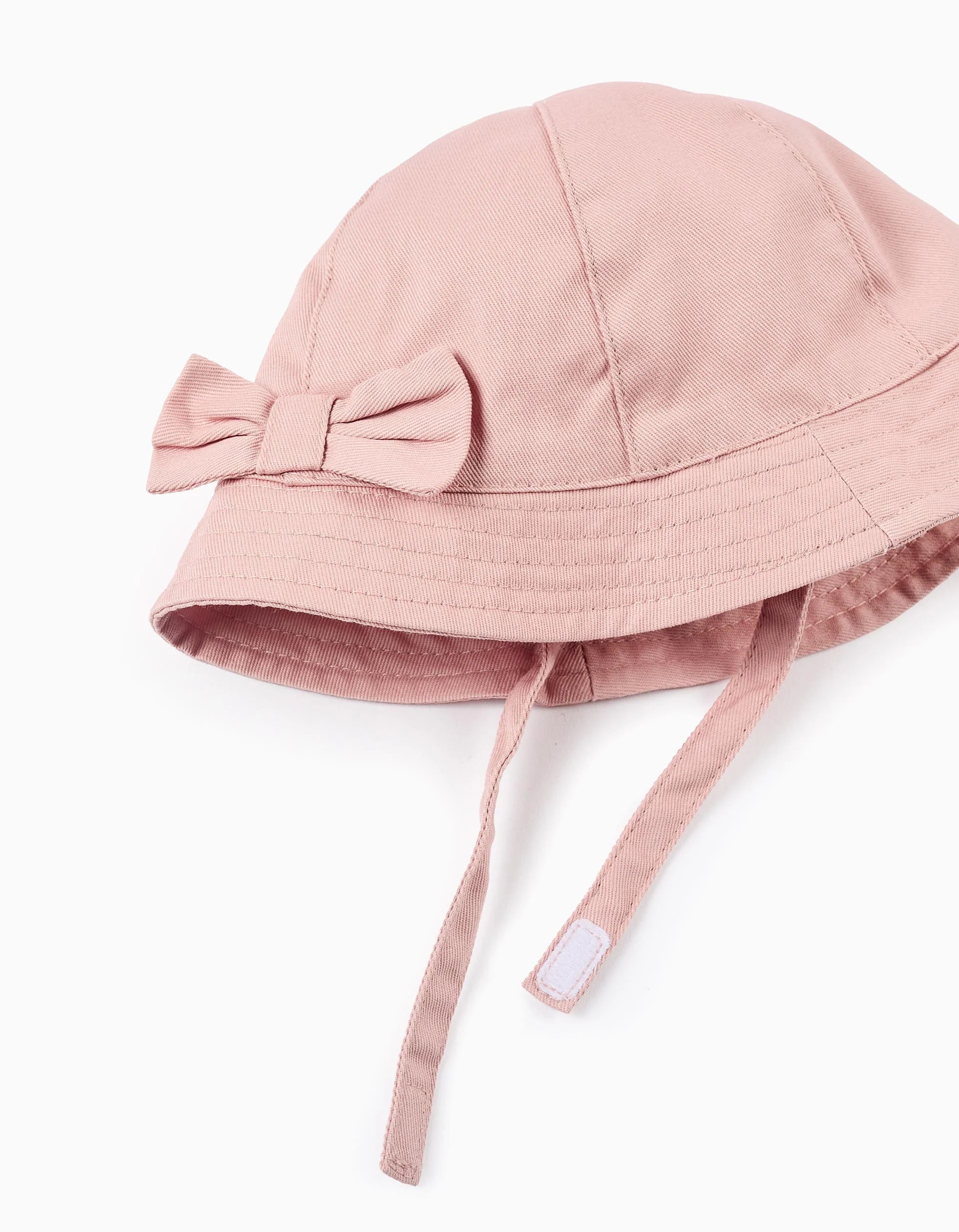 Pink twill hat for babies and girls. Decorative bow. With soft jersey lining. Note: with side straps up to size 18-24M or 48 cm.