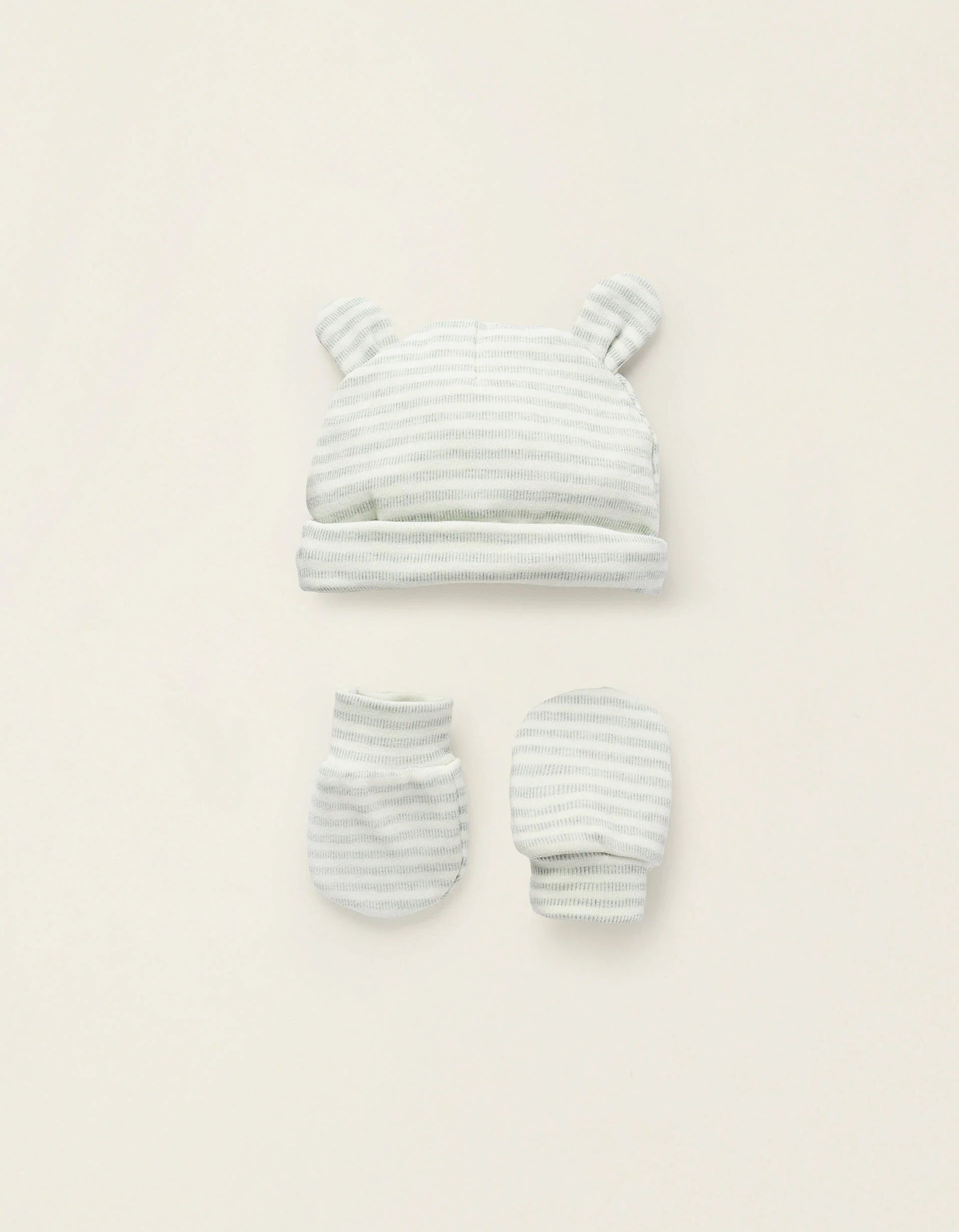 Set of two items for newborns. It consists of a beanie with 3D ears and a pair of mittens. Made of 100% cotton ribbed fabric, with a white and green striped pattern.