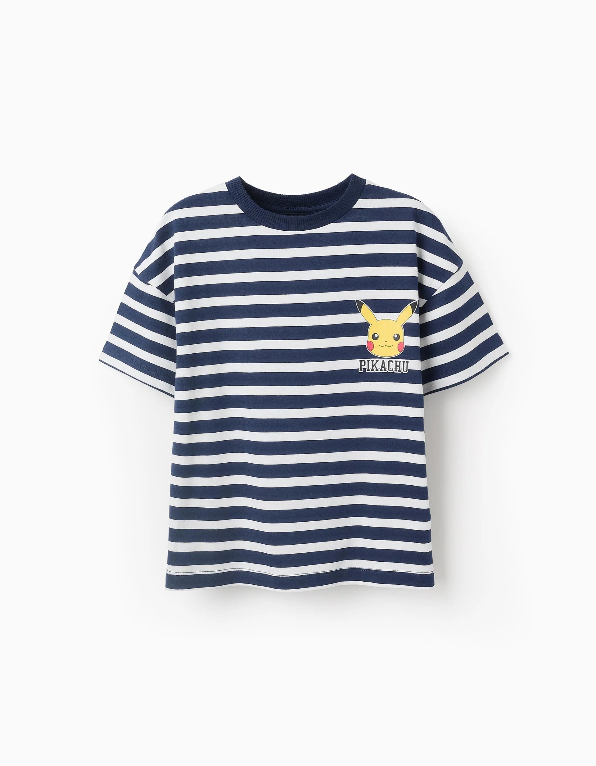Striped white and dark blue t-shirt for boys, with Pikachu print on the chest. 100% cotton. Dropped shoulders for a relaxed fit. For Pokémon characters fans!
