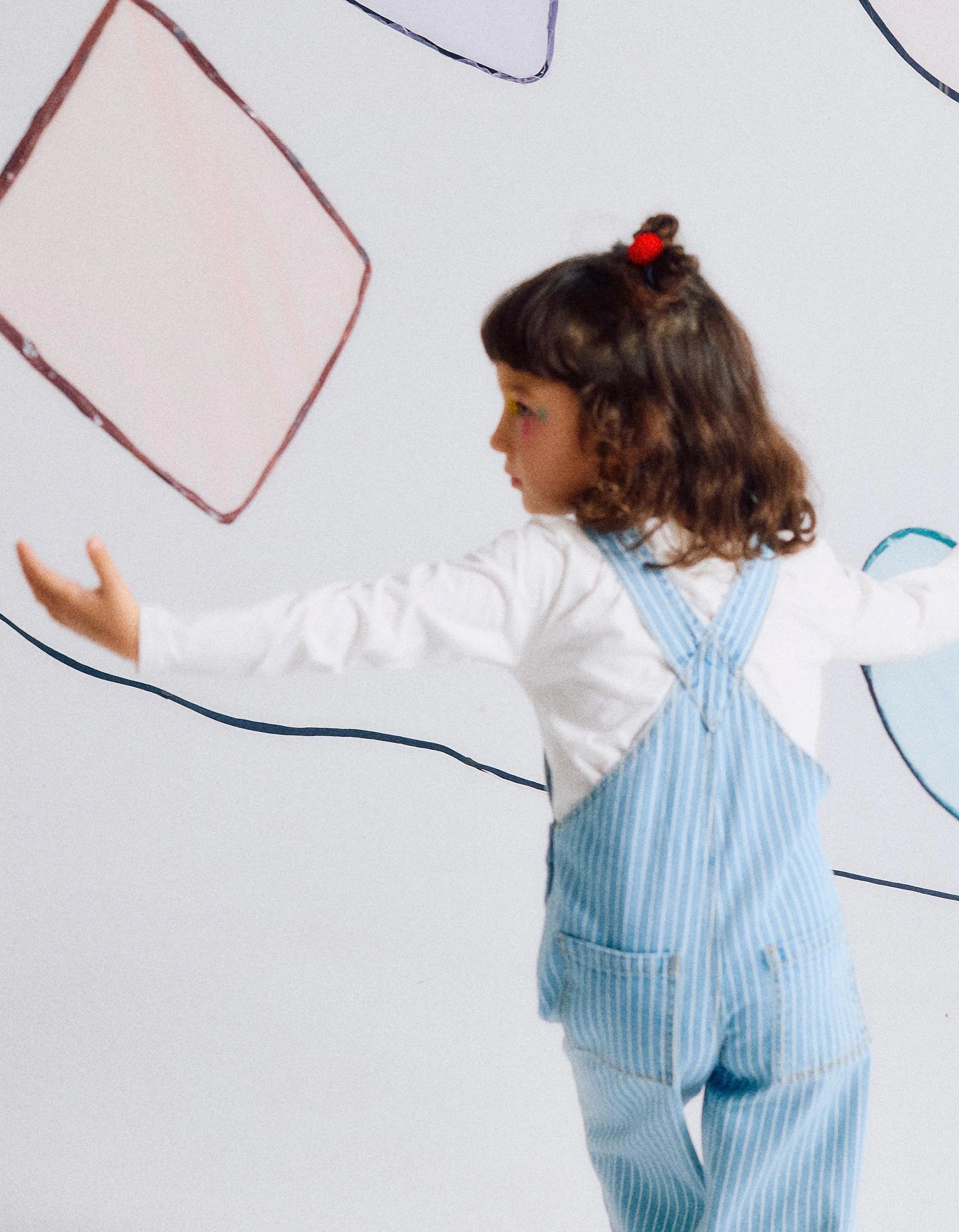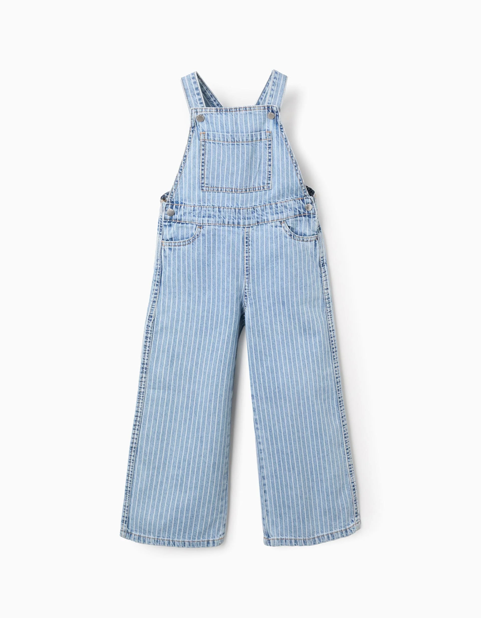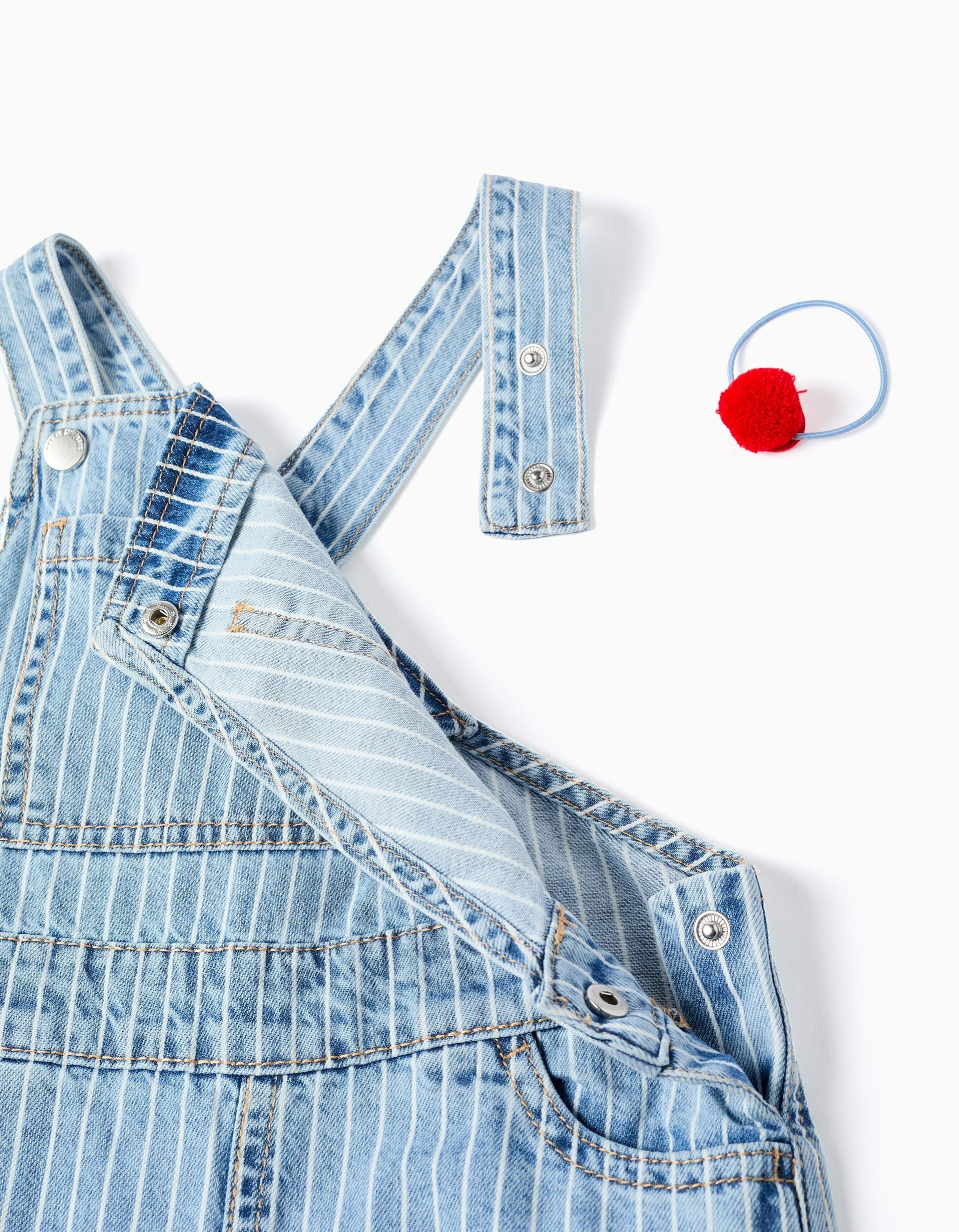 Girl's blue denim dungarees with white stripes, 100% cotton. Wide leg fit, for greater freedom of movement. Five pockets, one of which is on the chest. Adjustable straps with silver press studs. Includes a hair bobble with a red pompom to use as a prop. For trendy and original looks!
