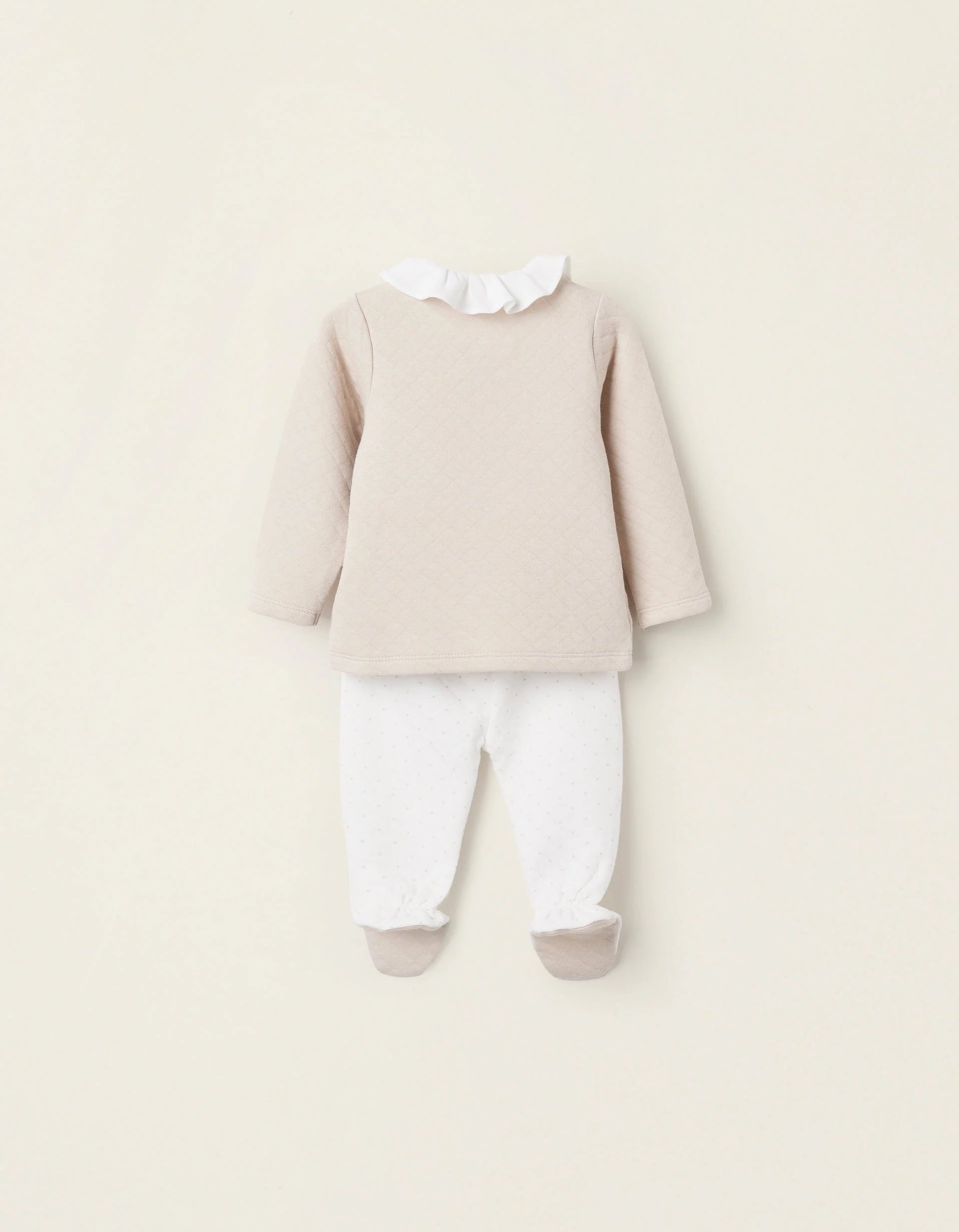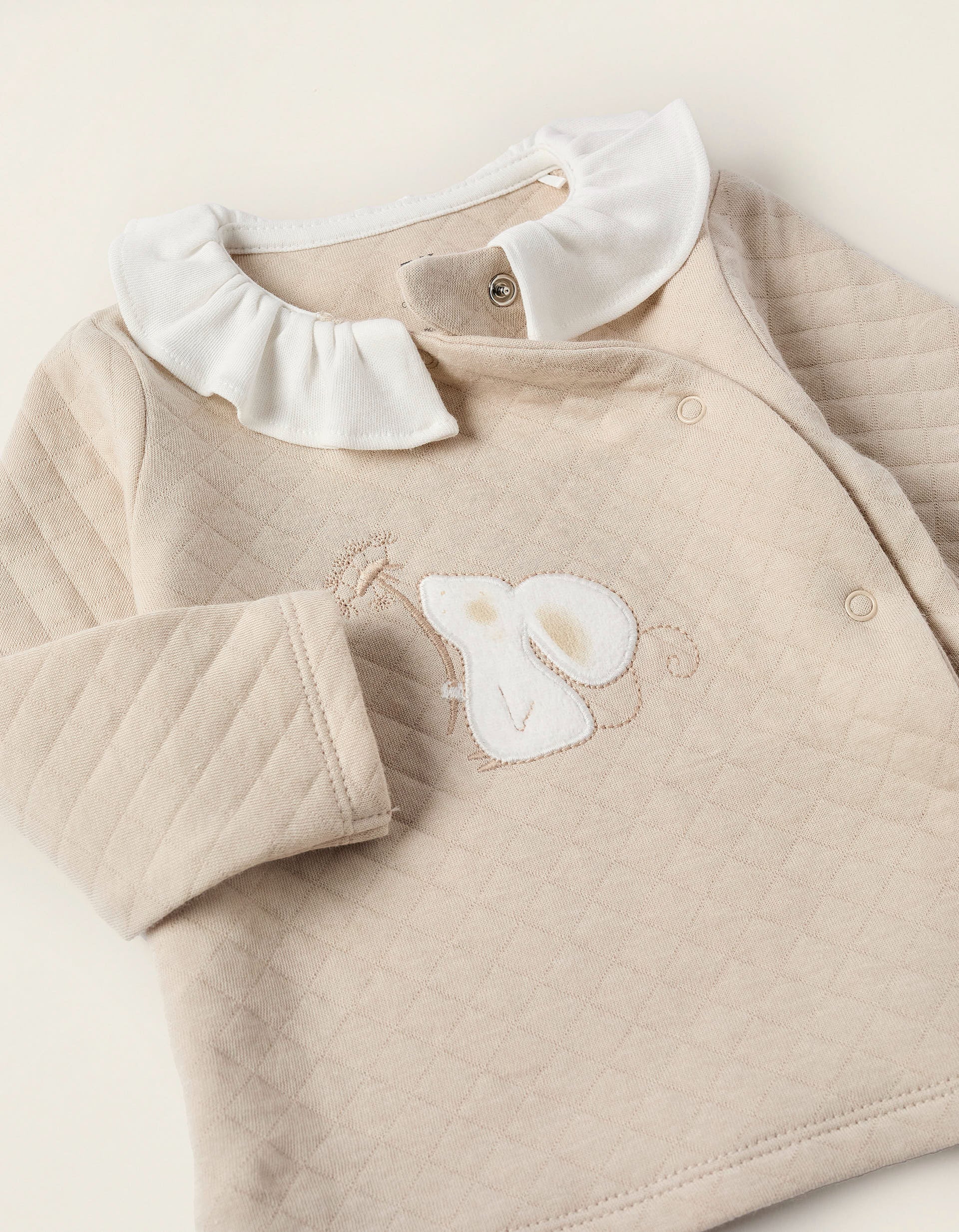Two-piece set for newborn girls, with quilted texture. Made of cotton with a touch of stretch for greater comfort and freedom of movement. It consists of a sweatshirt with frilled collar and front embroidery of a mouse and a dandelion. Side snap fasteners for easy dressing. It also includes a pair of white trousers with a polka dot pattern. The two pieces can be transformed into one, through an application with snap fastener at the base of the sweatshirt and at the waist of the trousers that ensures the union of the pieces, preventing colds. Printed inner labels to avoid irritating the skin. A practical set for everyday wear!