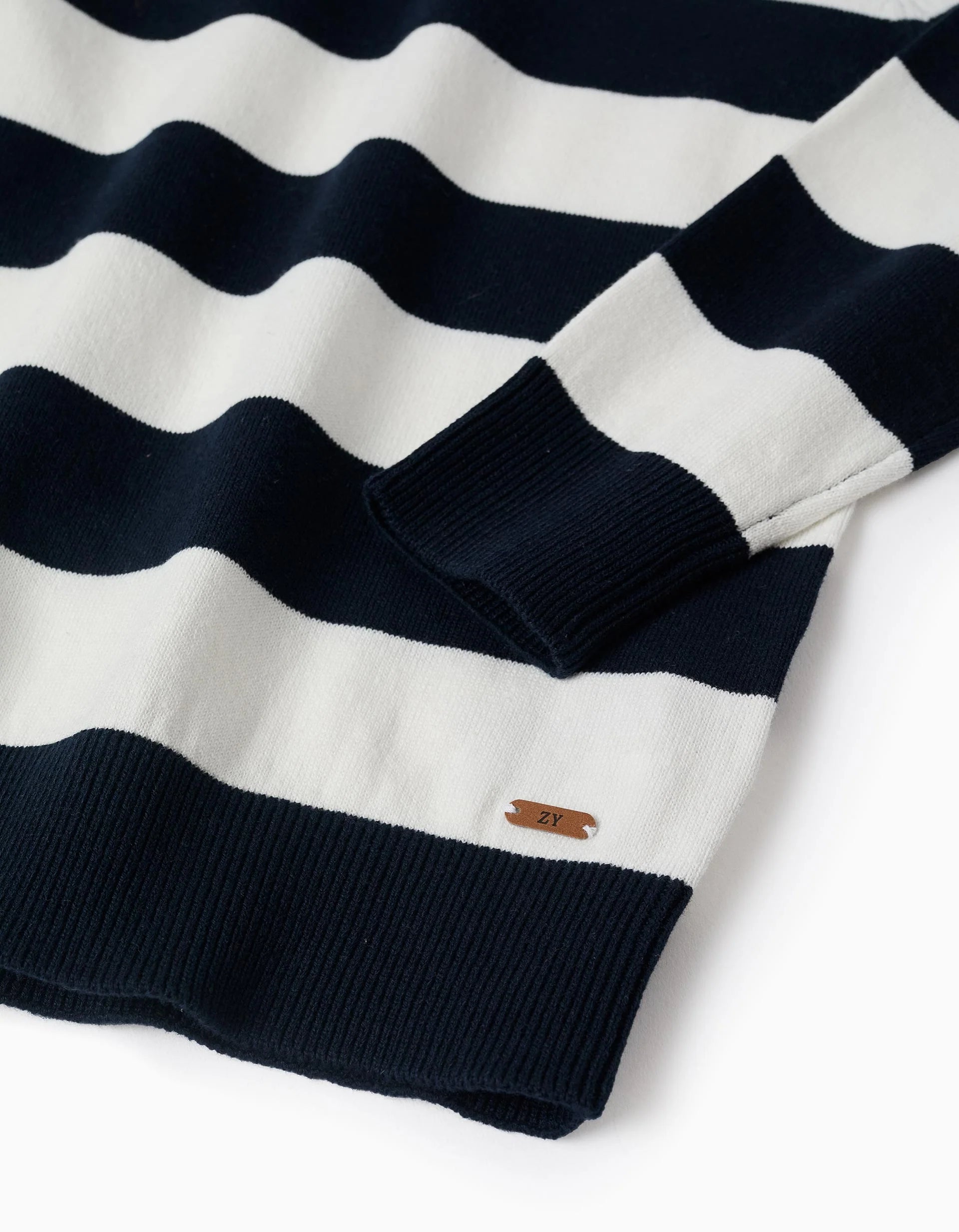 Fine knitted jumper for boys, made from a cotton blend. Striped pattern in white and dark blue tones. Ribbed edges for a perfect fit. A versatile and timeless option!