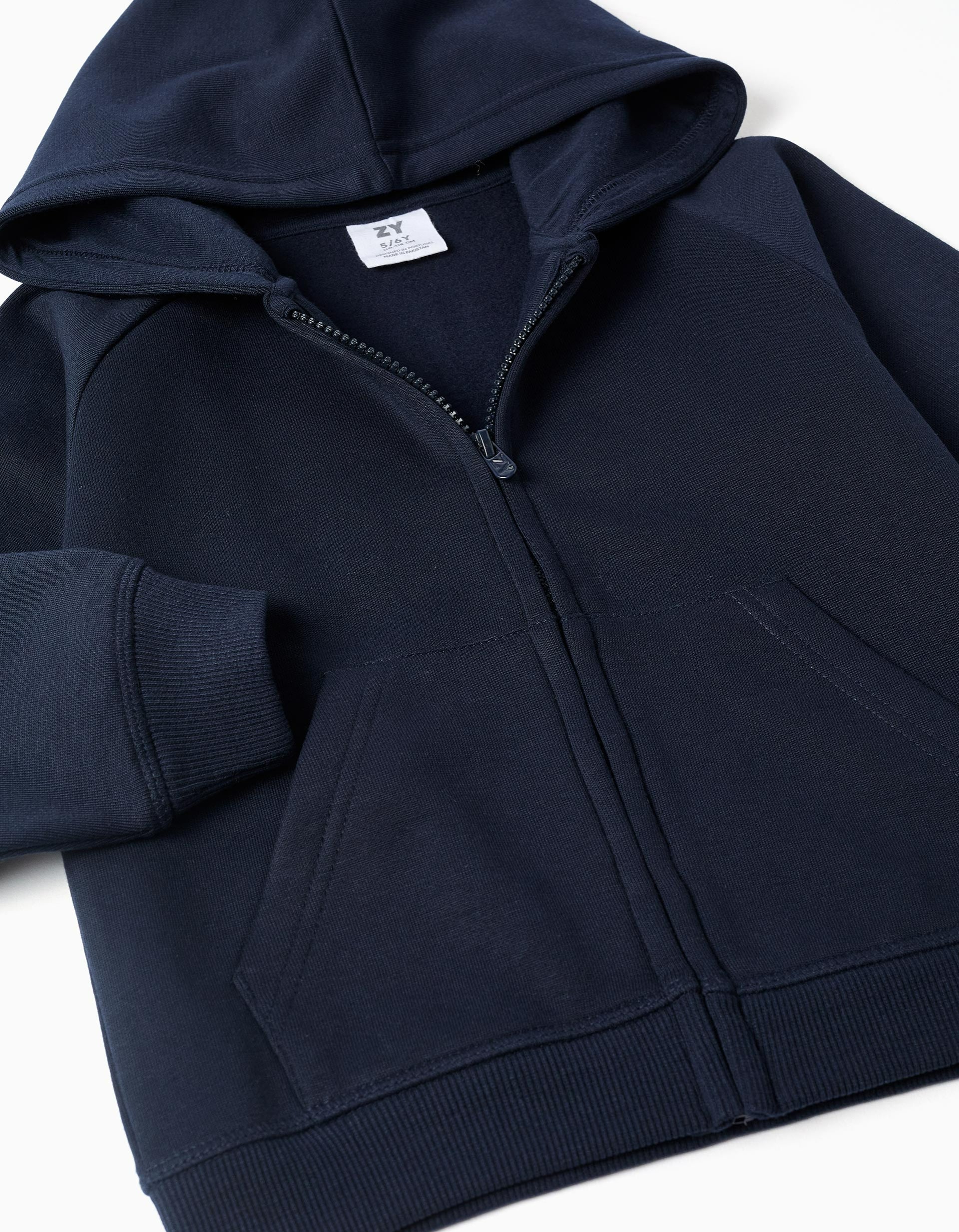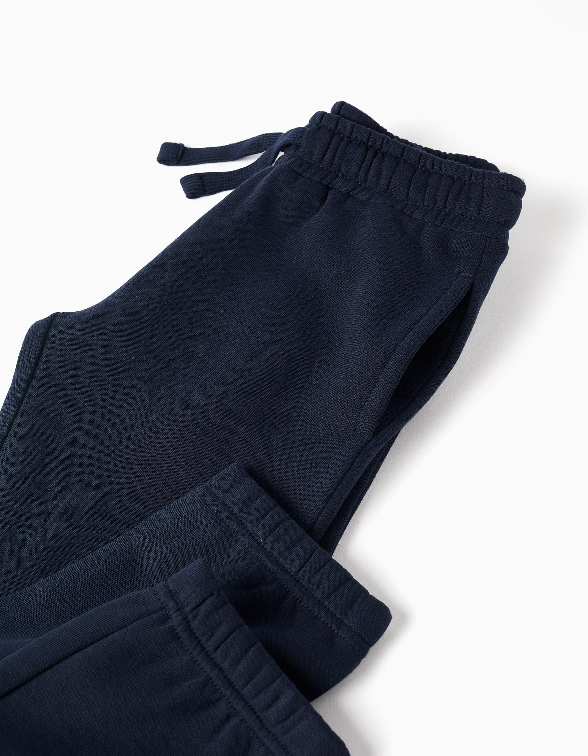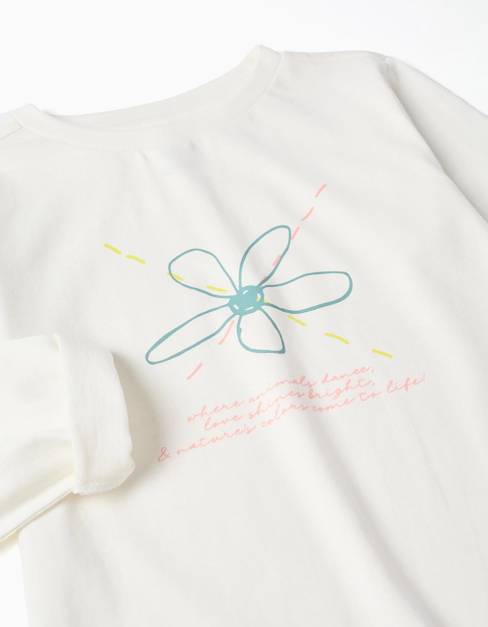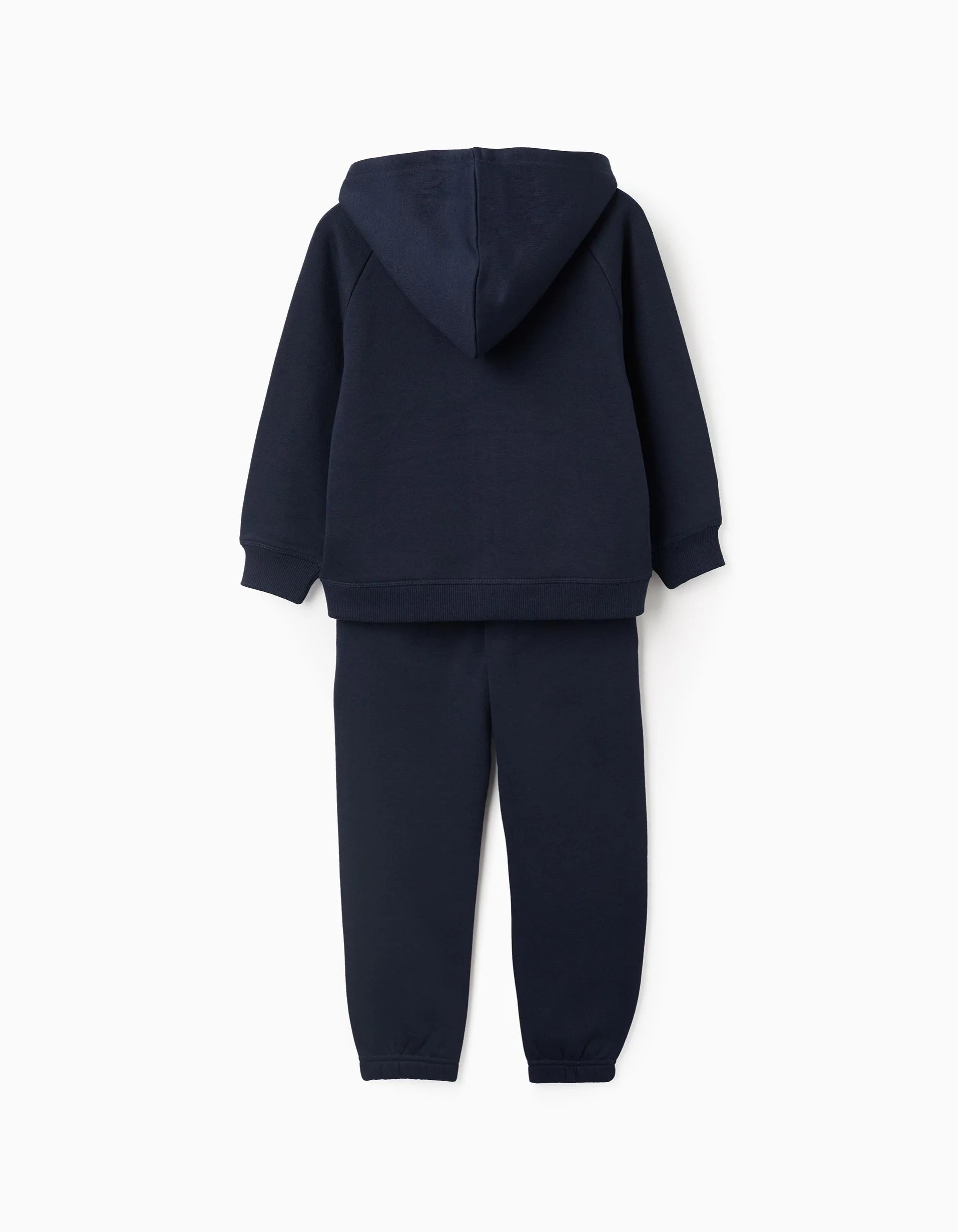Three-piece set for girls. It includes a dark blue hooded jacket, with a kangaroo pocket and front zip-fastening; a pair of dark blue joggers with pockets and a drawstring. Both in a cotton blend, brushed interior for greater thermal comfort, and with ribbed elastic edges, for a perfect fit. It also includes a white long-sleeved T-shirt, with a front print of a flower. 100% cotton. The perfect set for school activities! We Care: Oeko-Tex Standard 100 certified item, which guarantees the absence of substances that are harmful or irritating to the skin.