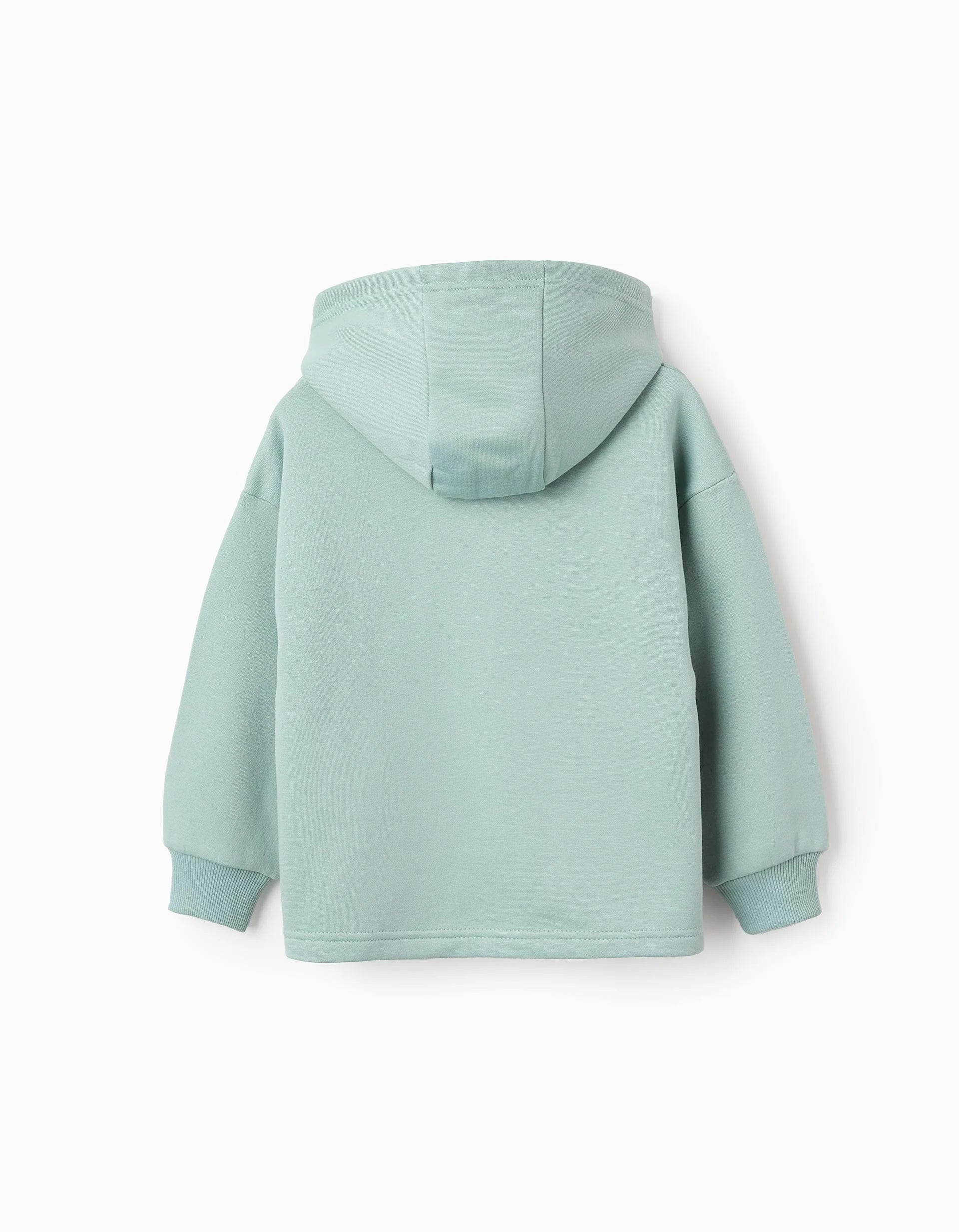 Brushed aqua green hooded sweatshirt for girls, with front print and details in relief. Dropped shoulders for a more relaxed fit. Ribbed cuffs for a perfect adjustment. Fluid effect, for an urban and relaxed style! We Care: article with Oeko-Tex Standard 100 certificate, which guarantees the absence of harmful or irritating substances for the skin.