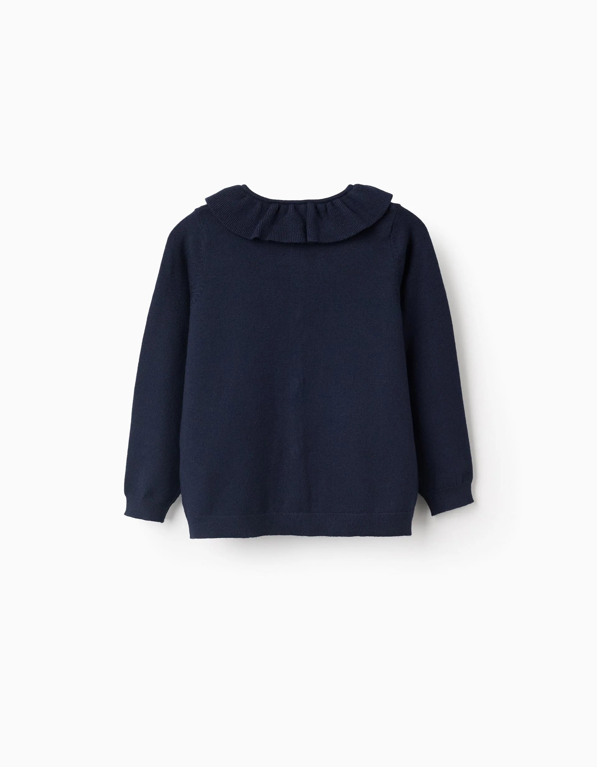 Dark blue fine knit cardigan for girls. Round neck with frills. Ribbed edges for a perfect fit. Contrasting buttons. A soft, comfortable and versatile option.