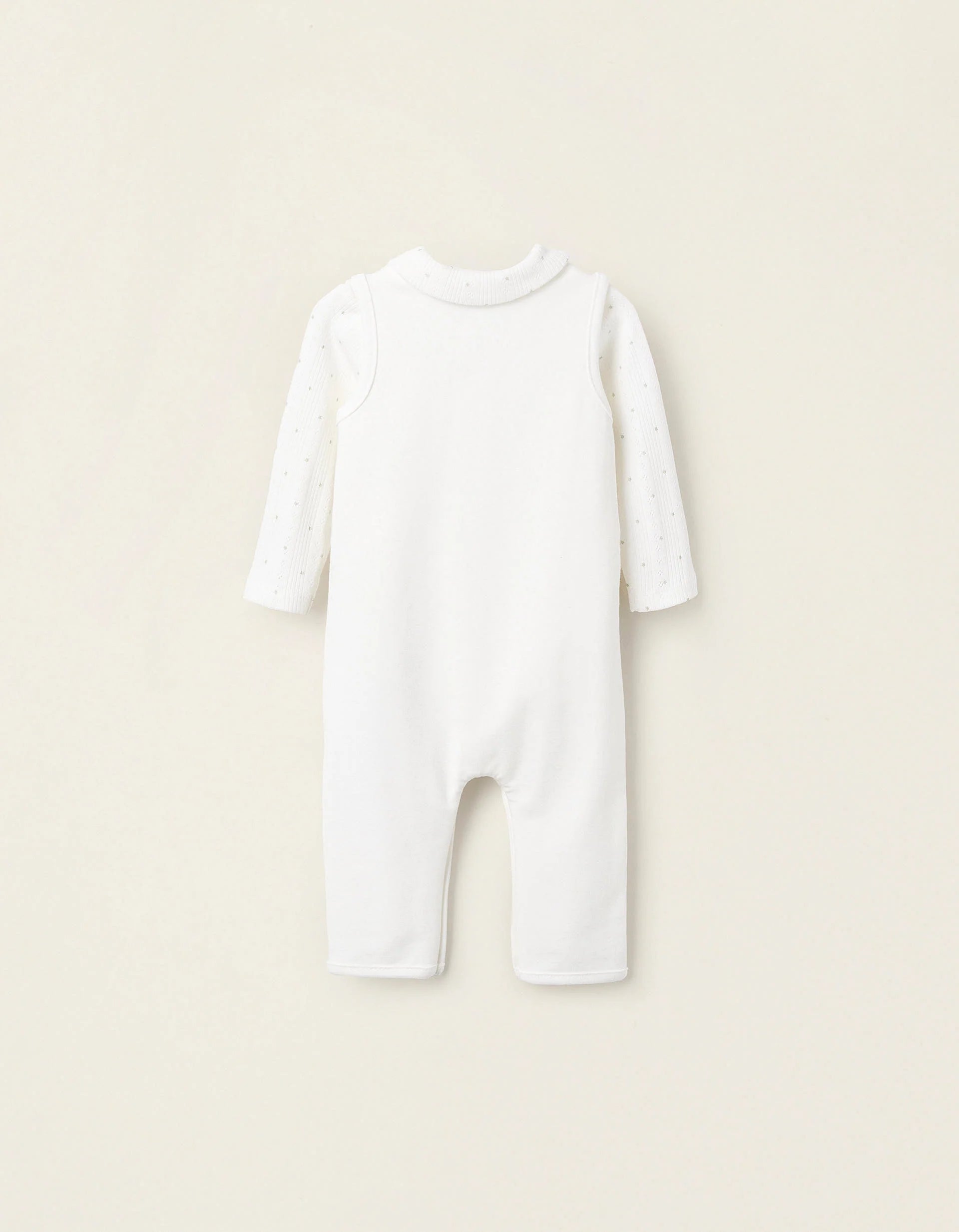 Two-piece set for newborn girls. It consists of a ribbed white bodysuit in pointelle cotton with star motif; and a plain white jumpsuit with small front print, with snap buttons on the shoulders, sides and crotch for easy dressing, with a coloured button as a reference for dressing. A soft and comfortable set, ideal for wearing as underwear.