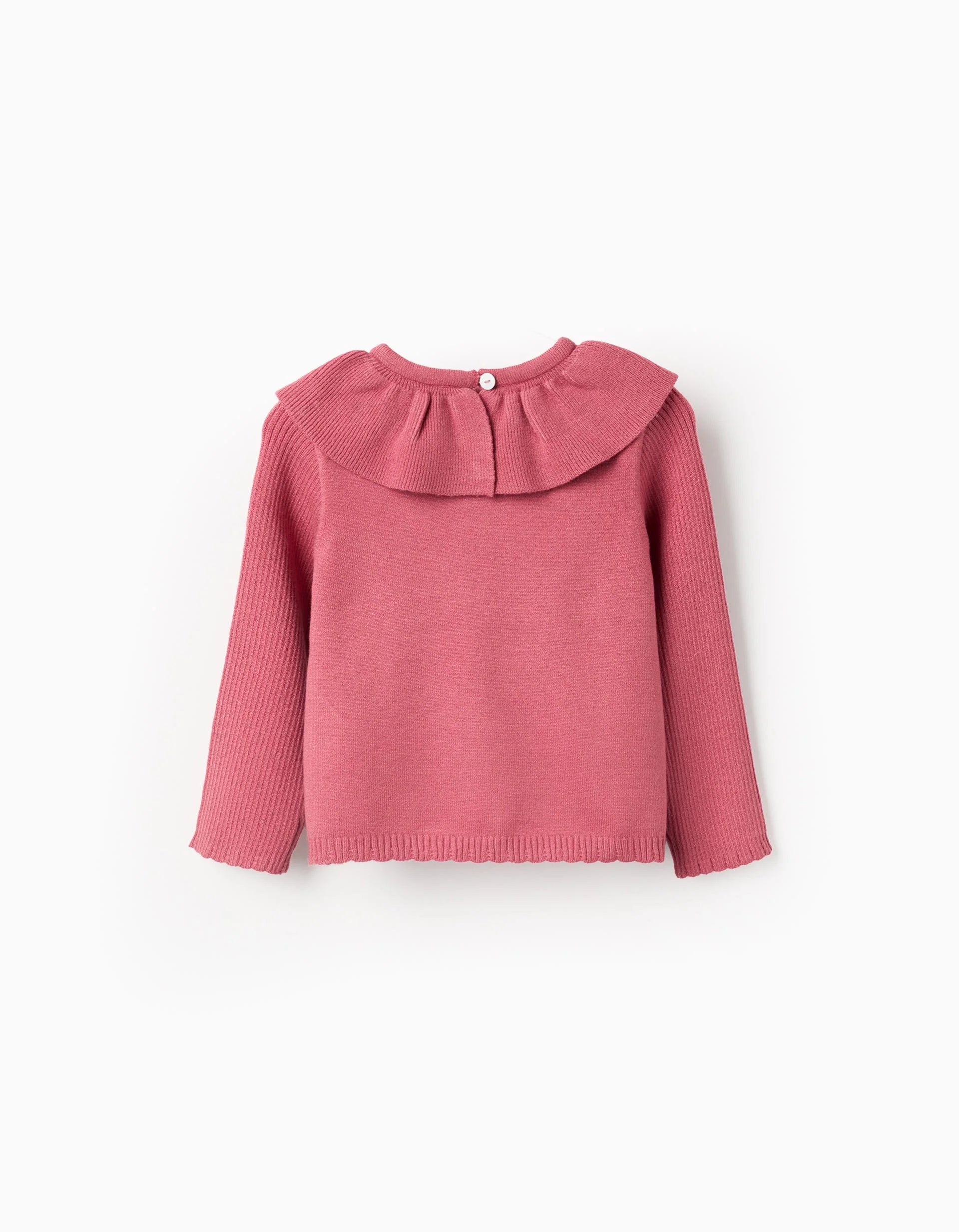 Pink knitted jumper for baby girls, soft and flexible. Ruffled collar. Button at the back for easy dressing. Ribbed sleeves. Wavy cuffs and hem. A wardrobe essential, versatile and timeless!