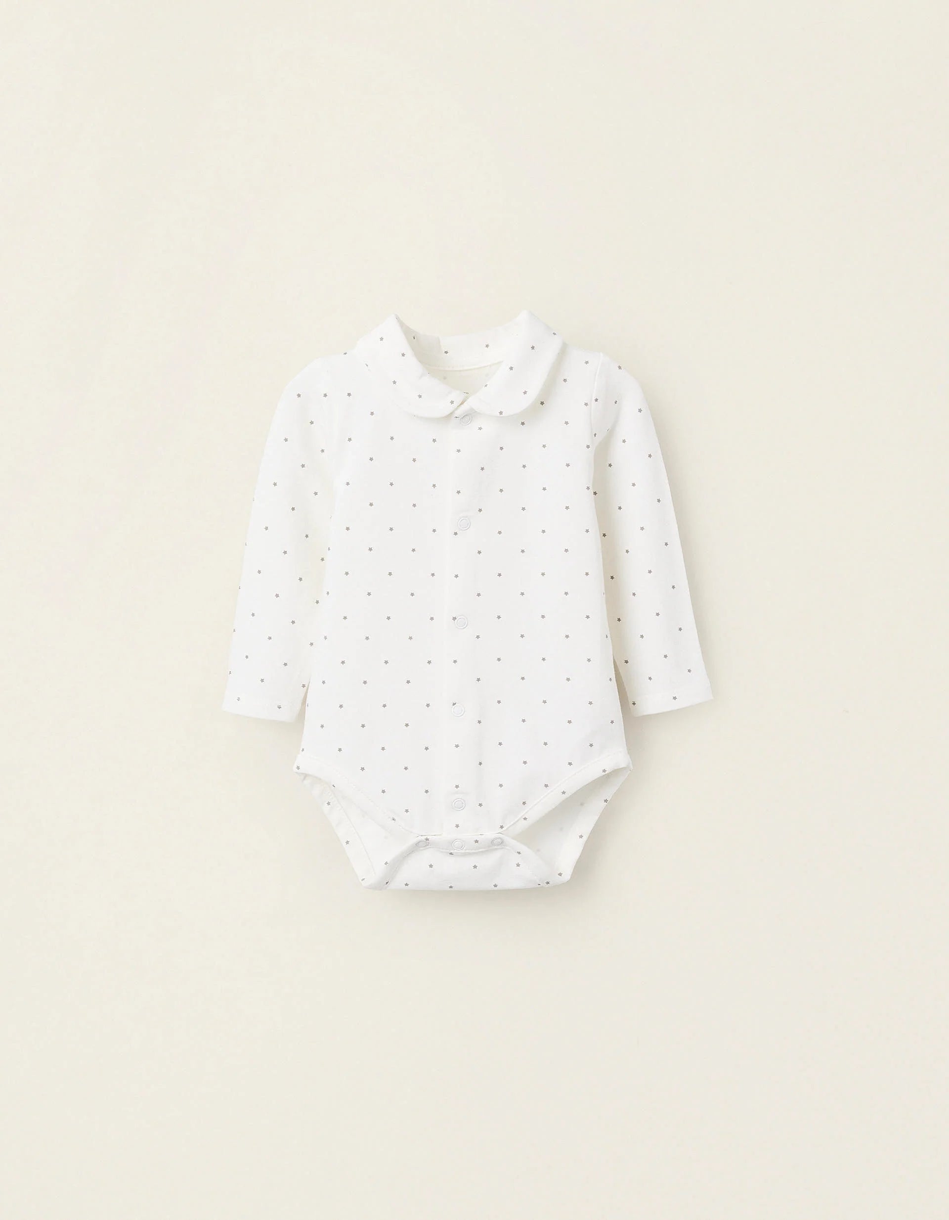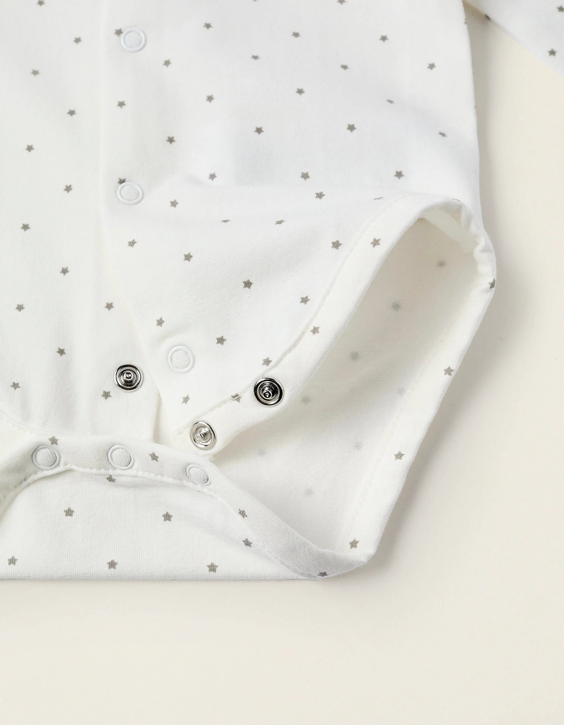 White newborns bodysuit, in cotton with a touch of stretch for greater comfort and freedom of movement. Peter Pan collar and star motif. Front and crotch touch fastener for easy dressing. Printed inner label to not irritate the skin. A soft and comfortable bodysuit.