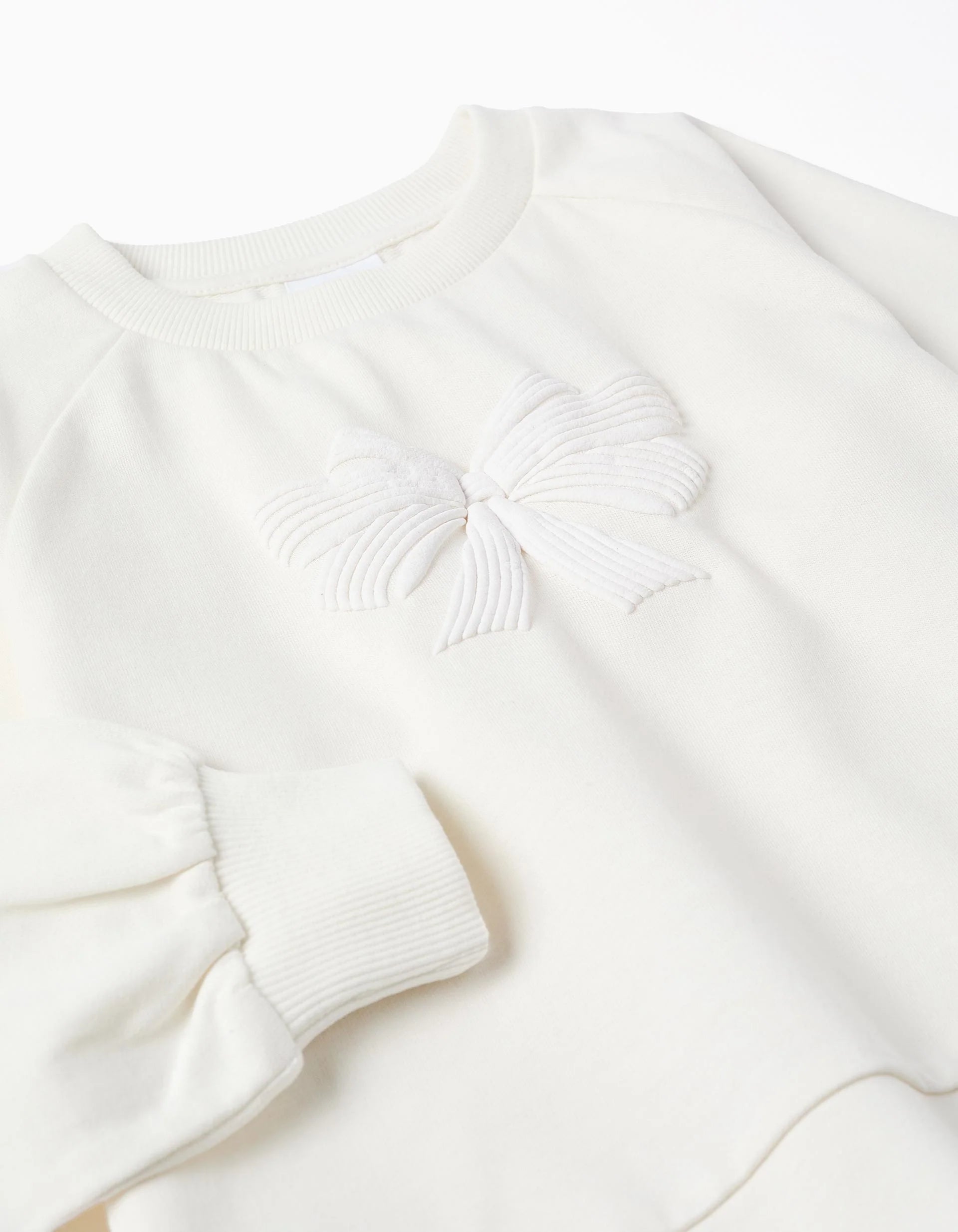 White sweatshirt for girls, in a cotton blend, for a soft and comfortable touch. Embossed bow print. Ranglan sleeves. Ribbed edges, for a perfect fit. Side vents at the base. Asymmetrical hem with slightly longer back. A comfortable sweatshirt ideal for family outings!