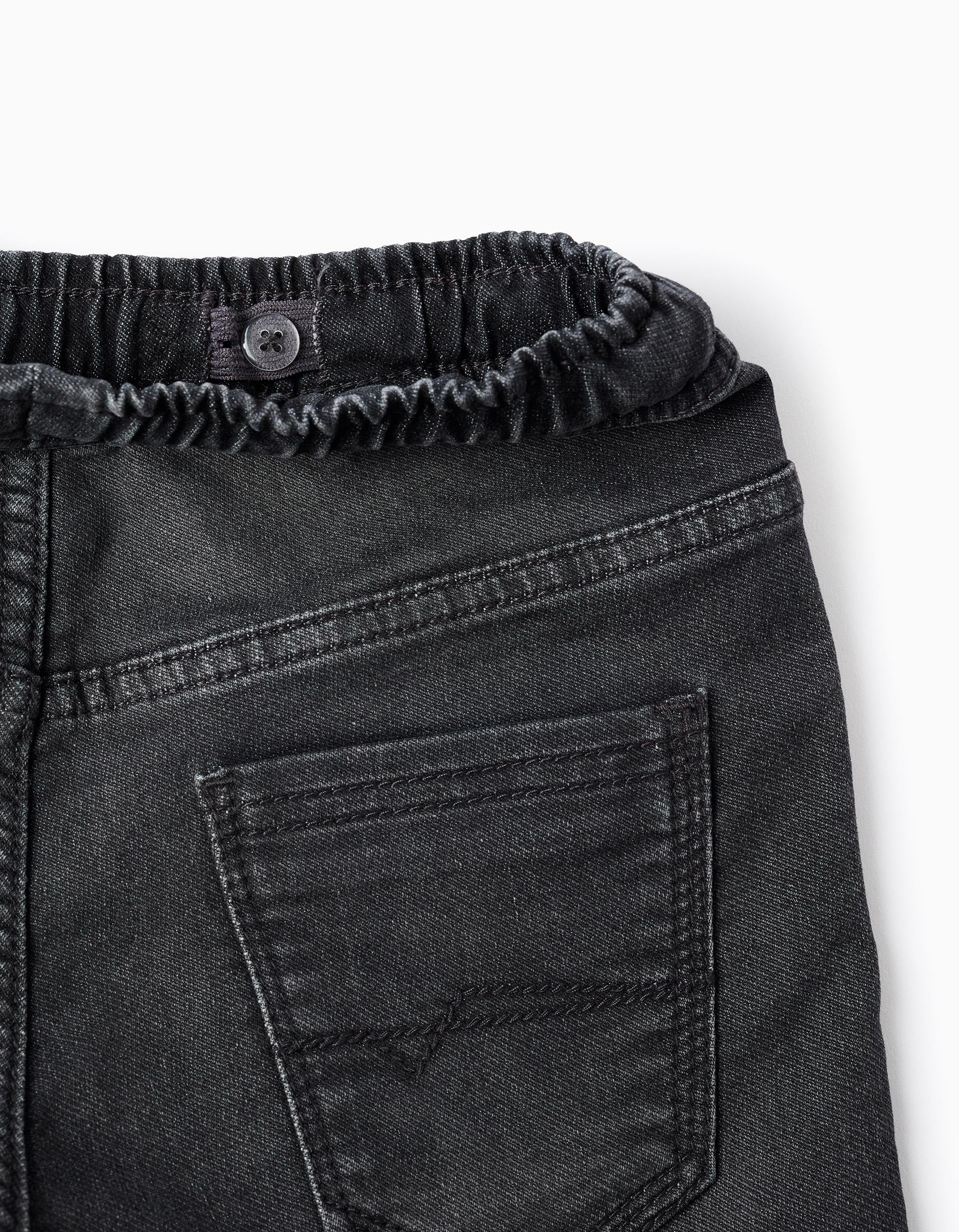 Grey jeans for boys, slim style joggers. Made from cotton-blend denim with a touch of stretch for greater comfort and freedom of movement. Elasticated waistband, adjustable on the inside and with a contrast drawstring on the outside. Five pockets. Folding hems. The versatility of jeans with the comfort of sweatpants in one piece.