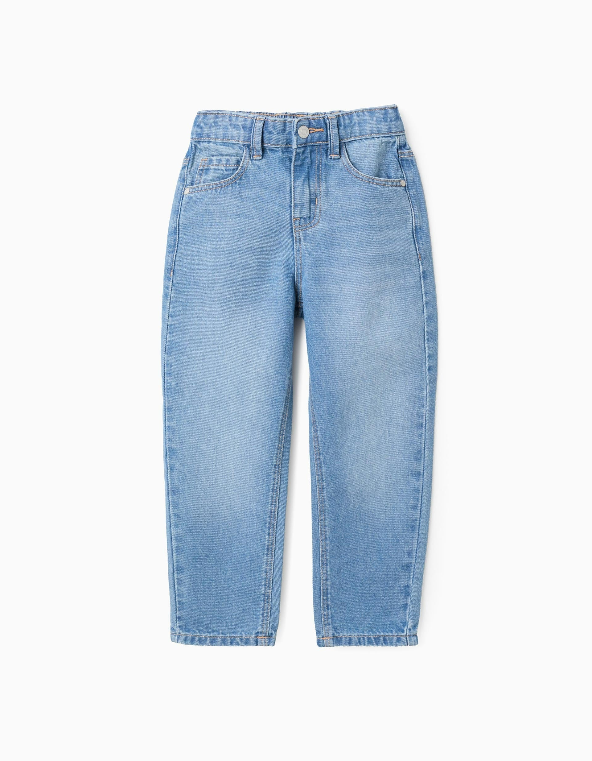 Blue denim trousers for boys, 100% cotton, baggy fit. Elasticated waistband at the back, adjustable on the inside with elastics and buttons. For trendy and casual looks!