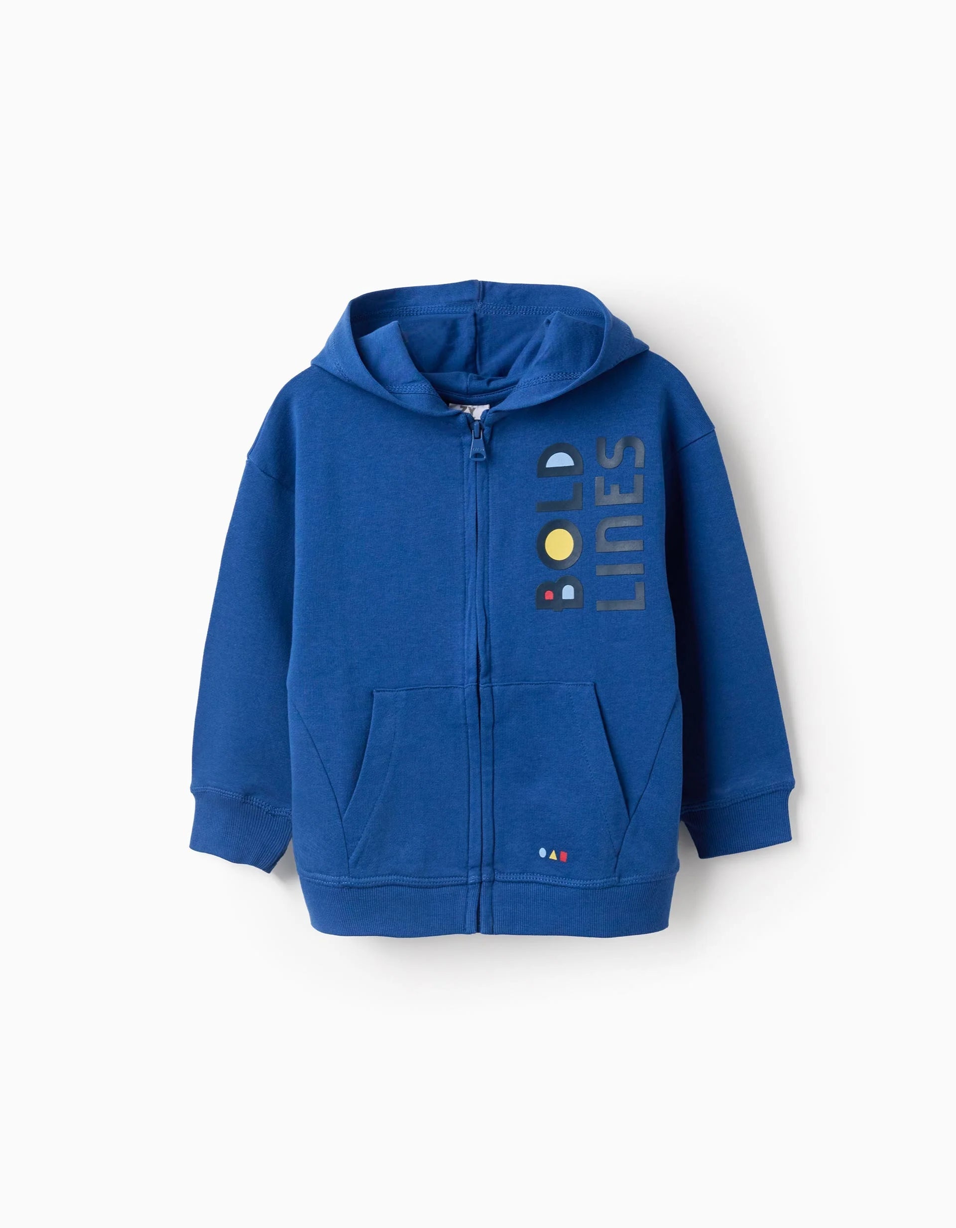Blue hooded jacket for boys, 100 % cotton. Colourful prints on the chest and back. Kangaroo pockets. Ribbed edges for a perfect fit. For an urban look with colour and style!