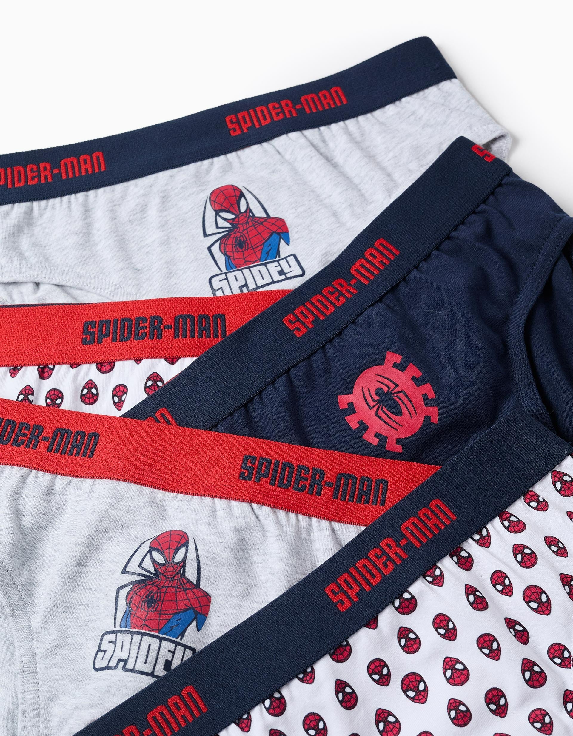 Pack of five briefs for boys, in cotton with a touch of elastane for greater comfort and freedom of movement. Includes briefs in shades of dark blue, white and grey, all with Spider-Man motifs and prints. Waist with elastic band for a perfect fit. Practical and versatile, perfect for ensuring daily comfort.